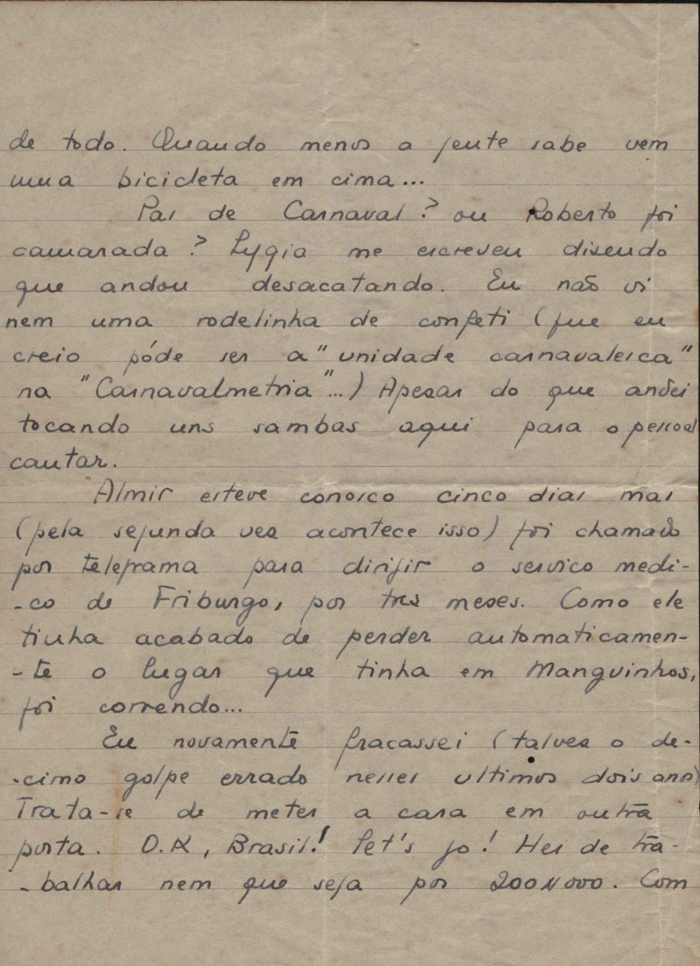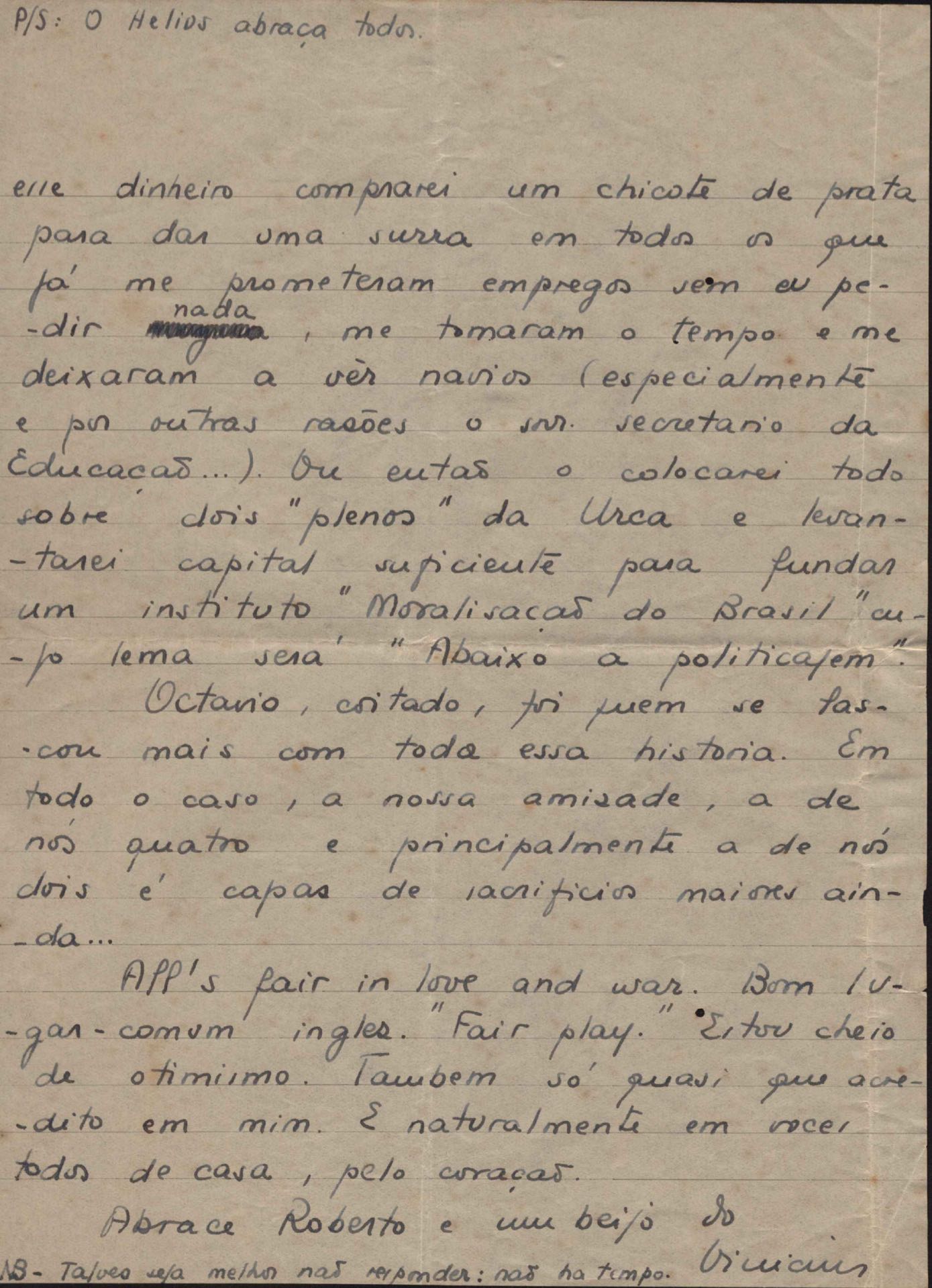 Notícias sobre a vida familiar. Considerações a respeito de pendências a serem resolvidas por VM. Comentário sobre a vida particular de seu irmão, Helius, e sobre a crise nos EUA durante a Guerra Fria. Felicitações pelo aniversário de VM. Comentários sobre o falecimento de seus pais, Clodoaldo Pereira da Silva Moraes e Lydia Cruz de Moraes. Notícias sobre o retorno de VM ao Brasil. Comentário sobre as obras Orfeu da Conceição e Poesia de carnaval e sobre amigos de VM: Aníbal Machado, Ênio da Silveira, Haroldo Tapajós, Irineu Garcia, John Mc Dowell, Mário Cabral, Maurício Fernandes, Otávio de Faria, Rodrigo Goulart, Pedro Nava, Tom Jobim entre outros. Comentário a respeito do livro [Caminho para a distância] voltar para o prelo. Menção à produção de um conto, "A lágrima", um soneto, "Judeu errante", e os poemas "Os inconsoláveis", "O bom-pastor", "A retirada", "A árvore da montanha" e "Desejo". Recomendações acerca de livros deixados por VM para serem enviados a Hecila Rodrigues de Brito. Solicitação para que Laetitia Cruz de Moraes leia o "Registro literário", de João Ribeiro, no Jornal do Brasil, e envie as críticas sobre o livro de VM. Pedido de comentário sobre os filmes: Caminho da vida, Cântico dos cânticos, Onde a terra acaba e The stranger’s return, do diretor King Vidor. Pedido de envio de algumas letras de músicas em inglês e valsas americanas. Preocupação a respeito das investidas em química, de seu irmão Helius de Moraes. Felicitações pelos 18 anos de Laetitia Cruz de Moraes. Referência a várias pessoas: Aníbal Machado, Antônia, Antônio Maria, Carlos Leão, Carlos Lacerda, Cristiano Machado, Décio de Moura, Fernando Filpo, Fernando Sabino, Getúlio Vargas, Helius de Moraes, Jane Russel, Joan Crawford, João Araújo Castro, Jorge Carvalho e Silva, Jorge Vargas de Andrade, Juan de La Cruz, Lydia Cruz de Moraes, Lygia Cruz de Moraes, Lúcia Proença Vargas, Maria Macedo Soares, Mário Cabral, Mário da Câmara, Mário Fernandes, Otávio de Faria, Paulo Mendes Campos, Paulo Soledade, Prudente de Morais Neto, Susana de Moraes Feinberg e Vinicius da Veiga. Lembranças a amigos e familiares. Considerações a respeito da infância. Manifestação de apoio à irmã, Laetitia Cruz de Moraes. Comentários sobre o pai, Clodoaldo Pereira da Silva Moraes. Notícias sobre o estado de saúde de VM. Referência a dois poemas escritos na Cachoeira de Maromba, em Itatiaia: "A queda" e "Legião dos úrias". Na carta de 4 nov. 1938, VM faz considerações a respeito de Beatriz de Azevedo de Mello de Moraes e fala sobre o seu casamento por procuração. Pedido de segredo absoluto sobre o assunto. Comentário sobre os estudos para o concurso do Itamaraty. Notícias sobre a gravidez de Tati de Moraes. Pedido de favor referente a assuntos bancários. Envio de procurações para os futuros recebimentos de salários de VM. Notícias sobre sua presença em festivais. Nomeação de VM para Secretário Geral da Comissão de Organização do I Festival de Cinema do Brasil. Felicitações pelo aniversário de seu pai, Clodoaldo Pereira da Silva Moraes. Notícias sobre seu trabalho. Recomendações sobre a publicação de artigos seus no Diário Carioca. Notícias sobre seu retorno ao Brasil. Intenção de levar a família para visitá-lo em Paris. Solicitação de despacho de objetos pessoais pelo Itamaraty. Sugestão de poemas seus para serem editados por Rubem Braga: "A legião dos úrias", "Ausência", "Ariana, a mulher", "A máscara da noite", "O cemitério na madrugada", "O desespero da piedade", "Elegia desesperada", "A vida vivida", "O tempo nos parques", "Balanço do filho morto", "Balada do Mangue", "O poeta e a lua", "Mensagem à poesia", "Poética", "Soneto de fidelidade", "Soneto de separação", "O dia da criação", "O riso" e "Balada dos mortos dos campos de concentração". Pedido de auxílio para resolver problemas bancários. Notícias sobre o programa feito para o Rio de Janeiro e São Paulo, com Sacha Gordine e Albert Camus, para divulgação do filme Orfeu negro. Recomendações a respeito de discos novos gravados que precisam ser registrados na SBACEM: "Bom dia tristeza", que Aracy de Almeida gravou, e várias gravações novas de "Se todos fossem iguais a você". Solicitação de envio dos poemas "Elegia da paz" e "Desastre de Lionel Marmier". Notícia do desaparecimento do Roteiro lírico e sentimental da cidade do Rio de Janeiro. Pedido de auxílio a Sette Câmara para ser removido para outro posto do Itamaraty, em Buenos Aires, Montevidéu ou Santiago. Referência a Claudio Santoro, para fazer uma ópera com o Orfeu da Conceição. Notícias de mudança para Montevidéu em 23 ago. 1957.
