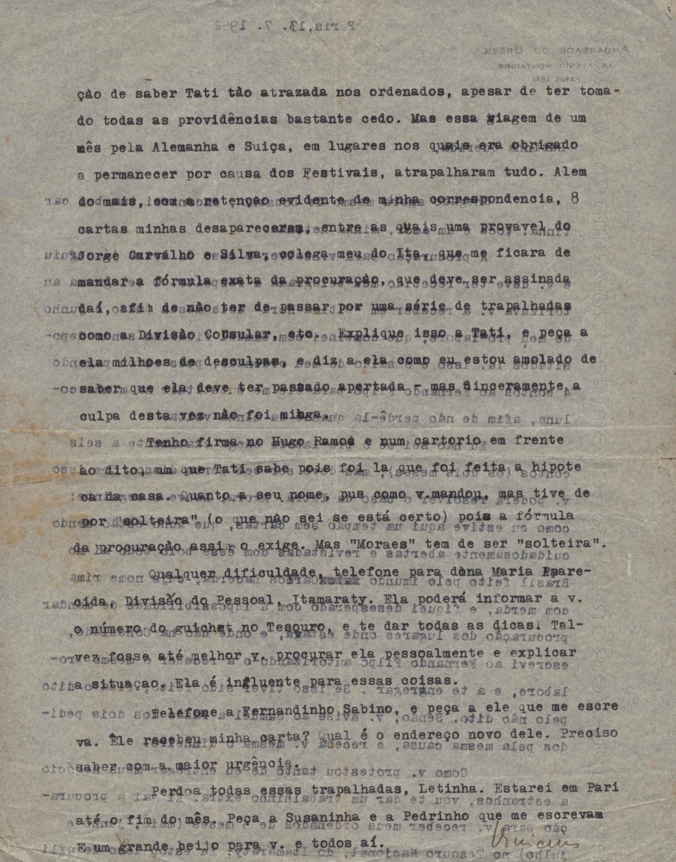 Notícias sobre a vida familiar. Considerações a respeito de pendências a serem resolvidas por VM. Comentário sobre a vida particular de seu irmão, Helius, e sobre a crise nos EUA durante a Guerra Fria. Felicitações pelo aniversário de VM. Comentários sobre o falecimento de seus pais, Clodoaldo Pereira da Silva Moraes e Lydia Cruz de Moraes. Notícias sobre o retorno de VM ao Brasil. Comentário sobre as obras Orfeu da Conceição e Poesia de carnaval e sobre amigos de VM: Aníbal Machado, Ênio da Silveira, Haroldo Tapajós, Irineu Garcia, John Mc Dowell, Mário Cabral, Maurício Fernandes, Otávio de Faria, Rodrigo Goulart, Pedro Nava, Tom Jobim entre outros. Comentário a respeito do livro [Caminho para a distância] voltar para o prelo. Menção à produção de um conto, "A lágrima", um soneto, "Judeu errante", e os poemas "Os inconsoláveis", "O bom-pastor", "A retirada", "A árvore da montanha" e "Desejo". Recomendações acerca de livros deixados por VM para serem enviados a Hecila Rodrigues de Brito. Solicitação para que Laetitia Cruz de Moraes leia o "Registro literário", de João Ribeiro, no Jornal do Brasil, e envie as críticas sobre o livro de VM. Pedido de comentário sobre os filmes: Caminho da vida, Cântico dos cânticos, Onde a terra acaba e The stranger’s return, do diretor King Vidor. Pedido de envio de algumas letras de músicas em inglês e valsas americanas. Preocupação a respeito das investidas em química, de seu irmão Helius de Moraes. Felicitações pelos 18 anos de Laetitia Cruz de Moraes. Referência a várias pessoas: Aníbal Machado, Antônia, Antônio Maria, Carlos Leão, Carlos Lacerda, Cristiano Machado, Décio de Moura, Fernando Filpo, Fernando Sabino, Getúlio Vargas, Helius de Moraes, Jane Russel, Joan Crawford, João Araújo Castro, Jorge Carvalho e Silva, Jorge Vargas de Andrade, Juan de La Cruz, Lydia Cruz de Moraes, Lygia Cruz de Moraes, Lúcia Proença Vargas, Maria Macedo Soares, Mário Cabral, Mário da Câmara, Mário Fernandes, Otávio de Faria, Paulo Mendes Campos, Paulo Soledade, Prudente de Morais Neto, Susana de Moraes Feinberg e Vinicius da Veiga. Lembranças a amigos e familiares. Considerações a respeito da infância. Manifestação de apoio à irmã, Laetitia Cruz de Moraes. Comentários sobre o pai, Clodoaldo Pereira da Silva Moraes. Notícias sobre o estado de saúde de VM. Referência a dois poemas escritos na Cachoeira de Maromba, em Itatiaia: "A queda" e "Legião dos úrias". Na carta de 4 nov. 1938, VM faz considerações a respeito de Beatriz de Azevedo de Mello de Moraes e fala sobre o seu casamento por procuração. Pedido de segredo absoluto sobre o assunto. Comentário sobre os estudos para o concurso do Itamaraty. Notícias sobre a gravidez de Tati de Moraes. Pedido de favor referente a assuntos bancários. Envio de procurações para os futuros recebimentos de salários de VM. Notícias sobre sua presença em festivais. Nomeação de VM para Secretário Geral da Comissão de Organização do I Festival de Cinema do Brasil. Felicitações pelo aniversário de seu pai, Clodoaldo Pereira da Silva Moraes. Notícias sobre seu trabalho. Recomendações sobre a publicação de artigos seus no Diário Carioca. Notícias sobre seu retorno ao Brasil. Intenção de levar a família para visitá-lo em Paris. Solicitação de despacho de objetos pessoais pelo Itamaraty. Sugestão de poemas seus para serem editados por Rubem Braga: "A legião dos úrias", "Ausência", "Ariana, a mulher", "A máscara da noite", "O cemitério na madrugada", "O desespero da piedade", "Elegia desesperada", "A vida vivida", "O tempo nos parques", "Balanço do filho morto", "Balada do Mangue", "O poeta e a lua", "Mensagem à poesia", "Poética", "Soneto de fidelidade", "Soneto de separação", "O dia da criação", "O riso" e "Balada dos mortos dos campos de concentração". Pedido de auxílio para resolver problemas bancários. Notícias sobre o programa feito para o Rio de Janeiro e São Paulo, com Sacha Gordine e Albert Camus, para divulgação do filme Orfeu negro. Recomendações a respeito de discos novos gravados que precisam ser registrados na SBACEM: "Bom dia tristeza", que Aracy de Almeida gravou, e várias gravações novas de "Se todos fossem iguais a você". Solicitação de envio dos poemas "Elegia da paz" e "Desastre de Lionel Marmier". Notícia do desaparecimento do Roteiro lírico e sentimental da cidade do Rio de Janeiro. Pedido de auxílio a Sette Câmara para ser removido para outro posto do Itamaraty, em Buenos Aires, Montevidéu ou Santiago. Referência a Claudio Santoro, para fazer uma ópera com o Orfeu da Conceição. Notícias de mudança para Montevidéu em 23 ago. 1957.