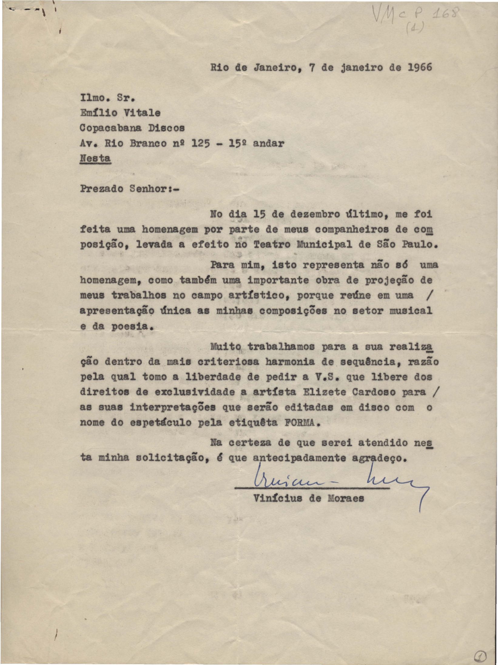 Pedido de liberação para Elizeth Cardoso interpretar peças de VM a serem editadas em disco da etiqueta Forma. Comentários sobre homenagem recebida por VM em 15 dez. 1965.