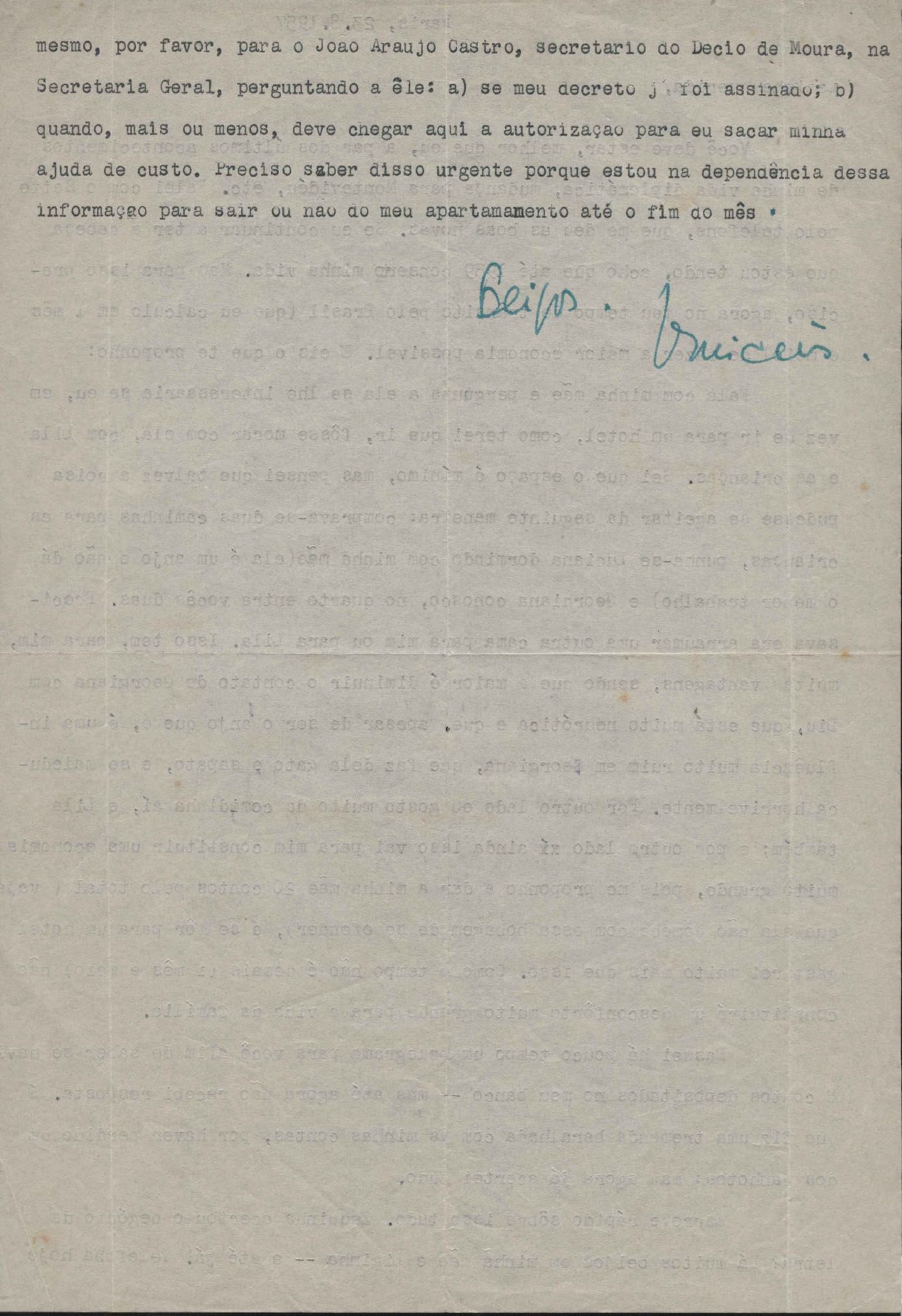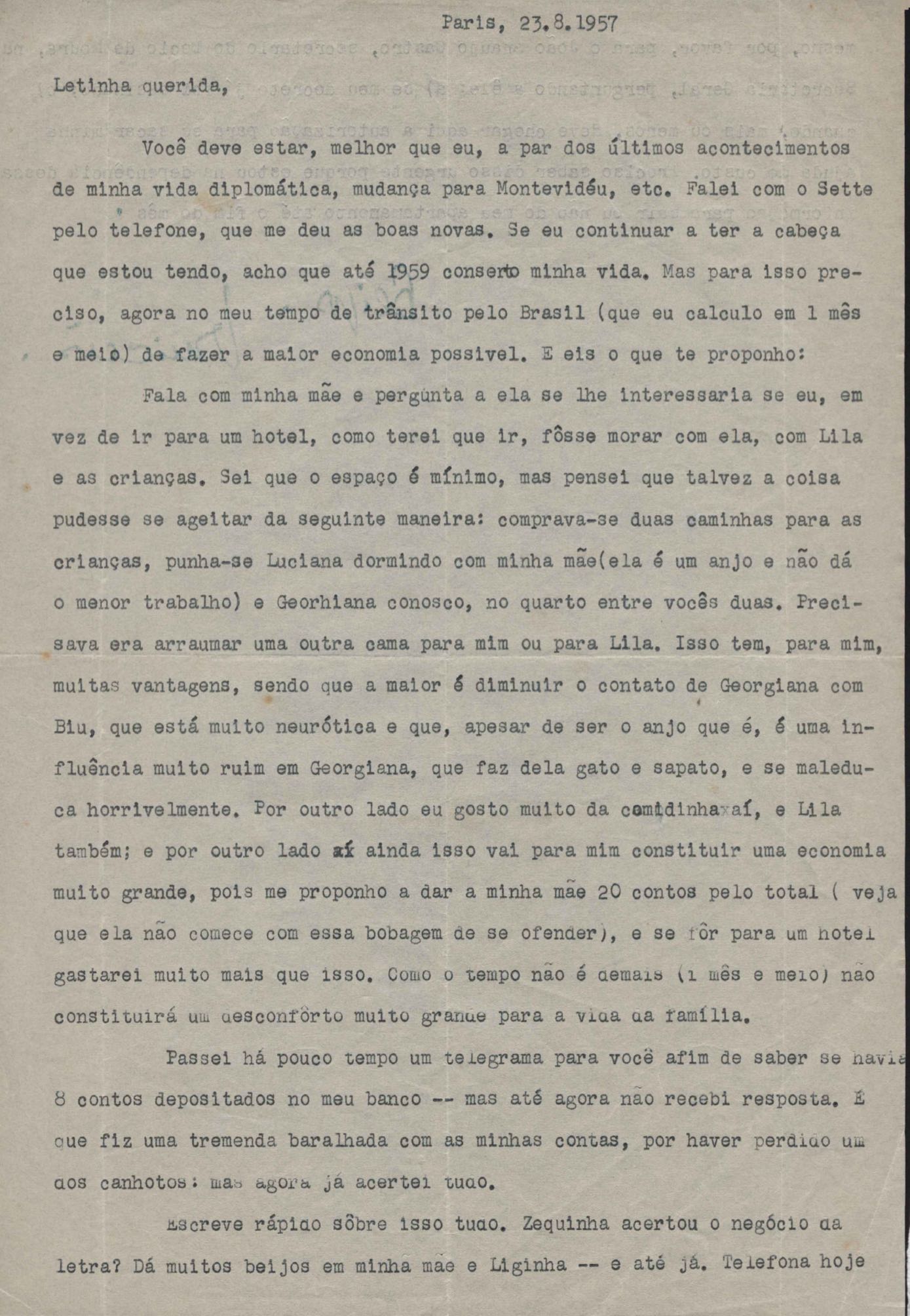 Notícias sobre a vida familiar. Considerações a respeito de pendências a serem resolvidas por VM. Comentário sobre a vida particular de seu irmão, Helius, e sobre a crise nos EUA durante a Guerra Fria. Felicitações pelo aniversário de VM. Comentários sobre o falecimento de seus pais, Clodoaldo Pereira da Silva Moraes e Lydia Cruz de Moraes. Notícias sobre o retorno de VM ao Brasil. Comentário sobre as obras Orfeu da Conceição e Poesia de carnaval e sobre amigos de VM: Aníbal Machado, Ênio da Silveira, Haroldo Tapajós, Irineu Garcia, John Mc Dowell, Mário Cabral, Maurício Fernandes, Otávio de Faria, Rodrigo Goulart, Pedro Nava, Tom Jobim entre outros. Comentário a respeito do livro [Caminho para a distância] voltar para o prelo. Menção à produção de um conto, "A lágrima", um soneto, "Judeu errante", e os poemas "Os inconsoláveis", "O bom-pastor", "A retirada", "A árvore da montanha" e "Desejo". Recomendações acerca de livros deixados por VM para serem enviados a Hecila Rodrigues de Brito. Solicitação para que Laetitia Cruz de Moraes leia o "Registro literário", de João Ribeiro, no Jornal do Brasil, e envie as críticas sobre o livro de VM. Pedido de comentário sobre os filmes: Caminho da vida, Cântico dos cânticos, Onde a terra acaba e The stranger’s return, do diretor King Vidor. Pedido de envio de algumas letras de músicas em inglês e valsas americanas. Preocupação a respeito das investidas em química, de seu irmão Helius de Moraes. Felicitações pelos 18 anos de Laetitia Cruz de Moraes. Referência a várias pessoas: Aníbal Machado, Antônia, Antônio Maria, Carlos Leão, Carlos Lacerda, Cristiano Machado, Décio de Moura, Fernando Filpo, Fernando Sabino, Getúlio Vargas, Helius de Moraes, Jane Russel, Joan Crawford, João Araújo Castro, Jorge Carvalho e Silva, Jorge Vargas de Andrade, Juan de La Cruz, Lydia Cruz de Moraes, Lygia Cruz de Moraes, Lúcia Proença Vargas, Maria Macedo Soares, Mário Cabral, Mário da Câmara, Mário Fernandes, Otávio de Faria, Paulo Mendes Campos, Paulo Soledade, Prudente de Morais Neto, Susana de Moraes Feinberg e Vinicius da Veiga. Lembranças a amigos e familiares. Considerações a respeito da infância. Manifestação de apoio à irmã, Laetitia Cruz de Moraes. Comentários sobre o pai, Clodoaldo Pereira da Silva Moraes. Notícias sobre o estado de saúde de VM. Referência a dois poemas escritos na Cachoeira de Maromba, em Itatiaia: "A queda" e "Legião dos úrias". Na carta de 4 nov. 1938, VM faz considerações a respeito de Beatriz de Azevedo de Mello de Moraes e fala sobre o seu casamento por procuração. Pedido de segredo absoluto sobre o assunto. Comentário sobre os estudos para o concurso do Itamaraty. Notícias sobre a gravidez de Tati de Moraes. Pedido de favor referente a assuntos bancários. Envio de procurações para os futuros recebimentos de salários de VM. Notícias sobre sua presença em festivais. Nomeação de VM para Secretário Geral da Comissão de Organização do I Festival de Cinema do Brasil. Felicitações pelo aniversário de seu pai, Clodoaldo Pereira da Silva Moraes. Notícias sobre seu trabalho. Recomendações sobre a publicação de artigos seus no Diário Carioca. Notícias sobre seu retorno ao Brasil. Intenção de levar a família para visitá-lo em Paris. Solicitação de despacho de objetos pessoais pelo Itamaraty. Sugestão de poemas seus para serem editados por Rubem Braga: "A legião dos úrias", "Ausência", "Ariana, a mulher", "A máscara da noite", "O cemitério na madrugada", "O desespero da piedade", "Elegia desesperada", "A vida vivida", "O tempo nos parques", "Balanço do filho morto", "Balada do Mangue", "O poeta e a lua", "Mensagem à poesia", "Poética", "Soneto de fidelidade", "Soneto de separação", "O dia da criação", "O riso" e "Balada dos mortos dos campos de concentração". Pedido de auxílio para resolver problemas bancários. Notícias sobre o programa feito para o Rio de Janeiro e São Paulo, com Sacha Gordine e Albert Camus, para divulgação do filme Orfeu negro. Recomendações a respeito de discos novos gravados que precisam ser registrados na SBACEM: "Bom dia tristeza", que Aracy de Almeida gravou, e várias gravações novas de "Se todos fossem iguais a você". Solicitação de envio dos poemas "Elegia da paz" e "Desastre de Lionel Marmier". Notícia do desaparecimento do Roteiro lírico e sentimental da cidade do Rio de Janeiro. Pedido de auxílio a Sette Câmara para ser removido para outro posto do Itamaraty, em Buenos Aires, Montevidéu ou Santiago. Referência a Claudio Santoro, para fazer uma ópera com o Orfeu da Conceição. Notícias de mudança para Montevidéu em 23 ago. 1957.