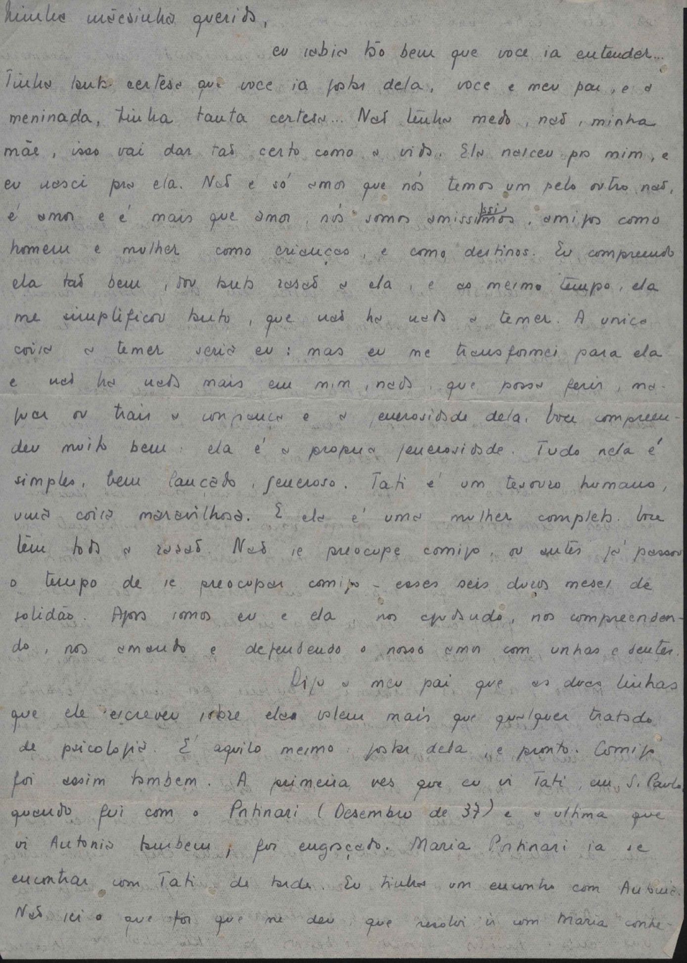 Solicitação de envio de documentos. Notícias sobre a sua vida pessoal. Pergunta sobre o irmão, Helius de Moraes. Felicitações pelo aniversário de seu filho, Pedro de Mello Moraes. Pedido de envio de jornais por intermédio de sua irmã, Lygia Cruz de Moraes. Na carta de Oxford, de 22 mar. 1939, VM comunica a seus pais, amigos e parentes seu casamento, por procuração, com Beatriz Azevedo de Mello Moraes. Comentários sobre os amigos e encontros com Afrânio de Melo Franco, Baden Powell, Carlos Drummond de Andrade, Beatriz Azevedo de Mello Moraes, Custódio José de Melo, Di Cavalcanti, Fernando Sabino, Greta Garbo, Manuel Bandeira, Pablo Neruda, Rodrigo de Melo Franco, Rubem Braga, Tom Jobim entre outros. Considerações sobre lançamento e venda de seus livros. Notícias sobre a vida familiar. Lydia Cruz de Moraes faz comentários sobre os relacionamentos amorosos do filho, VM. Felicitações pelos aniversários de VM e de seu neto, Pedro de Mello Moraes. Preocupação com a saúde do filho, VM. Notícia sobre a publicação de crônicas. Comentário sobre a separação de VM e Beatriz Azevedo de Mello Moraes. Comentário sobre viagem feita a Belo Horizonte. Questionamento sobre o retorno de Helius de Moraes ao Brasil. Comentário sobre a candidatura de Cristiano Machado a Presidente da República. Considerações sobre o falecimento do pai e da avó de VM, Maria Conceição. Cumprimentos pelo poema "Pátria minha". Recomendações aos amigos: Aníbal Machado, Mário Melo, Ary Franco, José Artur, Pedro Nava, Guilherme Souto entre outros.