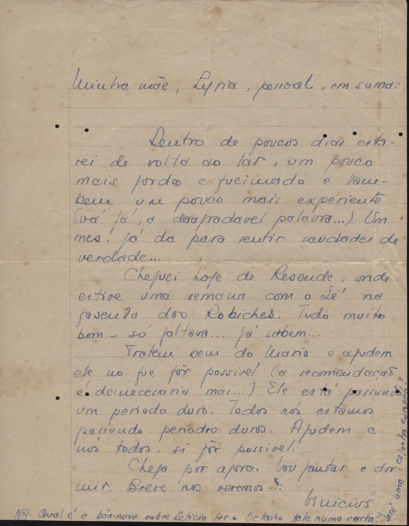 Correspondências entre VM e sua mãe, Lydia Cruz de Moraes. Há cartas sem data e algumas com notas para familiares. Em alguns casos há somente o envelope.