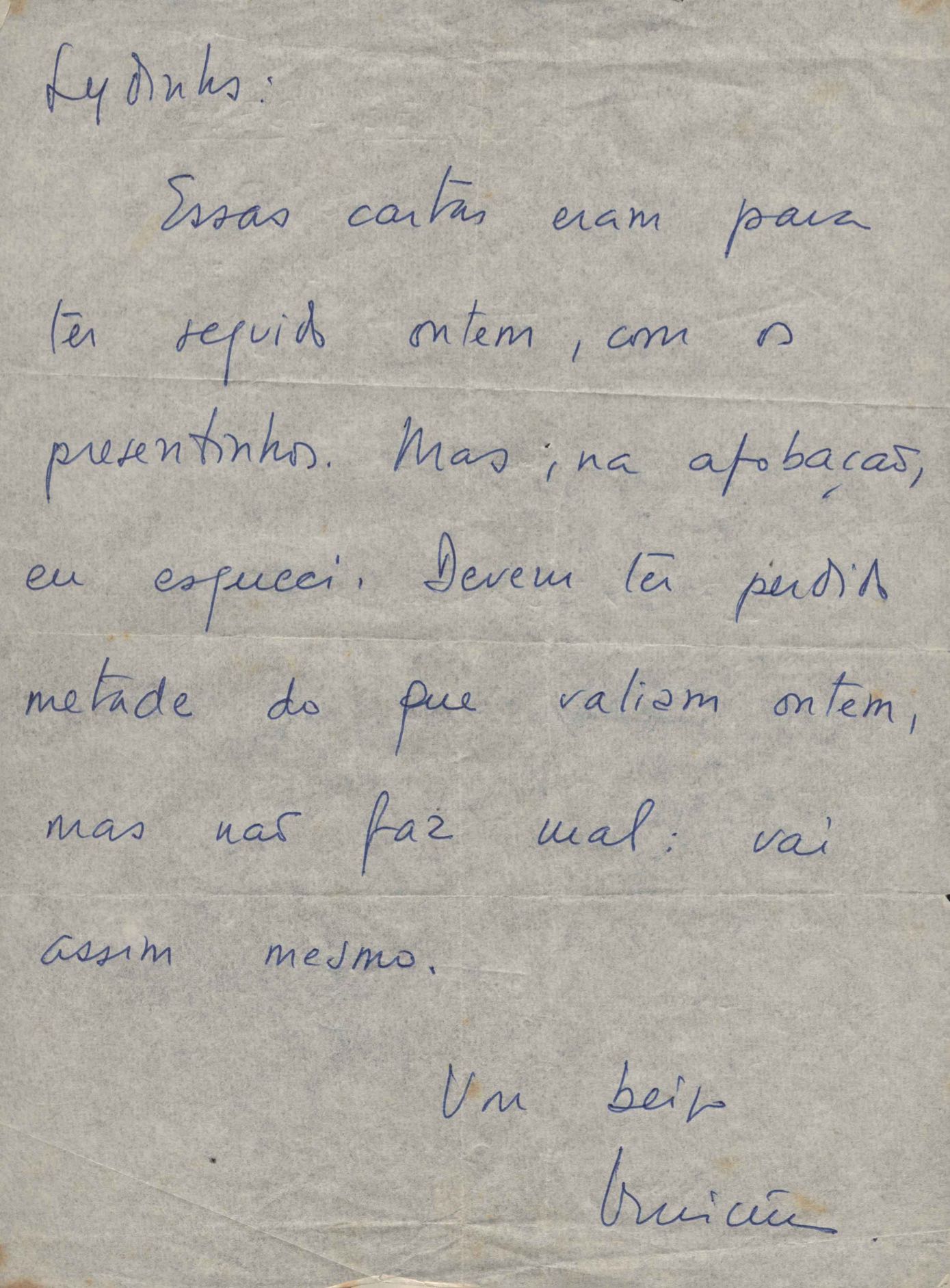 Correspondências entre VM e sua mãe, Lydia Cruz de Moraes. Há cartas sem data e algumas com notas para familiares. Em alguns casos há somente o envelope.