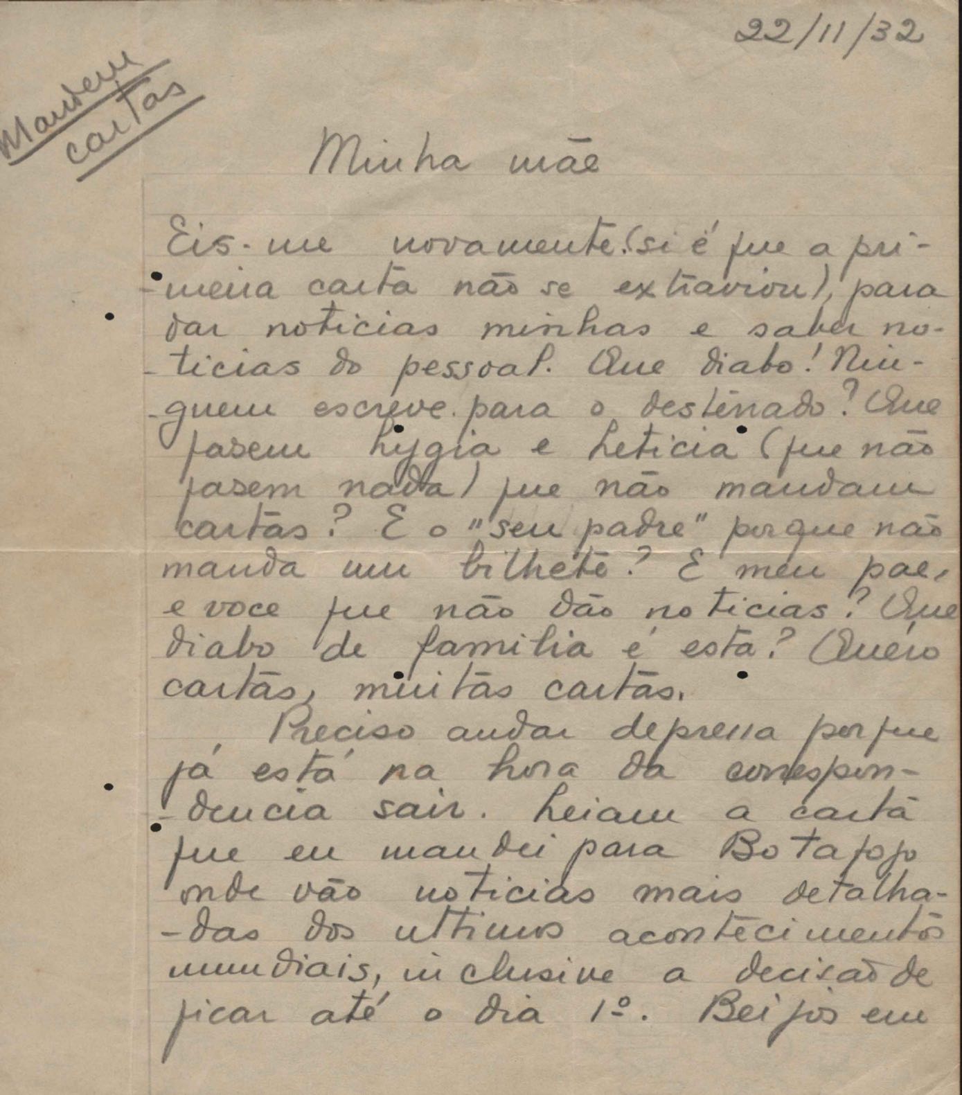Correspondências entre VM e sua mãe, Lydia Cruz de Moraes. Há cartas sem data e algumas com notas para familiares. Em alguns casos há somente o envelope.
