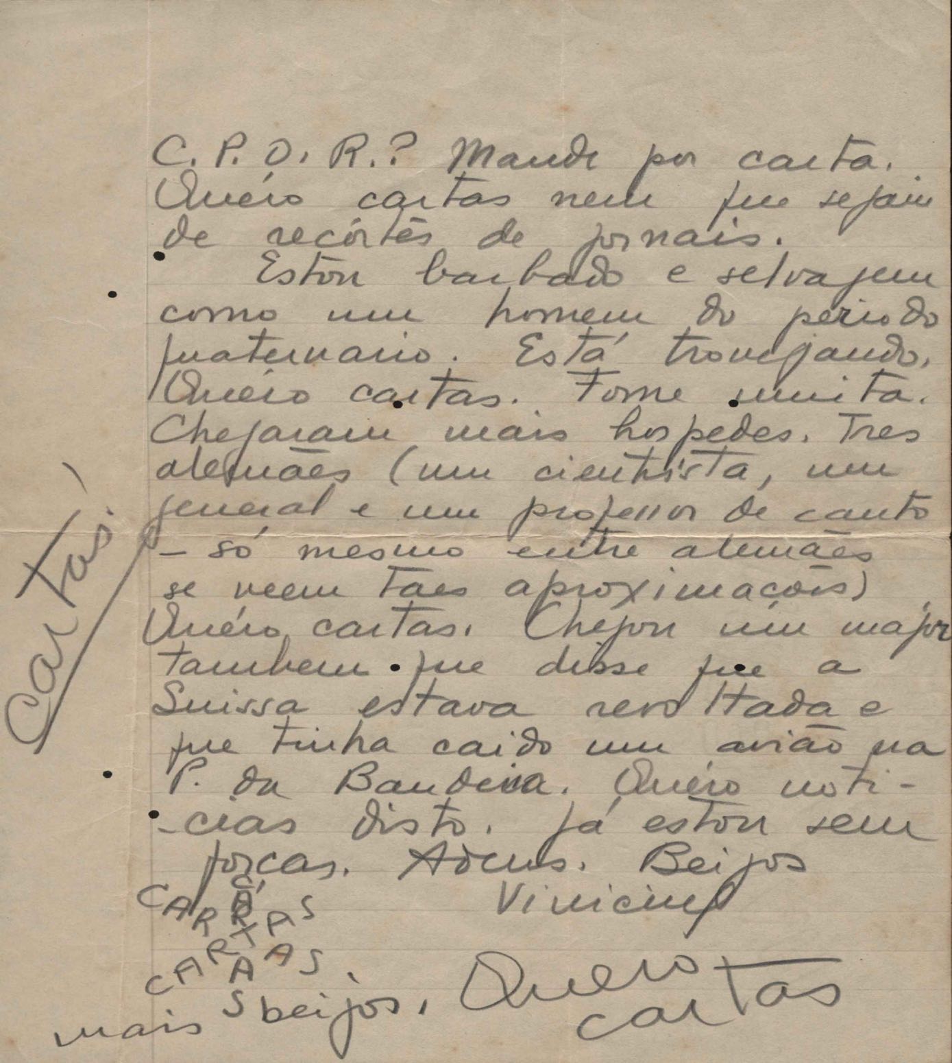 Solicitação de envio de documentos. Notícias sobre a sua vida pessoal. Pergunta sobre o irmão, Helius de Moraes. Felicitações pelo aniversário de seu filho, Pedro de Mello Moraes. Pedido de envio de jornais por intermédio de sua irmã, Lygia Cruz de Moraes. Na carta de Oxford, de 22 mar. 1939, VM comunica a seus pais, amigos e parentes seu casamento, por procuração, com Beatriz Azevedo de Mello Moraes. Comentários sobre os amigos e encontros com Afrânio de Melo Franco, Baden Powell, Carlos Drummond de Andrade, Beatriz Azevedo de Mello Moraes, Custódio José de Melo, Di Cavalcanti, Fernando Sabino, Greta Garbo, Manuel Bandeira, Pablo Neruda, Rodrigo de Melo Franco, Rubem Braga, Tom Jobim entre outros. Considerações sobre lançamento e venda de seus livros. Notícias sobre a vida familiar. Lydia Cruz de Moraes faz comentários sobre os relacionamentos amorosos do filho, VM. Felicitações pelos aniversários de VM e de seu neto, Pedro de Mello Moraes. Preocupação com a saúde do filho, VM. Notícia sobre a publicação de crônicas. Comentário sobre a separação de VM e Beatriz Azevedo de Mello Moraes. Comentário sobre viagem feita a Belo Horizonte. Questionamento sobre o retorno de Helius de Moraes ao Brasil. Comentário sobre a candidatura de Cristiano Machado a Presidente da República. Considerações sobre o falecimento do pai e da avó de VM, Maria Conceição. Cumprimentos pelo poema "Pátria minha". Recomendações aos amigos: Aníbal Machado, Mário Melo, Ary Franco, José Artur, Pedro Nava, Guilherme Souto entre outros.