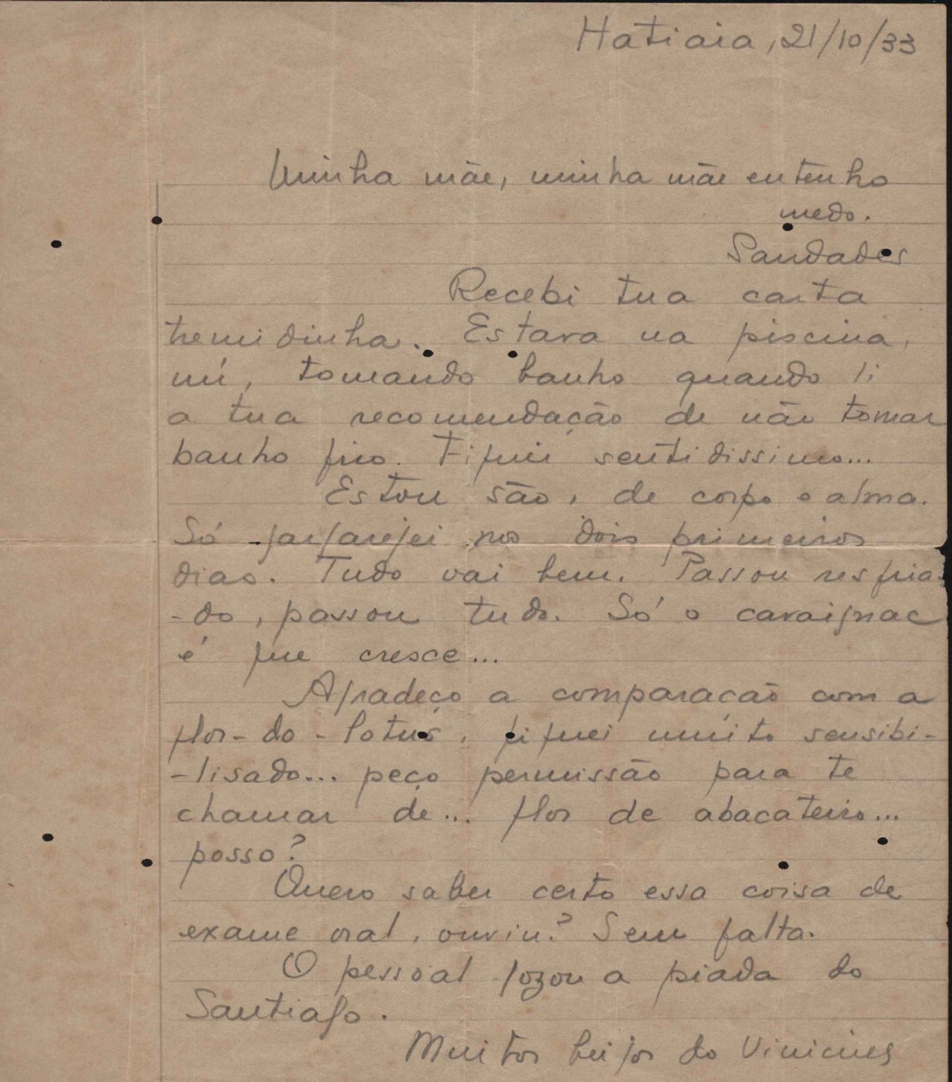 Correspondências entre VM e sua mãe, Lydia Cruz de Moraes. Há cartas sem data e algumas com notas para familiares. Em alguns casos há somente o envelope.