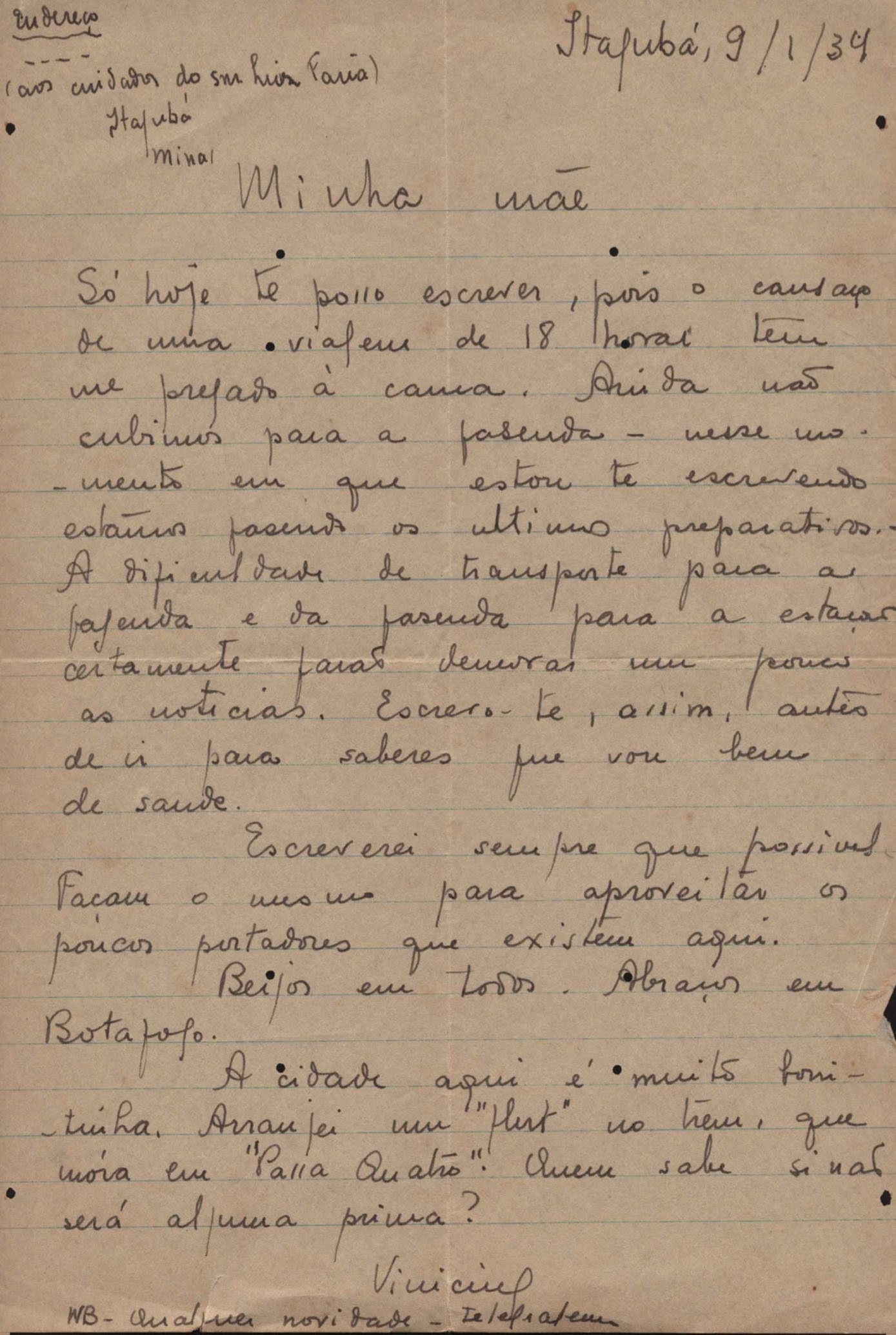 Solicitação de envio de documentos. Notícias sobre a sua vida pessoal. Pergunta sobre o irmão, Helius de Moraes. Felicitações pelo aniversário de seu filho, Pedro de Mello Moraes. Pedido de envio de jornais por intermédio de sua irmã, Lygia Cruz de Moraes. Na carta de Oxford, de 22 mar. 1939, VM comunica a seus pais, amigos e parentes seu casamento, por procuração, com Beatriz Azevedo de Mello Moraes. Comentários sobre os amigos e encontros com Afrânio de Melo Franco, Baden Powell, Carlos Drummond de Andrade, Beatriz Azevedo de Mello Moraes, Custódio José de Melo, Di Cavalcanti, Fernando Sabino, Greta Garbo, Manuel Bandeira, Pablo Neruda, Rodrigo de Melo Franco, Rubem Braga, Tom Jobim entre outros. Considerações sobre lançamento e venda de seus livros. Notícias sobre a vida familiar. Lydia Cruz de Moraes faz comentários sobre os relacionamentos amorosos do filho, VM. Felicitações pelos aniversários de VM e de seu neto, Pedro de Mello Moraes. Preocupação com a saúde do filho, VM. Notícia sobre a publicação de crônicas. Comentário sobre a separação de VM e Beatriz Azevedo de Mello Moraes. Comentário sobre viagem feita a Belo Horizonte. Questionamento sobre o retorno de Helius de Moraes ao Brasil. Comentário sobre a candidatura de Cristiano Machado a Presidente da República. Considerações sobre o falecimento do pai e da avó de VM, Maria Conceição. Cumprimentos pelo poema "Pátria minha". Recomendações aos amigos: Aníbal Machado, Mário Melo, Ary Franco, José Artur, Pedro Nava, Guilherme Souto entre outros.