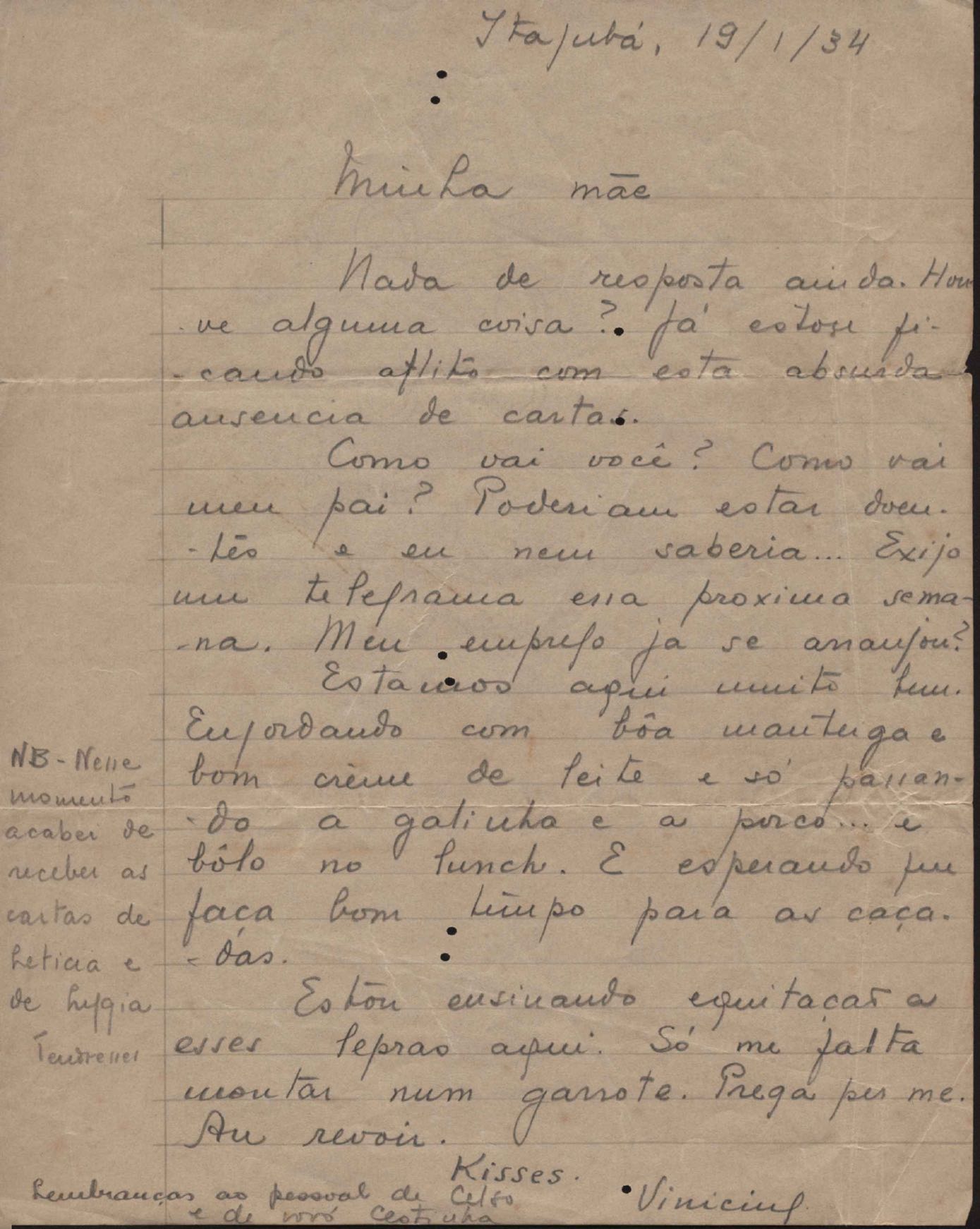 Solicitação de envio de documentos. Notícias sobre a sua vida pessoal. Pergunta sobre o irmão, Helius de Moraes. Felicitações pelo aniversário de seu filho, Pedro de Mello Moraes. Pedido de envio de jornais por intermédio de sua irmã, Lygia Cruz de Moraes. Na carta de Oxford, de 22 mar. 1939, VM comunica a seus pais, amigos e parentes seu casamento, por procuração, com Beatriz Azevedo de Mello Moraes. Comentários sobre os amigos e encontros com Afrânio de Melo Franco, Baden Powell, Carlos Drummond de Andrade, Beatriz Azevedo de Mello Moraes, Custódio José de Melo, Di Cavalcanti, Fernando Sabino, Greta Garbo, Manuel Bandeira, Pablo Neruda, Rodrigo de Melo Franco, Rubem Braga, Tom Jobim entre outros. Considerações sobre lançamento e venda de seus livros. Notícias sobre a vida familiar. Lydia Cruz de Moraes faz comentários sobre os relacionamentos amorosos do filho, VM. Felicitações pelos aniversários de VM e de seu neto, Pedro de Mello Moraes. Preocupação com a saúde do filho, VM. Notícia sobre a publicação de crônicas. Comentário sobre a separação de VM e Beatriz Azevedo de Mello Moraes. Comentário sobre viagem feita a Belo Horizonte. Questionamento sobre o retorno de Helius de Moraes ao Brasil. Comentário sobre a candidatura de Cristiano Machado a Presidente da República. Considerações sobre o falecimento do pai e da avó de VM, Maria Conceição. Cumprimentos pelo poema "Pátria minha". Recomendações aos amigos: Aníbal Machado, Mário Melo, Ary Franco, José Artur, Pedro Nava, Guilherme Souto entre outros.