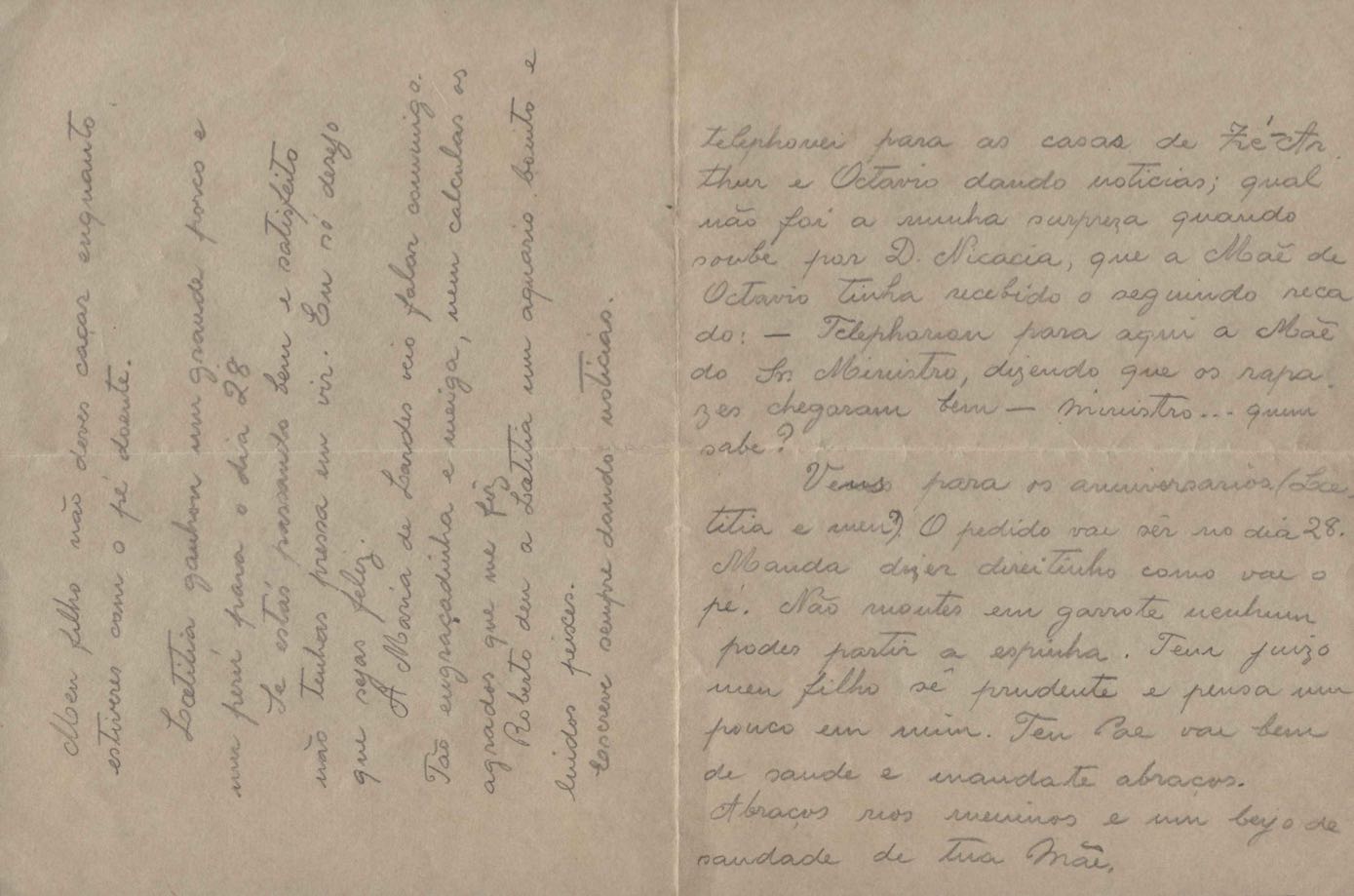 Correspondências entre VM e sua mãe, Lydia Cruz de Moraes. Há cartas sem data e algumas com notas para familiares. Em alguns casos há somente o envelope.