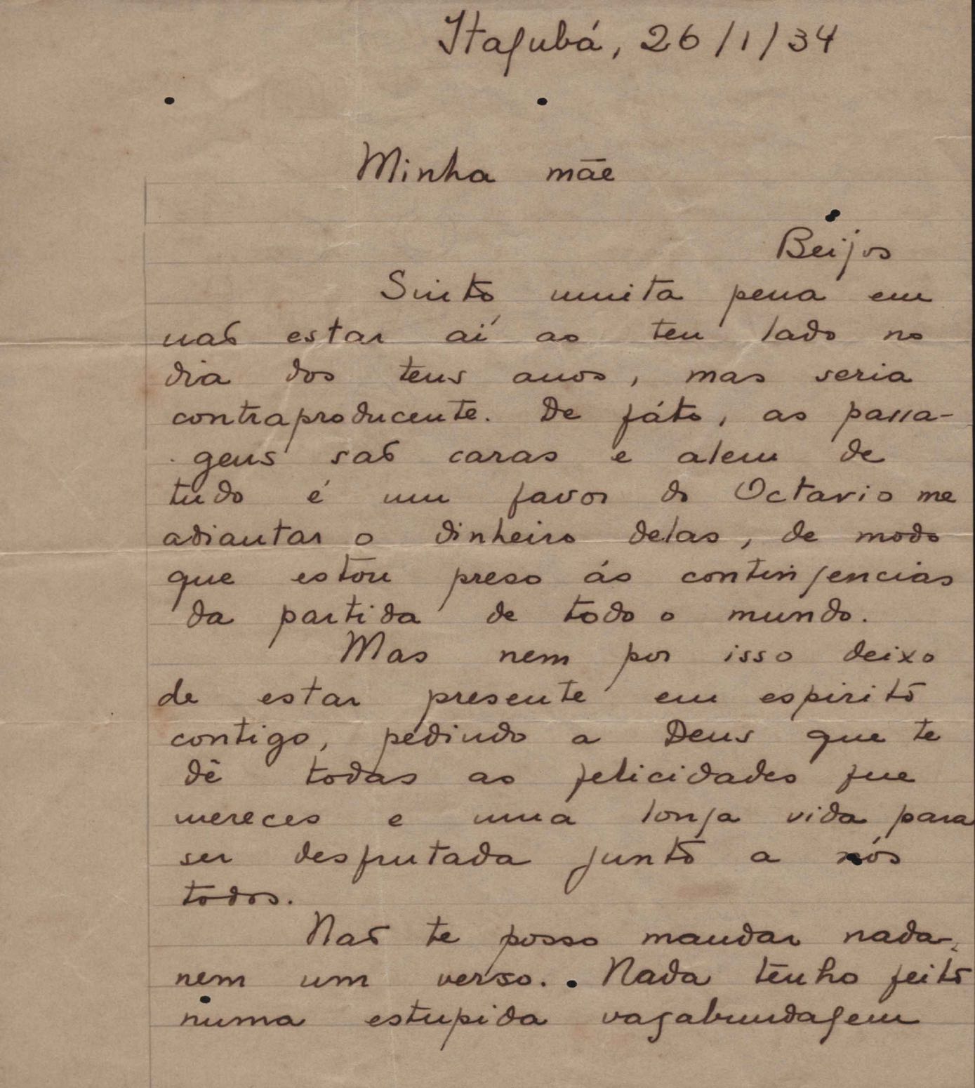 Correspondências entre VM e sua mãe, Lydia Cruz de Moraes. Há cartas sem data e algumas com notas para familiares. Em alguns casos há somente o envelope.