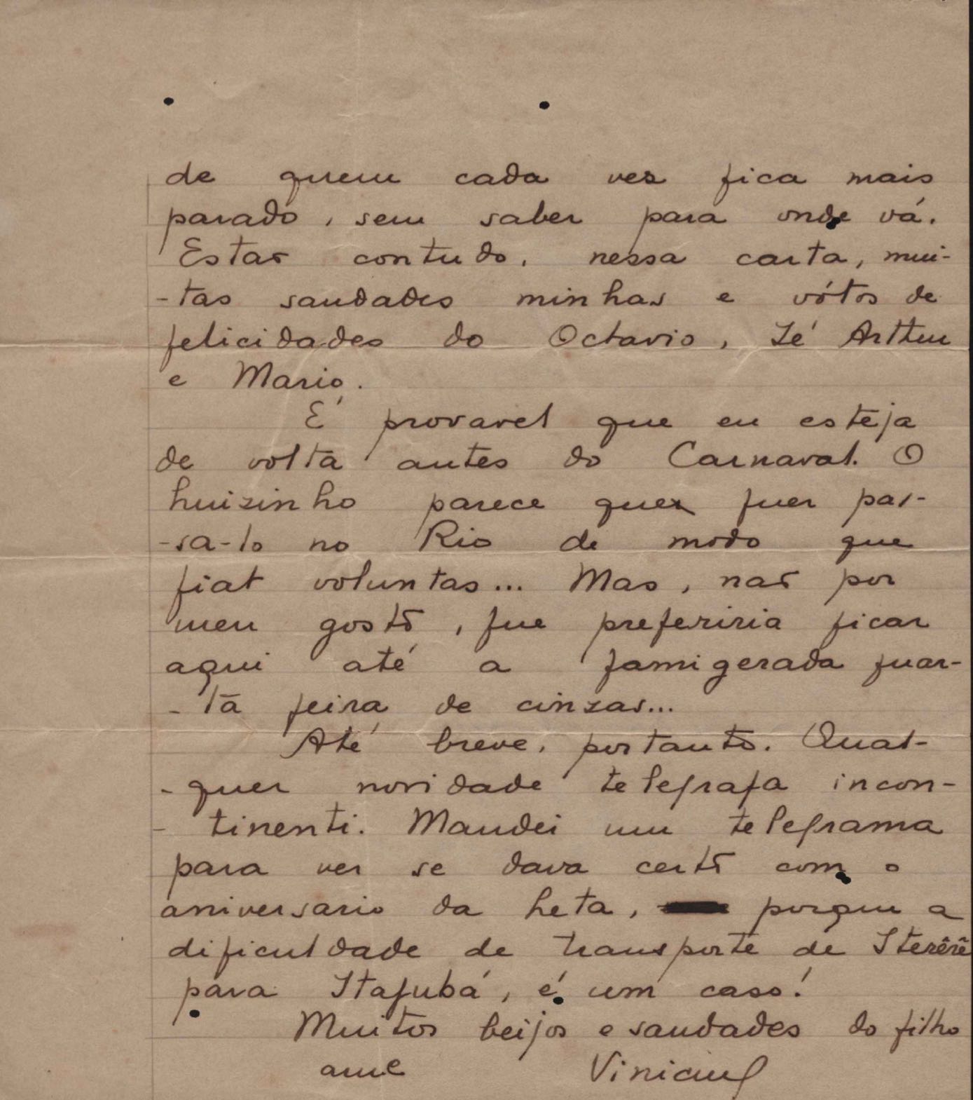 Solicitação de envio de documentos. Notícias sobre a sua vida pessoal. Pergunta sobre o irmão, Helius de Moraes. Felicitações pelo aniversário de seu filho, Pedro de Mello Moraes. Pedido de envio de jornais por intermédio de sua irmã, Lygia Cruz de Moraes. Na carta de Oxford, de 22 mar. 1939, VM comunica a seus pais, amigos e parentes seu casamento, por procuração, com Beatriz Azevedo de Mello Moraes. Comentários sobre os amigos e encontros com Afrânio de Melo Franco, Baden Powell, Carlos Drummond de Andrade, Beatriz Azevedo de Mello Moraes, Custódio José de Melo, Di Cavalcanti, Fernando Sabino, Greta Garbo, Manuel Bandeira, Pablo Neruda, Rodrigo de Melo Franco, Rubem Braga, Tom Jobim entre outros. Considerações sobre lançamento e venda de seus livros. Notícias sobre a vida familiar. Lydia Cruz de Moraes faz comentários sobre os relacionamentos amorosos do filho, VM. Felicitações pelos aniversários de VM e de seu neto, Pedro de Mello Moraes. Preocupação com a saúde do filho, VM. Notícia sobre a publicação de crônicas. Comentário sobre a separação de VM e Beatriz Azevedo de Mello Moraes. Comentário sobre viagem feita a Belo Horizonte. Questionamento sobre o retorno de Helius de Moraes ao Brasil. Comentário sobre a candidatura de Cristiano Machado a Presidente da República. Considerações sobre o falecimento do pai e da avó de VM, Maria Conceição. Cumprimentos pelo poema "Pátria minha". Recomendações aos amigos: Aníbal Machado, Mário Melo, Ary Franco, José Artur, Pedro Nava, Guilherme Souto entre outros.