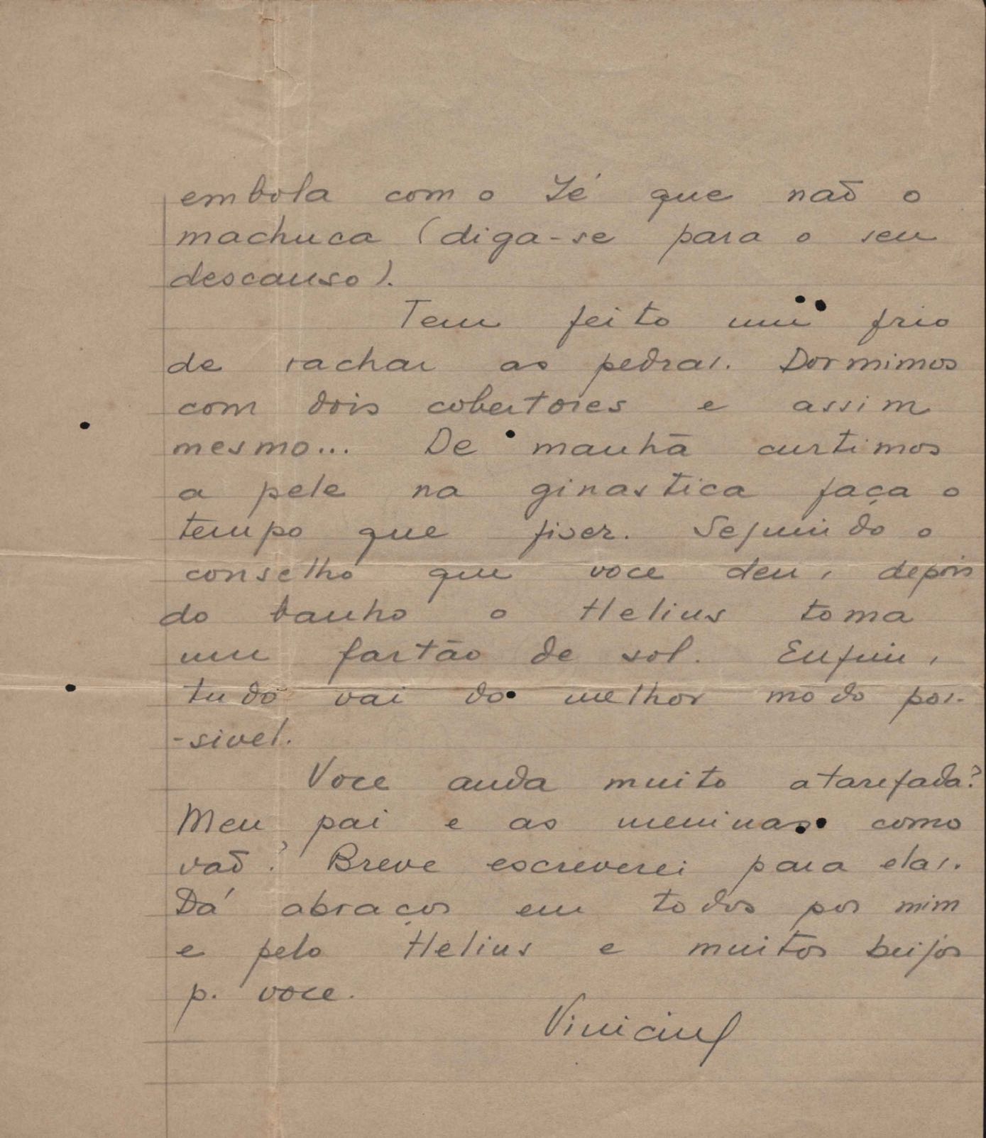 Solicitação de envio de documentos. Notícias sobre a sua vida pessoal. Pergunta sobre o irmão, Helius de Moraes. Felicitações pelo aniversário de seu filho, Pedro de Mello Moraes. Pedido de envio de jornais por intermédio de sua irmã, Lygia Cruz de Moraes. Na carta de Oxford, de 22 mar. 1939, VM comunica a seus pais, amigos e parentes seu casamento, por procuração, com Beatriz Azevedo de Mello Moraes. Comentários sobre os amigos e encontros com Afrânio de Melo Franco, Baden Powell, Carlos Drummond de Andrade, Beatriz Azevedo de Mello Moraes, Custódio José de Melo, Di Cavalcanti, Fernando Sabino, Greta Garbo, Manuel Bandeira, Pablo Neruda, Rodrigo de Melo Franco, Rubem Braga, Tom Jobim entre outros. Considerações sobre lançamento e venda de seus livros. Notícias sobre a vida familiar. Lydia Cruz de Moraes faz comentários sobre os relacionamentos amorosos do filho, VM. Felicitações pelos aniversários de VM e de seu neto, Pedro de Mello Moraes. Preocupação com a saúde do filho, VM. Notícia sobre a publicação de crônicas. Comentário sobre a separação de VM e Beatriz Azevedo de Mello Moraes. Comentário sobre viagem feita a Belo Horizonte. Questionamento sobre o retorno de Helius de Moraes ao Brasil. Comentário sobre a candidatura de Cristiano Machado a Presidente da República. Considerações sobre o falecimento do pai e da avó de VM, Maria Conceição. Cumprimentos pelo poema "Pátria minha". Recomendações aos amigos: Aníbal Machado, Mário Melo, Ary Franco, José Artur, Pedro Nava, Guilherme Souto entre outros.