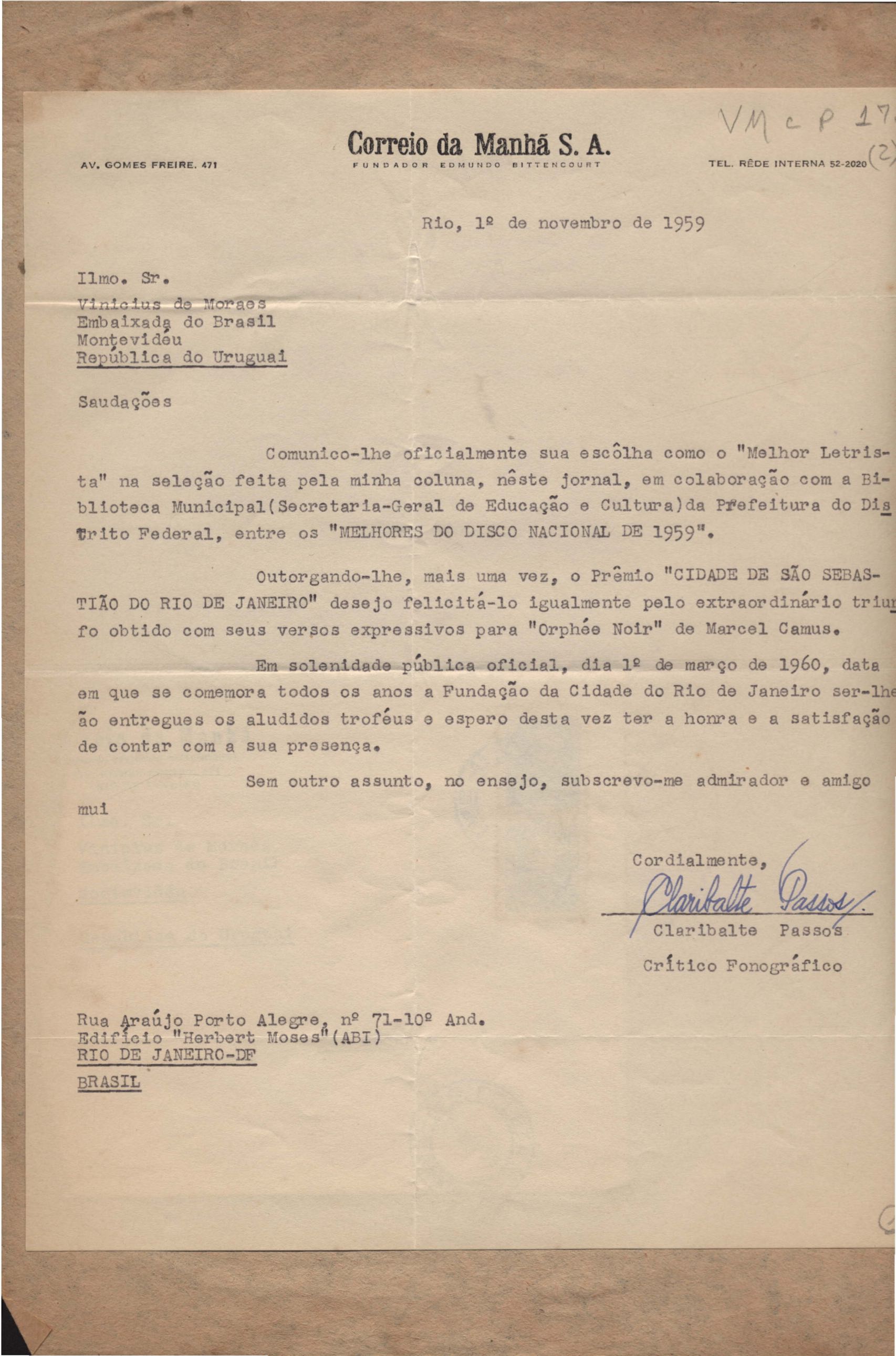 Comunicação de que VM foi escolhido como "Melhor Letrista" na seleção feita pela coluna de Claribalte Passos.