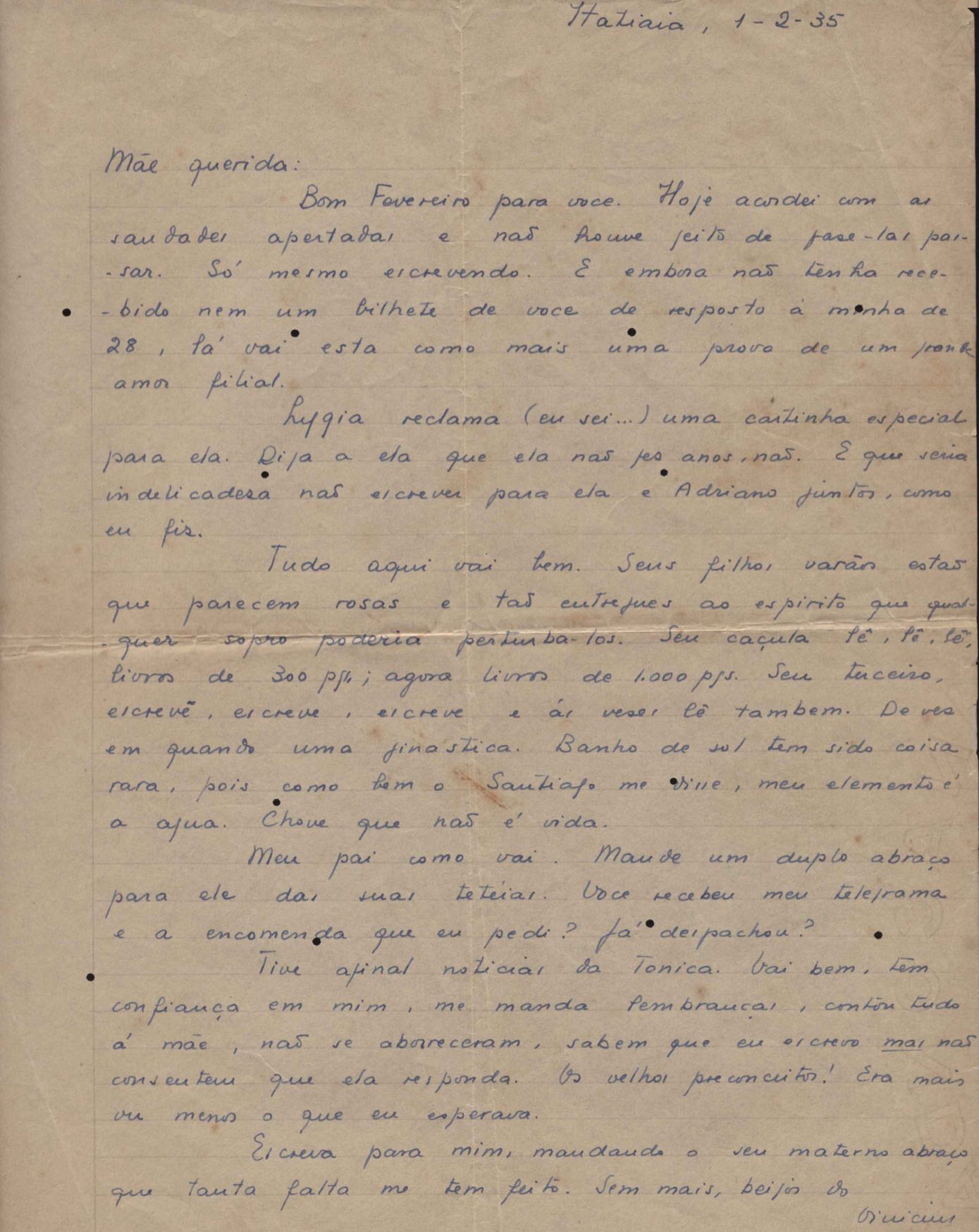 Correspondências entre VM e sua mãe, Lydia Cruz de Moraes. Há cartas sem data e algumas com notas para familiares. Em alguns casos há somente o envelope.
