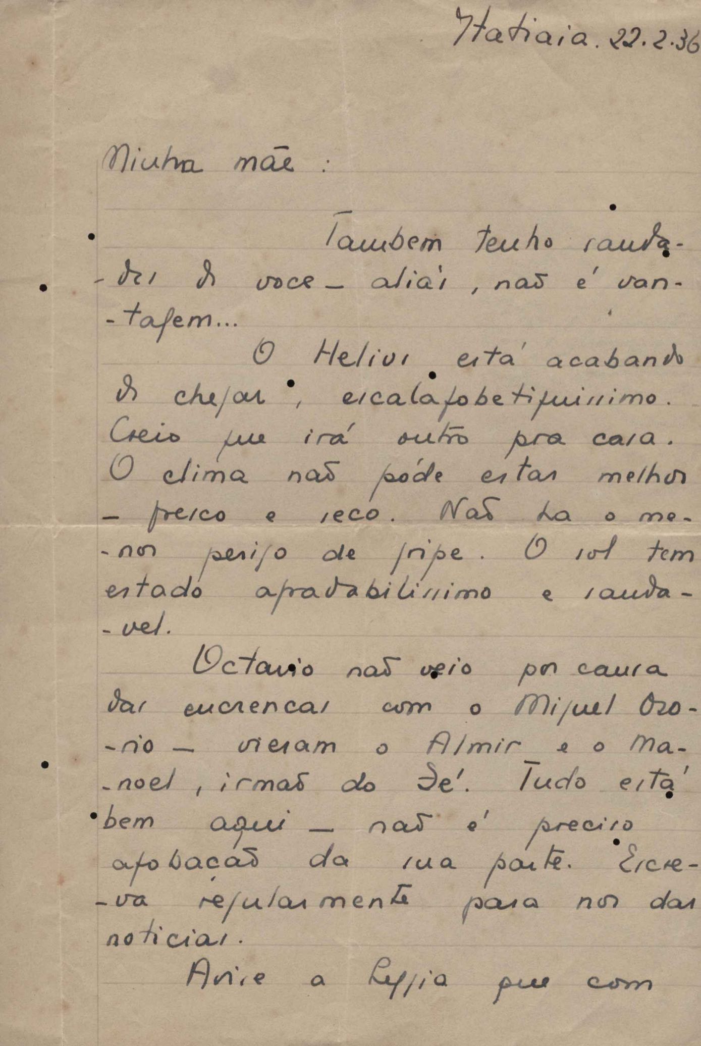 Correspondências entre VM e sua mãe, Lydia Cruz de Moraes. Há cartas sem data e algumas com notas para familiares. Em alguns casos há somente o envelope.