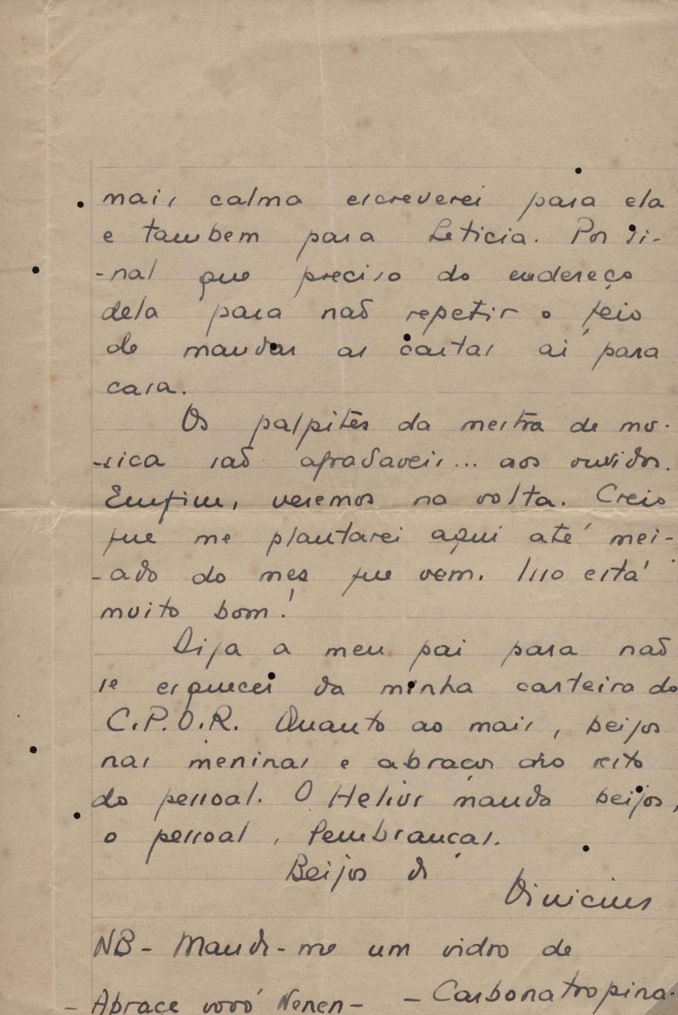 Solicitação de envio de documentos. Notícias sobre a sua vida pessoal. Pergunta sobre o irmão, Helius de Moraes. Felicitações pelo aniversário de seu filho, Pedro de Mello Moraes. Pedido de envio de jornais por intermédio de sua irmã, Lygia Cruz de Moraes. Na carta de Oxford, de 22 mar. 1939, VM comunica a seus pais, amigos e parentes seu casamento, por procuração, com Beatriz Azevedo de Mello Moraes. Comentários sobre os amigos e encontros com Afrânio de Melo Franco, Baden Powell, Carlos Drummond de Andrade, Beatriz Azevedo de Mello Moraes, Custódio José de Melo, Di Cavalcanti, Fernando Sabino, Greta Garbo, Manuel Bandeira, Pablo Neruda, Rodrigo de Melo Franco, Rubem Braga, Tom Jobim entre outros. Considerações sobre lançamento e venda de seus livros. Notícias sobre a vida familiar. Lydia Cruz de Moraes faz comentários sobre os relacionamentos amorosos do filho, VM. Felicitações pelos aniversários de VM e de seu neto, Pedro de Mello Moraes. Preocupação com a saúde do filho, VM. Notícia sobre a publicação de crônicas. Comentário sobre a separação de VM e Beatriz Azevedo de Mello Moraes. Comentário sobre viagem feita a Belo Horizonte. Questionamento sobre o retorno de Helius de Moraes ao Brasil. Comentário sobre a candidatura de Cristiano Machado a Presidente da República. Considerações sobre o falecimento do pai e da avó de VM, Maria Conceição. Cumprimentos pelo poema "Pátria minha". Recomendações aos amigos: Aníbal Machado, Mário Melo, Ary Franco, José Artur, Pedro Nava, Guilherme Souto entre outros.