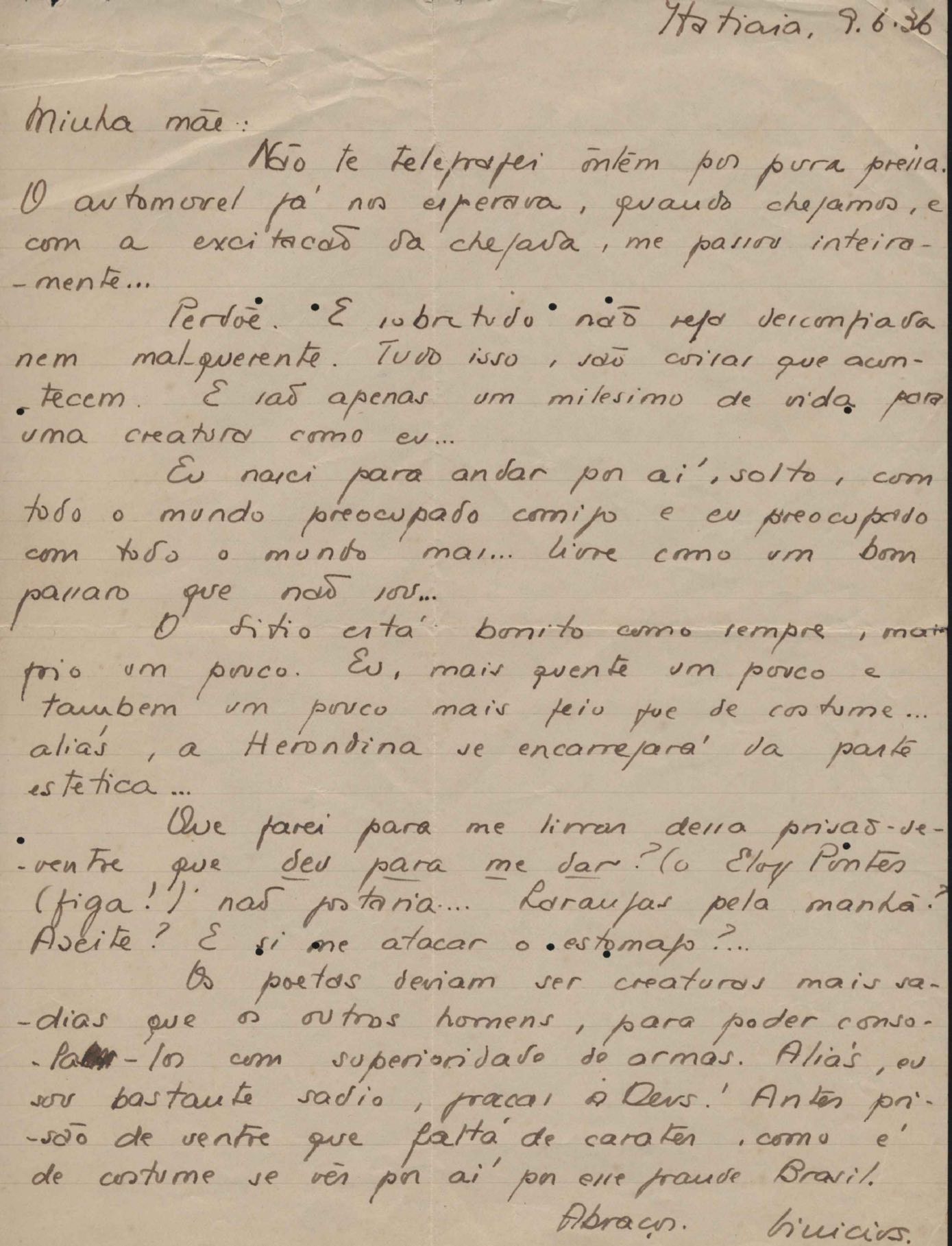Solicitação de envio de documentos. Notícias sobre a sua vida pessoal. Pergunta sobre o irmão, Helius de Moraes. Felicitações pelo aniversário de seu filho, Pedro de Mello Moraes. Pedido de envio de jornais por intermédio de sua irmã, Lygia Cruz de Moraes. Na carta de Oxford, de 22 mar. 1939, VM comunica a seus pais, amigos e parentes seu casamento, por procuração, com Beatriz Azevedo de Mello Moraes. Comentários sobre os amigos e encontros com Afrânio de Melo Franco, Baden Powell, Carlos Drummond de Andrade, Beatriz Azevedo de Mello Moraes, Custódio José de Melo, Di Cavalcanti, Fernando Sabino, Greta Garbo, Manuel Bandeira, Pablo Neruda, Rodrigo de Melo Franco, Rubem Braga, Tom Jobim entre outros. Considerações sobre lançamento e venda de seus livros. Notícias sobre a vida familiar. Lydia Cruz de Moraes faz comentários sobre os relacionamentos amorosos do filho, VM. Felicitações pelos aniversários de VM e de seu neto, Pedro de Mello Moraes. Preocupação com a saúde do filho, VM. Notícia sobre a publicação de crônicas. Comentário sobre a separação de VM e Beatriz Azevedo de Mello Moraes. Comentário sobre viagem feita a Belo Horizonte. Questionamento sobre o retorno de Helius de Moraes ao Brasil. Comentário sobre a candidatura de Cristiano Machado a Presidente da República. Considerações sobre o falecimento do pai e da avó de VM, Maria Conceição. Cumprimentos pelo poema "Pátria minha". Recomendações aos amigos: Aníbal Machado, Mário Melo, Ary Franco, José Artur, Pedro Nava, Guilherme Souto entre outros.
