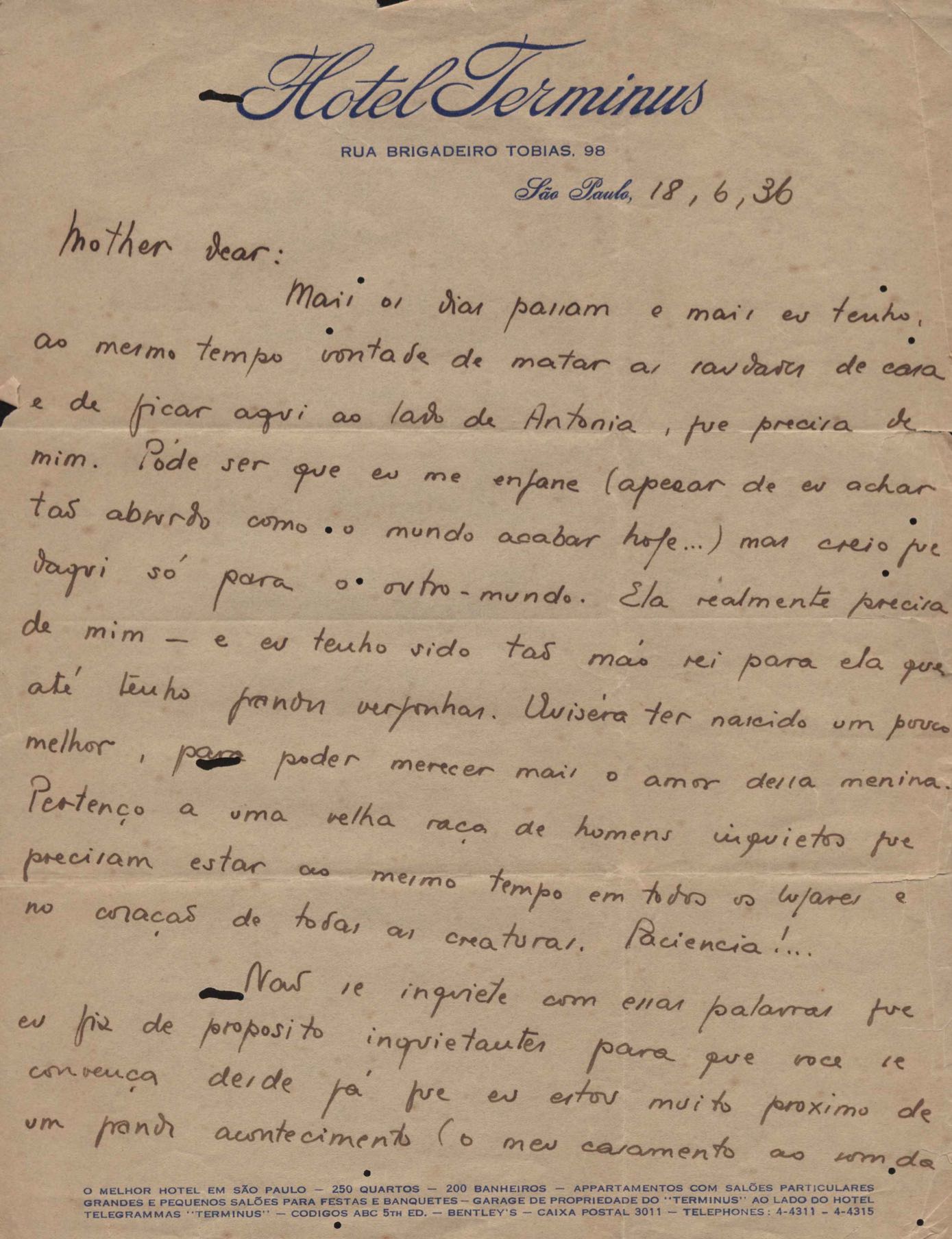 Correspondências entre VM e sua mãe, Lydia Cruz de Moraes. Há cartas sem data e algumas com notas para familiares. Em alguns casos há somente o envelope.