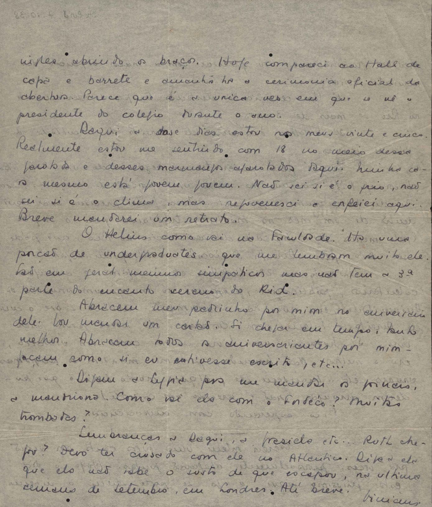 Solicitação de envio de documentos. Notícias sobre a sua vida pessoal. Pergunta sobre o irmão, Helius de Moraes. Felicitações pelo aniversário de seu filho, Pedro de Mello Moraes. Pedido de envio de jornais por intermédio de sua irmã, Lygia Cruz de Moraes. Na carta de Oxford, de 22 mar. 1939, VM comunica a seus pais, amigos e parentes seu casamento, por procuração, com Beatriz Azevedo de Mello Moraes. Comentários sobre os amigos e encontros com Afrânio de Melo Franco, Baden Powell, Carlos Drummond de Andrade, Beatriz Azevedo de Mello Moraes, Custódio José de Melo, Di Cavalcanti, Fernando Sabino, Greta Garbo, Manuel Bandeira, Pablo Neruda, Rodrigo de Melo Franco, Rubem Braga, Tom Jobim entre outros. Considerações sobre lançamento e venda de seus livros. Notícias sobre a vida familiar. Lydia Cruz de Moraes faz comentários sobre os relacionamentos amorosos do filho, VM. Felicitações pelos aniversários de VM e de seu neto, Pedro de Mello Moraes. Preocupação com a saúde do filho, VM. Notícia sobre a publicação de crônicas. Comentário sobre a separação de VM e Beatriz Azevedo de Mello Moraes. Comentário sobre viagem feita a Belo Horizonte. Questionamento sobre o retorno de Helius de Moraes ao Brasil. Comentário sobre a candidatura de Cristiano Machado a Presidente da República. Considerações sobre o falecimento do pai e da avó de VM, Maria Conceição. Cumprimentos pelo poema "Pátria minha". Recomendações aos amigos: Aníbal Machado, Mário Melo, Ary Franco, José Artur, Pedro Nava, Guilherme Souto entre outros.