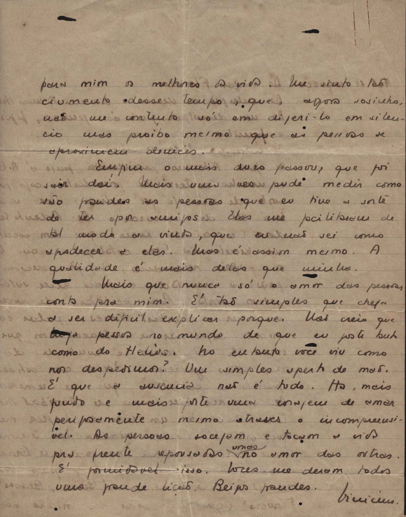 Solicitação de envio de documentos. Notícias sobre a sua vida pessoal. Pergunta sobre o irmão, Helius de Moraes. Felicitações pelo aniversário de seu filho, Pedro de Mello Moraes. Pedido de envio de jornais por intermédio de sua irmã, Lygia Cruz de Moraes. Na carta de Oxford, de 22 mar. 1939, VM comunica a seus pais, amigos e parentes seu casamento, por procuração, com Beatriz Azevedo de Mello Moraes. Comentários sobre os amigos e encontros com Afrânio de Melo Franco, Baden Powell, Carlos Drummond de Andrade, Beatriz Azevedo de Mello Moraes, Custódio José de Melo, Di Cavalcanti, Fernando Sabino, Greta Garbo, Manuel Bandeira, Pablo Neruda, Rodrigo de Melo Franco, Rubem Braga, Tom Jobim entre outros. Considerações sobre lançamento e venda de seus livros. Notícias sobre a vida familiar. Lydia Cruz de Moraes faz comentários sobre os relacionamentos amorosos do filho, VM. Felicitações pelos aniversários de VM e de seu neto, Pedro de Mello Moraes. Preocupação com a saúde do filho, VM. Notícia sobre a publicação de crônicas. Comentário sobre a separação de VM e Beatriz Azevedo de Mello Moraes. Comentário sobre viagem feita a Belo Horizonte. Questionamento sobre o retorno de Helius de Moraes ao Brasil. Comentário sobre a candidatura de Cristiano Machado a Presidente da República. Considerações sobre o falecimento do pai e da avó de VM, Maria Conceição. Cumprimentos pelo poema "Pátria minha". Recomendações aos amigos: Aníbal Machado, Mário Melo, Ary Franco, José Artur, Pedro Nava, Guilherme Souto entre outros.