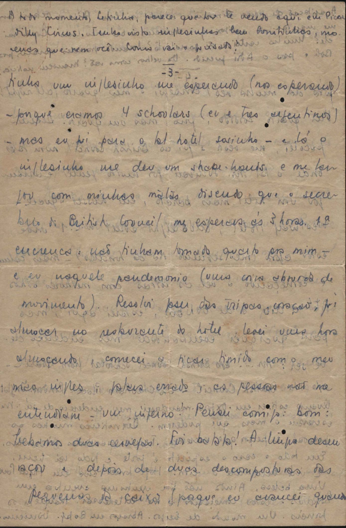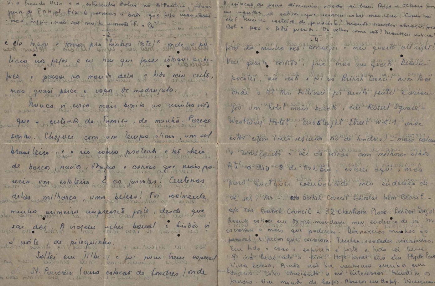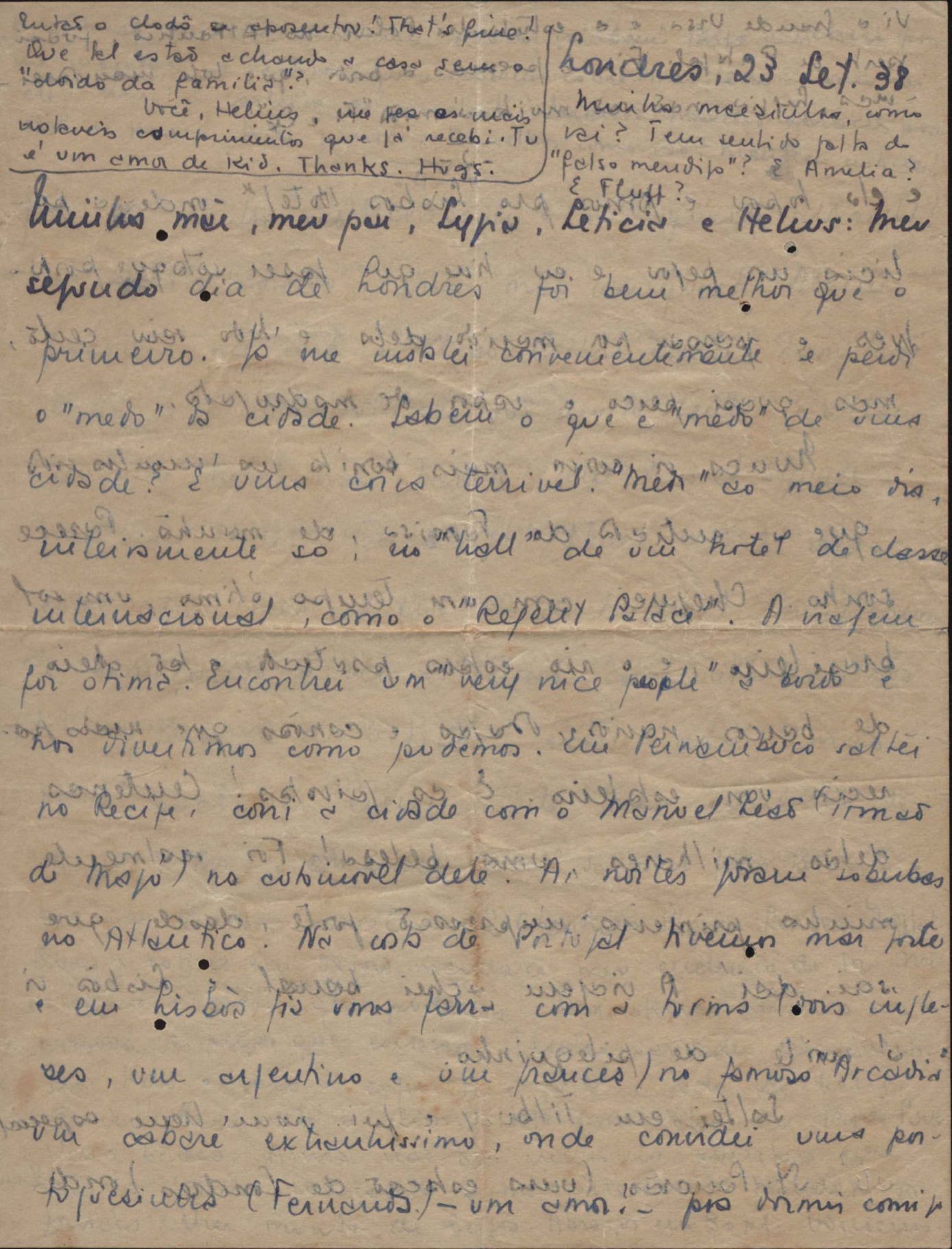 Solicitação de envio de documentos. Notícias sobre a sua vida pessoal. Pergunta sobre o irmão, Helius de Moraes. Felicitações pelo aniversário de seu filho, Pedro de Mello Moraes. Pedido de envio de jornais por intermédio de sua irmã, Lygia Cruz de Moraes. Na carta de Oxford, de 22 mar. 1939, VM comunica a seus pais, amigos e parentes seu casamento, por procuração, com Beatriz Azevedo de Mello Moraes. Comentários sobre os amigos e encontros com Afrânio de Melo Franco, Baden Powell, Carlos Drummond de Andrade, Beatriz Azevedo de Mello Moraes, Custódio José de Melo, Di Cavalcanti, Fernando Sabino, Greta Garbo, Manuel Bandeira, Pablo Neruda, Rodrigo de Melo Franco, Rubem Braga, Tom Jobim entre outros. Considerações sobre lançamento e venda de seus livros. Notícias sobre a vida familiar. Lydia Cruz de Moraes faz comentários sobre os relacionamentos amorosos do filho, VM. Felicitações pelos aniversários de VM e de seu neto, Pedro de Mello Moraes. Preocupação com a saúde do filho, VM. Notícia sobre a publicação de crônicas. Comentário sobre a separação de VM e Beatriz Azevedo de Mello Moraes. Comentário sobre viagem feita a Belo Horizonte. Questionamento sobre o retorno de Helius de Moraes ao Brasil. Comentário sobre a candidatura de Cristiano Machado a Presidente da República. Considerações sobre o falecimento do pai e da avó de VM, Maria Conceição. Cumprimentos pelo poema "Pátria minha". Recomendações aos amigos: Aníbal Machado, Mário Melo, Ary Franco, José Artur, Pedro Nava, Guilherme Souto entre outros.