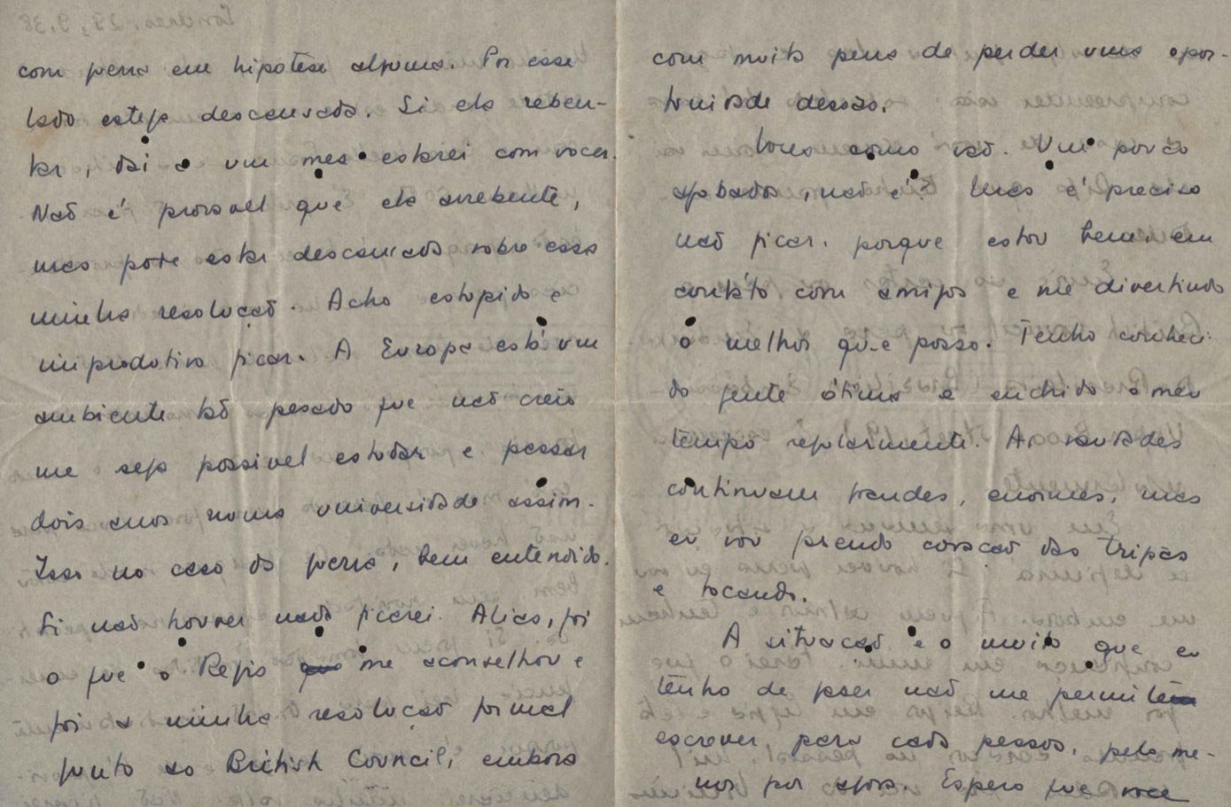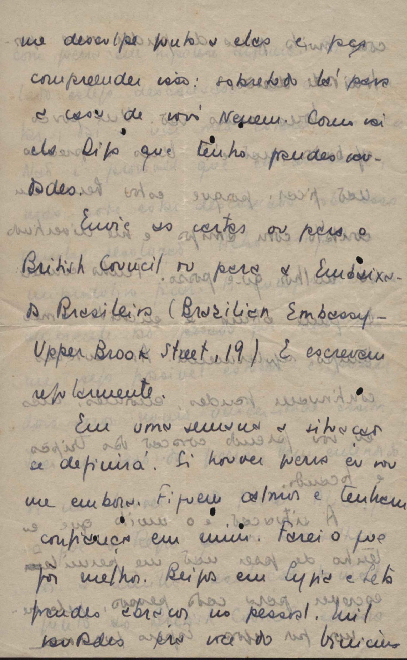 Solicitação de envio de documentos. Notícias sobre a sua vida pessoal. Pergunta sobre o irmão, Helius de Moraes. Felicitações pelo aniversário de seu filho, Pedro de Mello Moraes. Pedido de envio de jornais por intermédio de sua irmã, Lygia Cruz de Moraes. Na carta de Oxford, de 22 mar. 1939, VM comunica a seus pais, amigos e parentes seu casamento, por procuração, com Beatriz Azevedo de Mello Moraes. Comentários sobre os amigos e encontros com Afrânio de Melo Franco, Baden Powell, Carlos Drummond de Andrade, Beatriz Azevedo de Mello Moraes, Custódio José de Melo, Di Cavalcanti, Fernando Sabino, Greta Garbo, Manuel Bandeira, Pablo Neruda, Rodrigo de Melo Franco, Rubem Braga, Tom Jobim entre outros. Considerações sobre lançamento e venda de seus livros. Notícias sobre a vida familiar. Lydia Cruz de Moraes faz comentários sobre os relacionamentos amorosos do filho, VM. Felicitações pelos aniversários de VM e de seu neto, Pedro de Mello Moraes. Preocupação com a saúde do filho, VM. Notícia sobre a publicação de crônicas. Comentário sobre a separação de VM e Beatriz Azevedo de Mello Moraes. Comentário sobre viagem feita a Belo Horizonte. Questionamento sobre o retorno de Helius de Moraes ao Brasil. Comentário sobre a candidatura de Cristiano Machado a Presidente da República. Considerações sobre o falecimento do pai e da avó de VM, Maria Conceição. Cumprimentos pelo poema "Pátria minha". Recomendações aos amigos: Aníbal Machado, Mário Melo, Ary Franco, José Artur, Pedro Nava, Guilherme Souto entre outros.