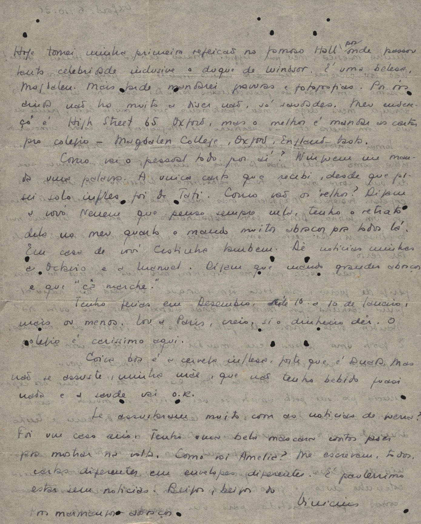 Solicitação de envio de documentos. Notícias sobre a sua vida pessoal. Pergunta sobre o irmão, Helius de Moraes. Felicitações pelo aniversário de seu filho, Pedro de Mello Moraes. Pedido de envio de jornais por intermédio de sua irmã, Lygia Cruz de Moraes. Na carta de Oxford, de 22 mar. 1939, VM comunica a seus pais, amigos e parentes seu casamento, por procuração, com Beatriz Azevedo de Mello Moraes. Comentários sobre os amigos e encontros com Afrânio de Melo Franco, Baden Powell, Carlos Drummond de Andrade, Beatriz Azevedo de Mello Moraes, Custódio José de Melo, Di Cavalcanti, Fernando Sabino, Greta Garbo, Manuel Bandeira, Pablo Neruda, Rodrigo de Melo Franco, Rubem Braga, Tom Jobim entre outros. Considerações sobre lançamento e venda de seus livros. Notícias sobre a vida familiar. Lydia Cruz de Moraes faz comentários sobre os relacionamentos amorosos do filho, VM. Felicitações pelos aniversários de VM e de seu neto, Pedro de Mello Moraes. Preocupação com a saúde do filho, VM. Notícia sobre a publicação de crônicas. Comentário sobre a separação de VM e Beatriz Azevedo de Mello Moraes. Comentário sobre viagem feita a Belo Horizonte. Questionamento sobre o retorno de Helius de Moraes ao Brasil. Comentário sobre a candidatura de Cristiano Machado a Presidente da República. Considerações sobre o falecimento do pai e da avó de VM, Maria Conceição. Cumprimentos pelo poema "Pátria minha". Recomendações aos amigos: Aníbal Machado, Mário Melo, Ary Franco, José Artur, Pedro Nava, Guilherme Souto entre outros.