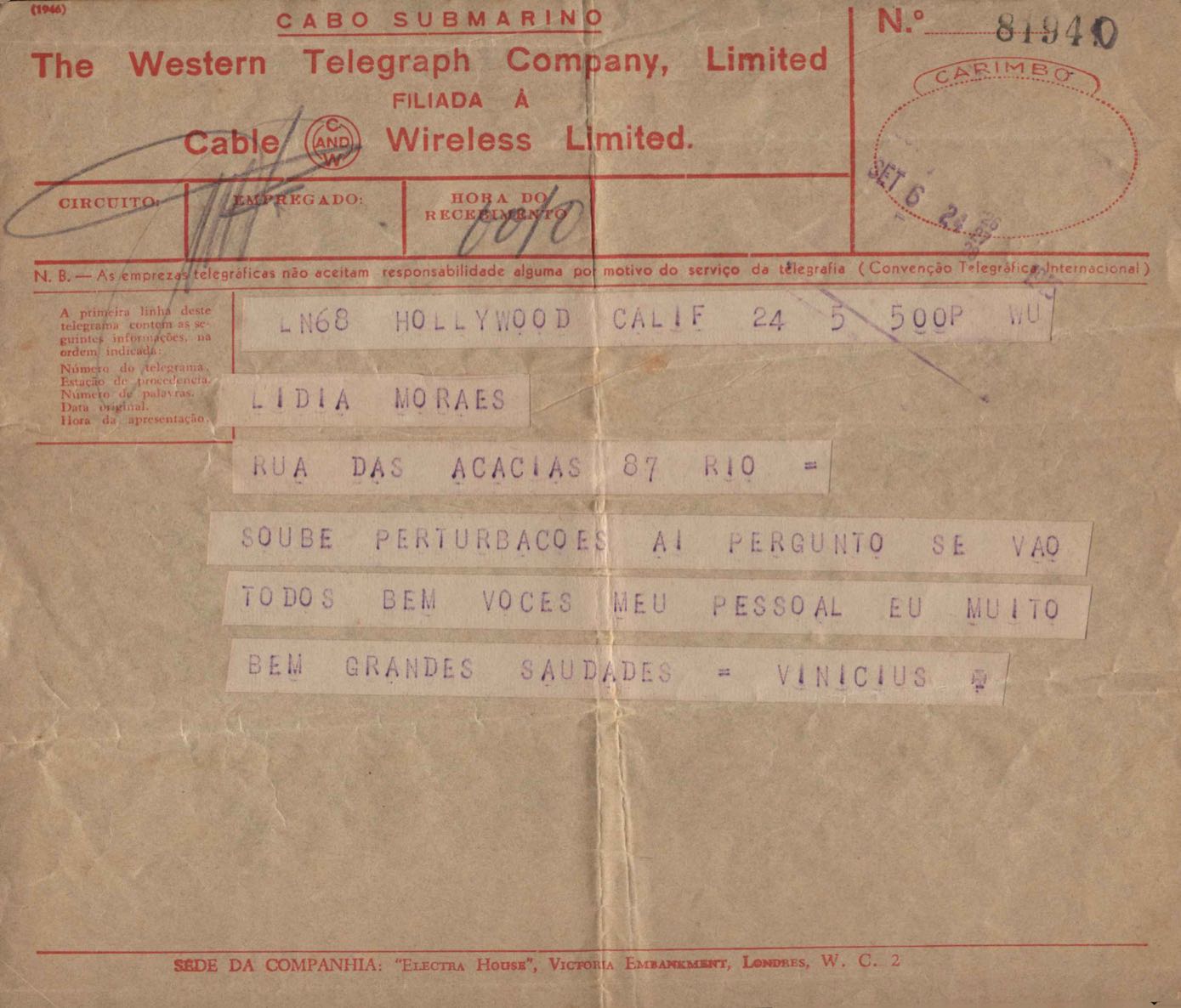 Solicitação de envio de documentos. Notícias sobre a sua vida pessoal. Pergunta sobre o irmão, Helius de Moraes. Felicitações pelo aniversário de seu filho, Pedro de Mello Moraes. Pedido de envio de jornais por intermédio de sua irmã, Lygia Cruz de Moraes. Na carta de Oxford, de 22 mar. 1939, VM comunica a seus pais, amigos e parentes seu casamento, por procuração, com Beatriz Azevedo de Mello Moraes. Comentários sobre os amigos e encontros com Afrânio de Melo Franco, Baden Powell, Carlos Drummond de Andrade, Beatriz Azevedo de Mello Moraes, Custódio José de Melo, Di Cavalcanti, Fernando Sabino, Greta Garbo, Manuel Bandeira, Pablo Neruda, Rodrigo de Melo Franco, Rubem Braga, Tom Jobim entre outros. Considerações sobre lançamento e venda de seus livros. Notícias sobre a vida familiar. Lydia Cruz de Moraes faz comentários sobre os relacionamentos amorosos do filho, VM. Felicitações pelos aniversários de VM e de seu neto, Pedro de Mello Moraes. Preocupação com a saúde do filho, VM. Notícia sobre a publicação de crônicas. Comentário sobre a separação de VM e Beatriz Azevedo de Mello Moraes. Comentário sobre viagem feita a Belo Horizonte. Questionamento sobre o retorno de Helius de Moraes ao Brasil. Comentário sobre a candidatura de Cristiano Machado a Presidente da República. Considerações sobre o falecimento do pai e da avó de VM, Maria Conceição. Cumprimentos pelo poema "Pátria minha". Recomendações aos amigos: Aníbal Machado, Mário Melo, Ary Franco, José Artur, Pedro Nava, Guilherme Souto entre outros.