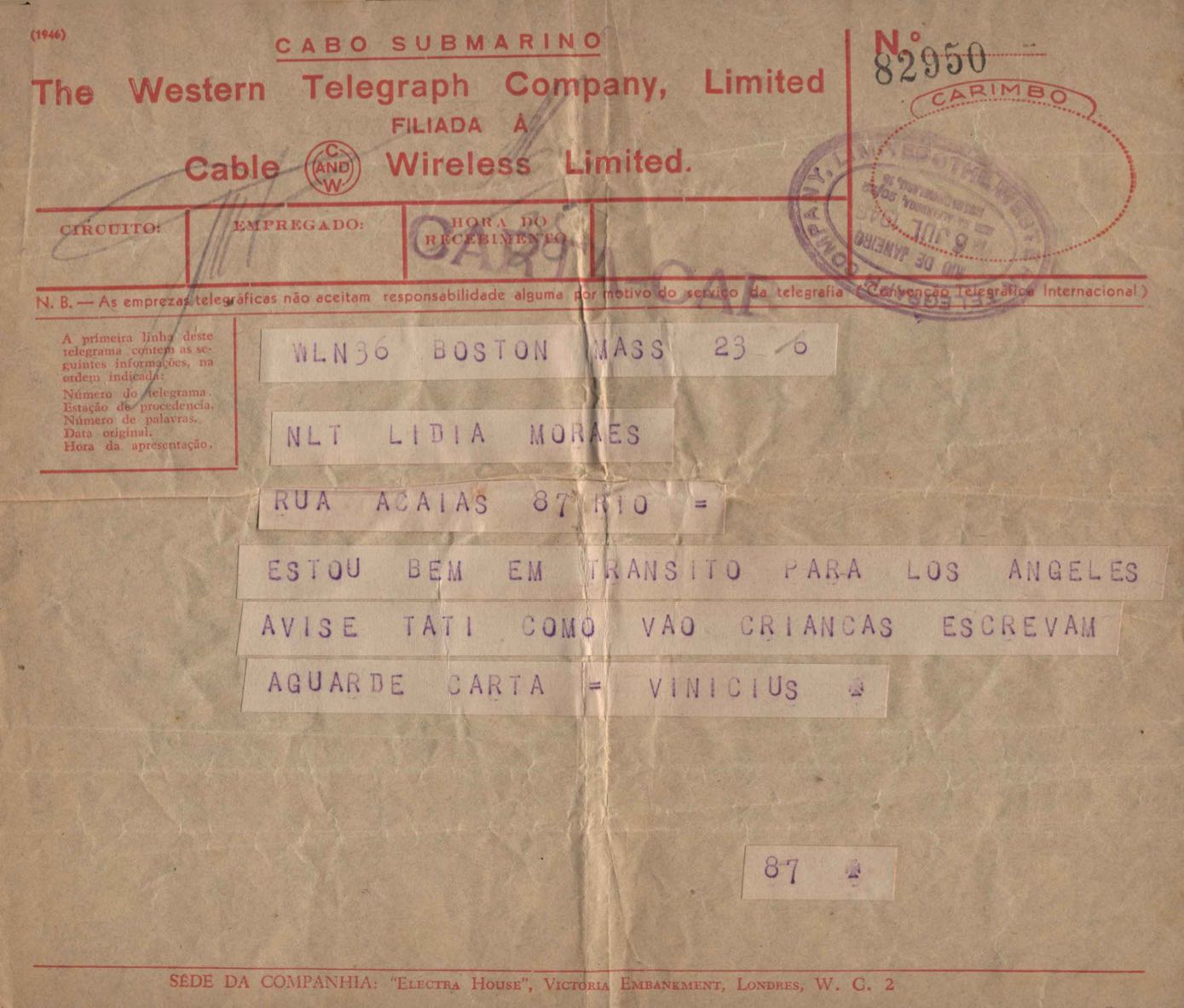 Telegrama a Lydia Cruz de Moraes
