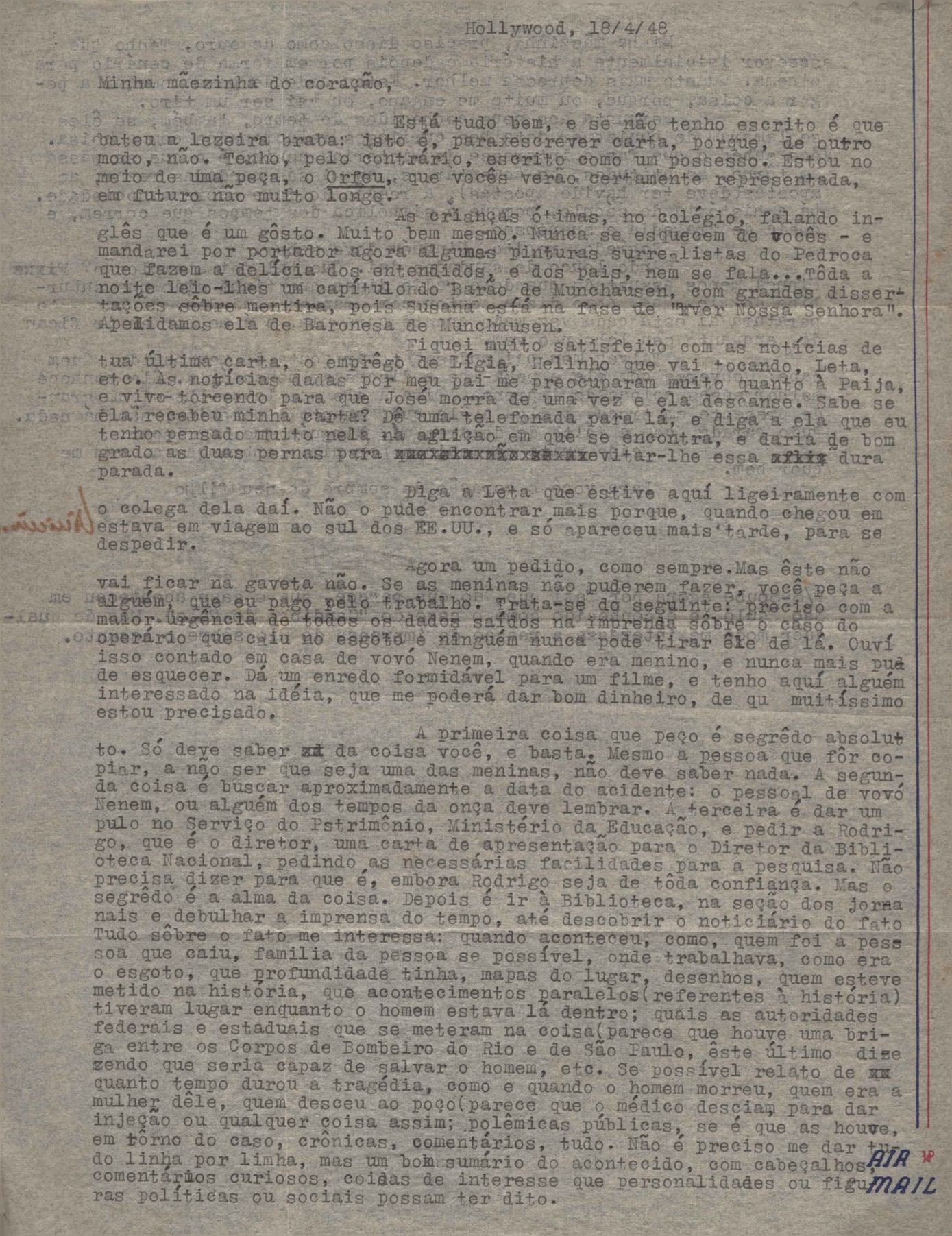Solicitação de envio de documentos. Notícias sobre a sua vida pessoal. Pergunta sobre o irmão, Helius de Moraes. Felicitações pelo aniversário de seu filho, Pedro de Mello Moraes. Pedido de envio de jornais por intermédio de sua irmã, Lygia Cruz de Moraes. Na carta de Oxford, de 22 mar. 1939, VM comunica a seus pais, amigos e parentes seu casamento, por procuração, com Beatriz Azevedo de Mello Moraes. Comentários sobre os amigos e encontros com Afrânio de Melo Franco, Baden Powell, Carlos Drummond de Andrade, Beatriz Azevedo de Mello Moraes, Custódio José de Melo, Di Cavalcanti, Fernando Sabino, Greta Garbo, Manuel Bandeira, Pablo Neruda, Rodrigo de Melo Franco, Rubem Braga, Tom Jobim entre outros. Considerações sobre lançamento e venda de seus livros. Notícias sobre a vida familiar. Lydia Cruz de Moraes faz comentários sobre os relacionamentos amorosos do filho, VM. Felicitações pelos aniversários de VM e de seu neto, Pedro de Mello Moraes. Preocupação com a saúde do filho, VM. Notícia sobre a publicação de crônicas. Comentário sobre a separação de VM e Beatriz Azevedo de Mello Moraes. Comentário sobre viagem feita a Belo Horizonte. Questionamento sobre o retorno de Helius de Moraes ao Brasil. Comentário sobre a candidatura de Cristiano Machado a Presidente da República. Considerações sobre o falecimento do pai e da avó de VM, Maria Conceição. Cumprimentos pelo poema "Pátria minha". Recomendações aos amigos: Aníbal Machado, Mário Melo, Ary Franco, José Artur, Pedro Nava, Guilherme Souto entre outros.