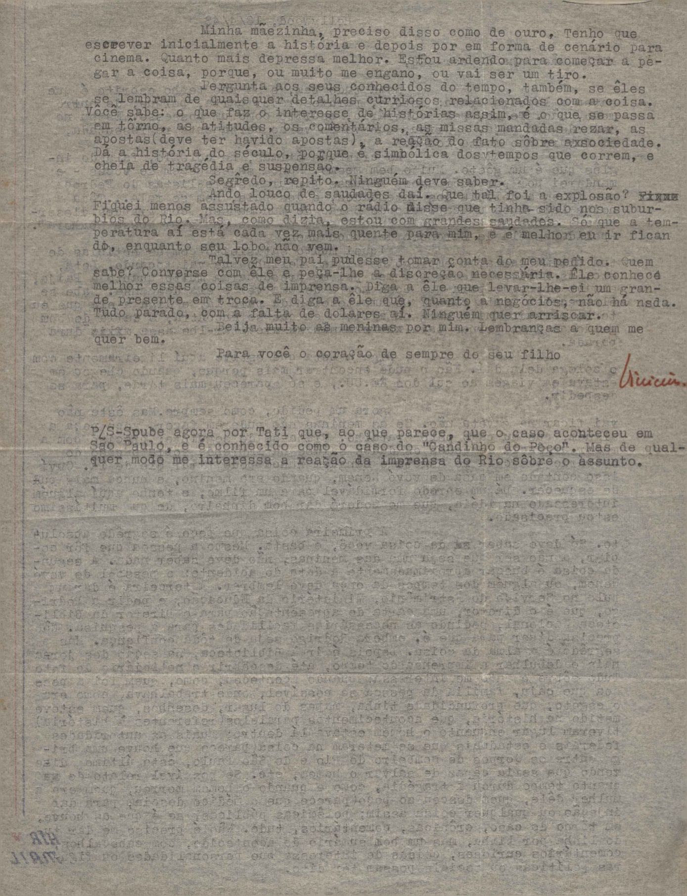 Correspondências entre VM e sua mãe, Lydia Cruz de Moraes. Há cartas sem data e algumas com notas para familiares. Em alguns casos há somente o envelope.