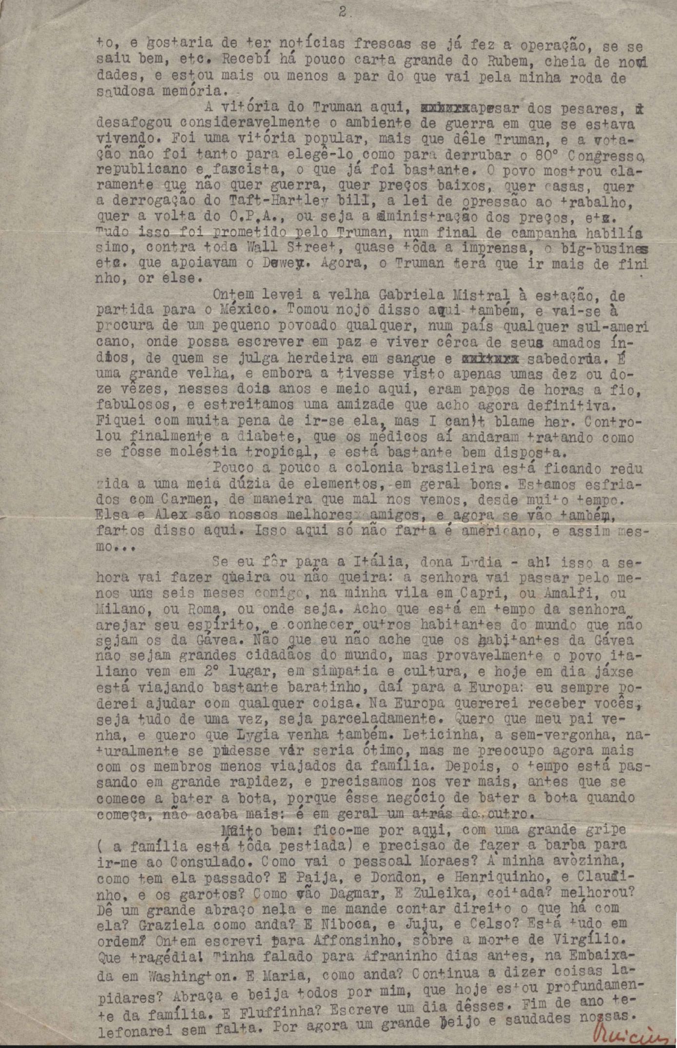 Solicitação de envio de documentos. Notícias sobre a sua vida pessoal. Pergunta sobre o irmão, Helius de Moraes. Felicitações pelo aniversário de seu filho, Pedro de Mello Moraes. Pedido de envio de jornais por intermédio de sua irmã, Lygia Cruz de Moraes. Na carta de Oxford, de 22 mar. 1939, VM comunica a seus pais, amigos e parentes seu casamento, por procuração, com Beatriz Azevedo de Mello Moraes. Comentários sobre os amigos e encontros com Afrânio de Melo Franco, Baden Powell, Carlos Drummond de Andrade, Beatriz Azevedo de Mello Moraes, Custódio José de Melo, Di Cavalcanti, Fernando Sabino, Greta Garbo, Manuel Bandeira, Pablo Neruda, Rodrigo de Melo Franco, Rubem Braga, Tom Jobim entre outros. Considerações sobre lançamento e venda de seus livros. Notícias sobre a vida familiar. Lydia Cruz de Moraes faz comentários sobre os relacionamentos amorosos do filho, VM. Felicitações pelos aniversários de VM e de seu neto, Pedro de Mello Moraes. Preocupação com a saúde do filho, VM. Notícia sobre a publicação de crônicas. Comentário sobre a separação de VM e Beatriz Azevedo de Mello Moraes. Comentário sobre viagem feita a Belo Horizonte. Questionamento sobre o retorno de Helius de Moraes ao Brasil. Comentário sobre a candidatura de Cristiano Machado a Presidente da República. Considerações sobre o falecimento do pai e da avó de VM, Maria Conceição. Cumprimentos pelo poema "Pátria minha". Recomendações aos amigos: Aníbal Machado, Mário Melo, Ary Franco, José Artur, Pedro Nava, Guilherme Souto entre outros.