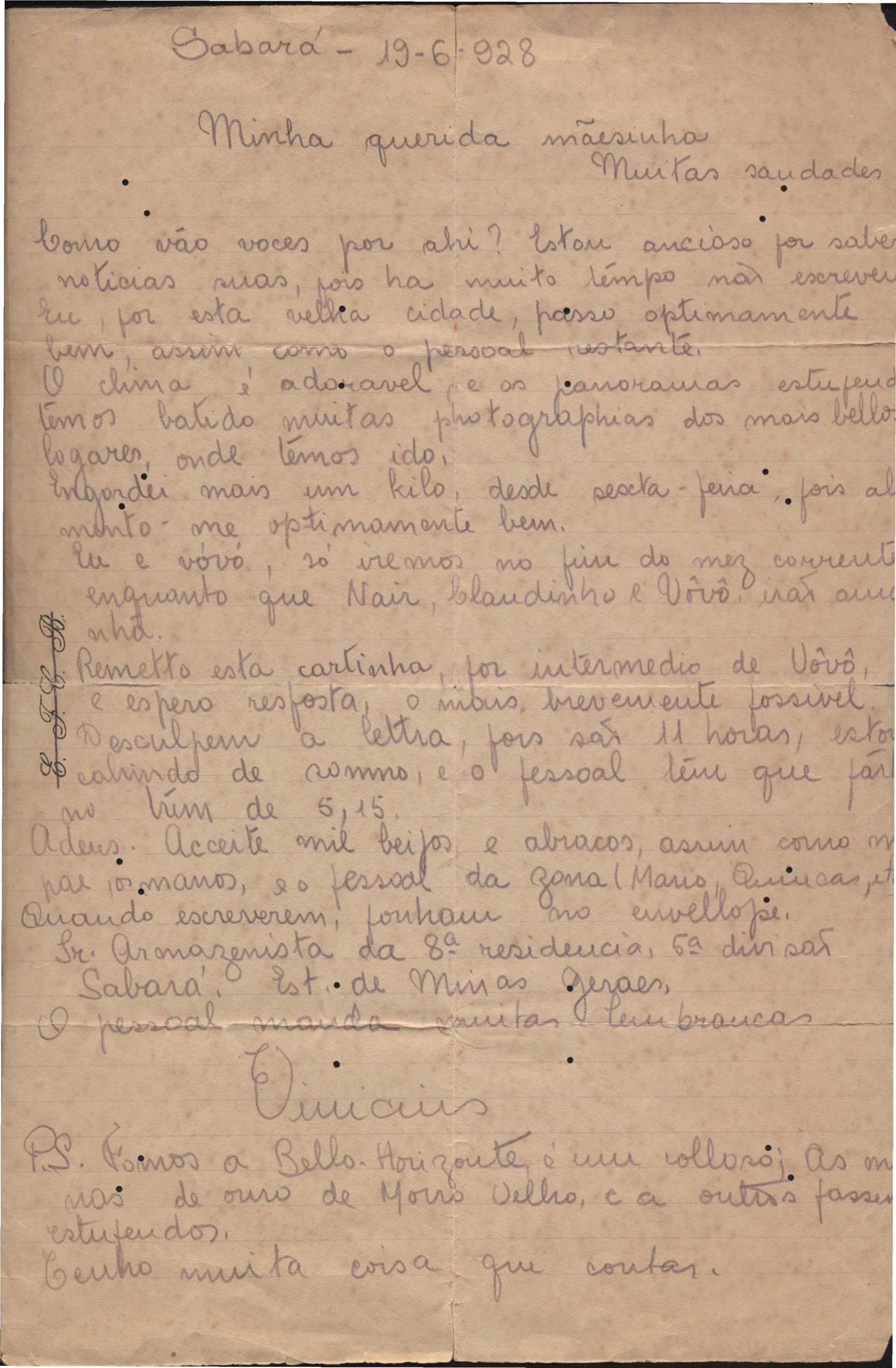 Correspondências entre VM e sua mãe, Lydia Cruz de Moraes. Há cartas sem data e algumas com notas para familiares. Em alguns casos há somente o envelope.