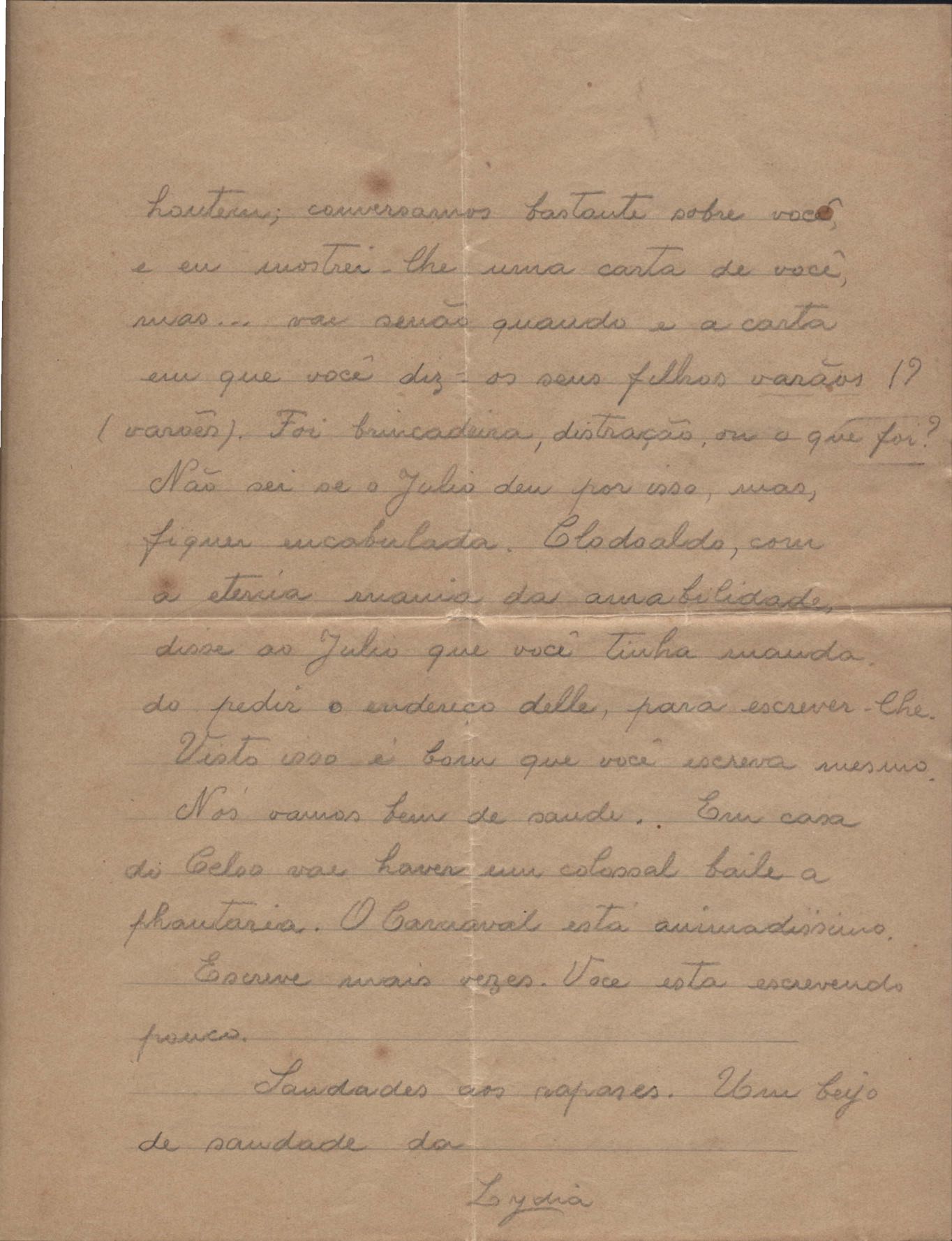 Correspondências entre VM e sua mãe, Lydia Cruz de Moraes. Há cartas sem data e algumas com notas para familiares. Em alguns casos há somente o envelope.