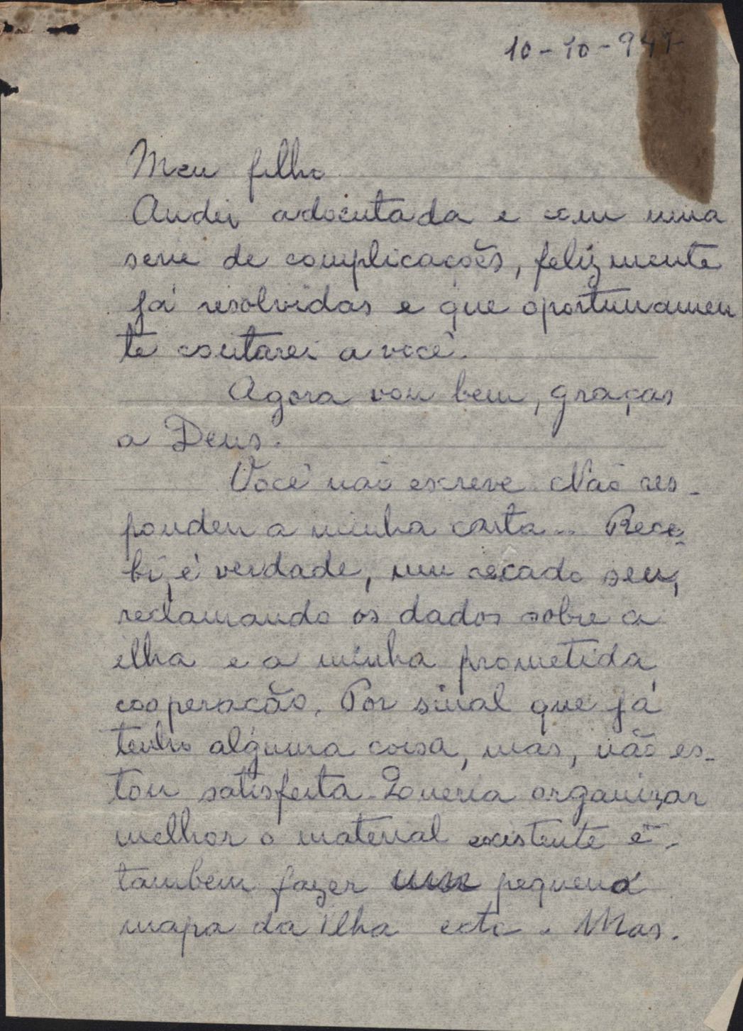 Solicitação de envio de documentos. Notícias sobre a sua vida pessoal. Pergunta sobre o irmão, Helius de Moraes. Felicitações pelo aniversário de seu filho, Pedro de Mello Moraes. Pedido de envio de jornais por intermédio de sua irmã, Lygia Cruz de Moraes. Na carta de Oxford, de 22 mar. 1939, VM comunica a seus pais, amigos e parentes seu casamento, por procuração, com Beatriz Azevedo de Mello Moraes. Comentários sobre os amigos e encontros com Afrânio de Melo Franco, Baden Powell, Carlos Drummond de Andrade, Beatriz Azevedo de Mello Moraes, Custódio José de Melo, Di Cavalcanti, Fernando Sabino, Greta Garbo, Manuel Bandeira, Pablo Neruda, Rodrigo de Melo Franco, Rubem Braga, Tom Jobim entre outros. Considerações sobre lançamento e venda de seus livros. Notícias sobre a vida familiar. Lydia Cruz de Moraes faz comentários sobre os relacionamentos amorosos do filho, VM. Felicitações pelos aniversários de VM e de seu neto, Pedro de Mello Moraes. Preocupação com a saúde do filho, VM. Notícia sobre a publicação de crônicas. Comentário sobre a separação de VM e Beatriz Azevedo de Mello Moraes. Comentário sobre viagem feita a Belo Horizonte. Questionamento sobre o retorno de Helius de Moraes ao Brasil. Comentário sobre a candidatura de Cristiano Machado a Presidente da República. Considerações sobre o falecimento do pai e da avó de VM, Maria Conceição. Cumprimentos pelo poema "Pátria minha". Recomendações aos amigos: Aníbal Machado, Mário Melo, Ary Franco, José Artur, Pedro Nava, Guilherme Souto entre outros.