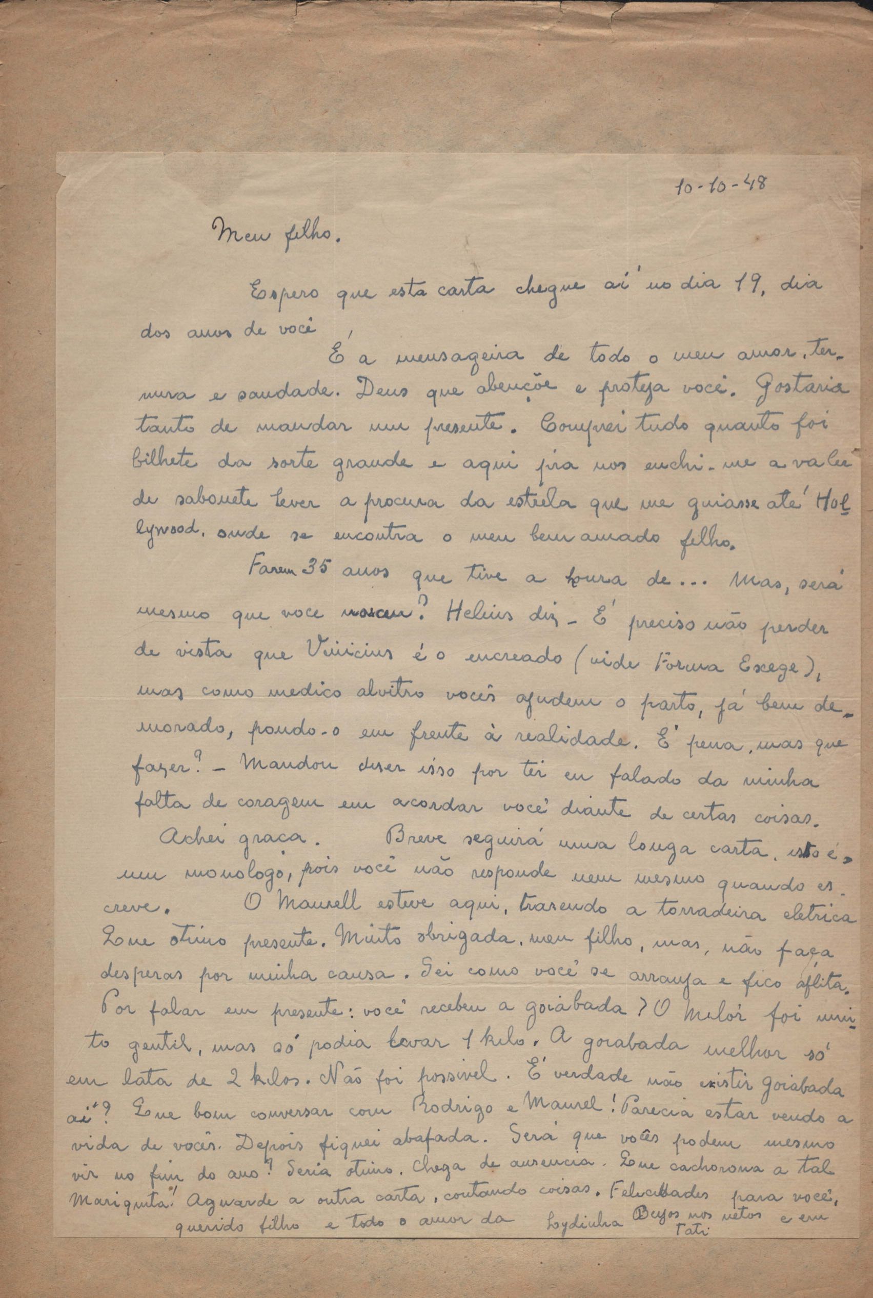 Correspondências entre VM e sua mãe, Lydia Cruz de Moraes. Há cartas sem data e algumas com notas para familiares. Em alguns casos há somente o envelope.