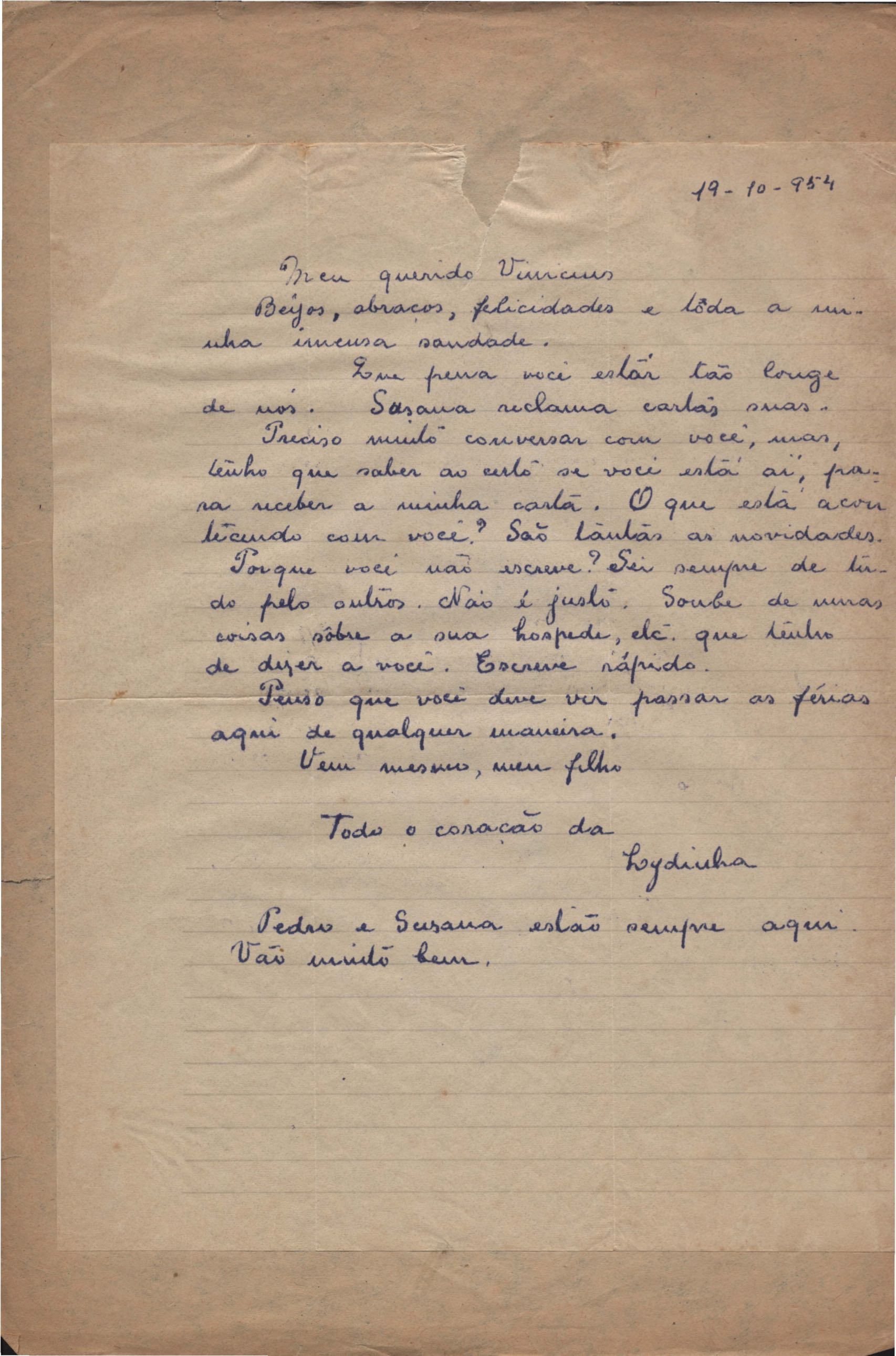 Correspondências entre VM e sua mãe, Lydia Cruz de Moraes. Há cartas sem data e algumas com notas para familiares. Em alguns casos há somente o envelope.