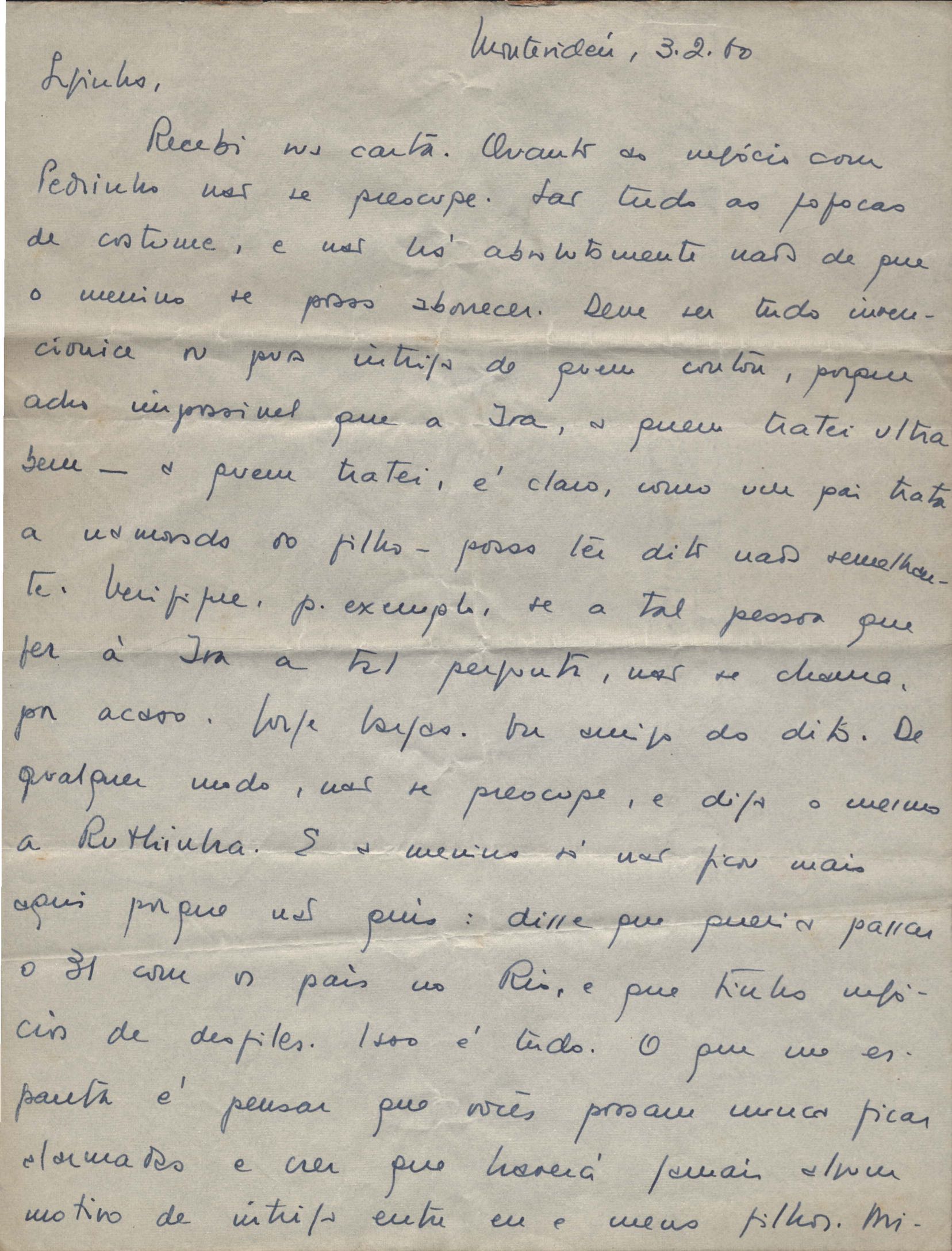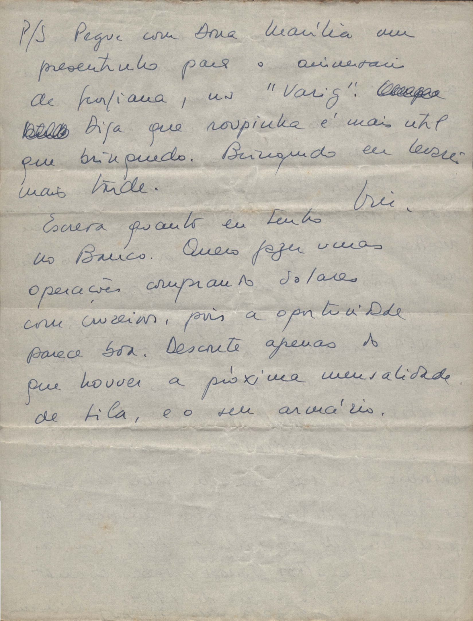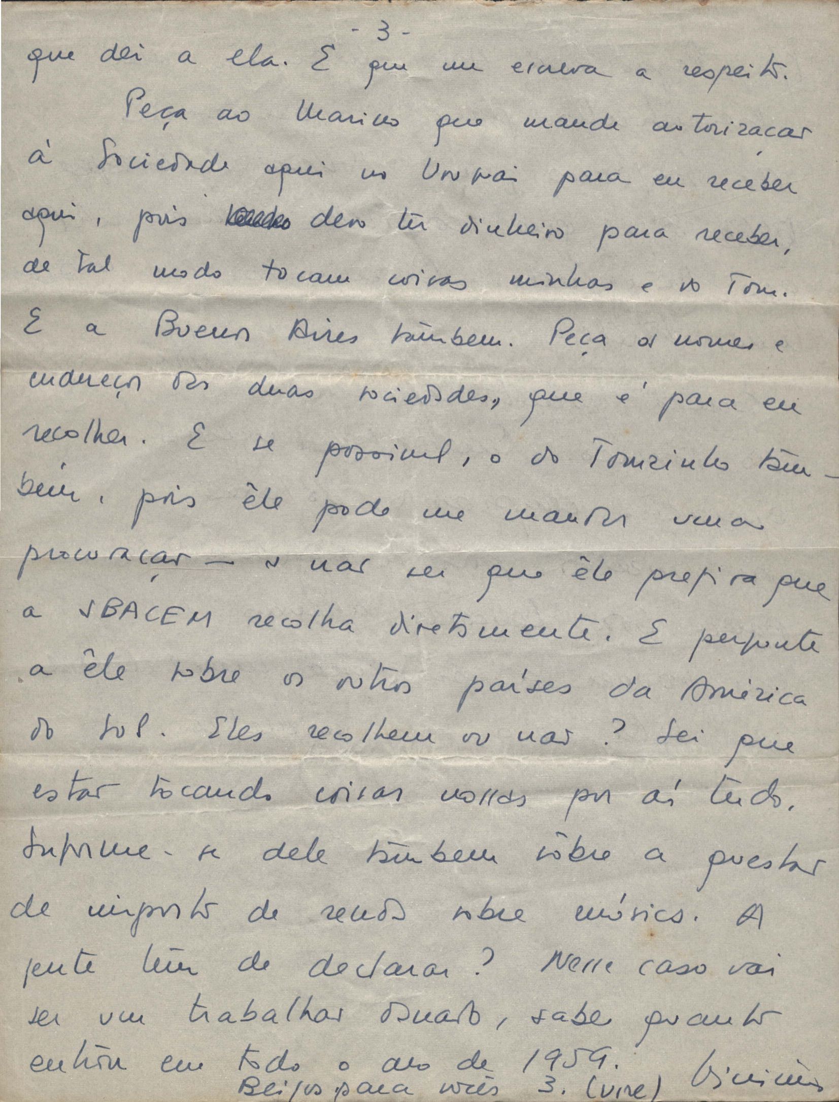 Notícias sobre a vida familiar. Relatório da administração do dinheiro recebido por músicas e livros de VM. Notícias sobre a publicação de crônicas. Comentário sobre o recebimento de direitos autorais e de remuneração do Itamaraty a VM, no exercício de 1963. Notícias sobre o falecimento do escritor Aníbal Machado. Referência aos amigos Afonso Arinos, Agripino Grieco, Celso Souza e Silva, David Mourão Ferreira, Gessy Gesse, João Ribeiro, Manuel Bandeira, Mário Cabral, Nelson Rodrigues, Oscar Niemeyer, Paulo Carneiro, Peregrino Júnior e Peter Keller. Notícias sobre a vida pessoal e familiar. Comentário sobre negócios feitos. Intenção de (gravar) um disco/LP com seus poemas infantis. Referência à organização de seu arquivo pessoal, por sua irmã, Lygia Cruz de Moraes. Publicação de sua obra completa. Consideração a respeito do Festival de Cinema de Cannes. Envio, em anexo, de reportagem sobre VM no exterior. Autorização para sua irmã receber e administrar os recursos provenientes de sua pensão e de seus direitos autorais. Notícias de futuro retorno ao Brasil. Proibição de Pixinguinha para vender sua obra em parceria com VM. Referência a pessoas de sua amizade: Adolfo Bloch, Aníbal Machado, Antônio Bittencourt, Antônio Calado, Antônio Carlos Jobim, Carlos Lacerda, Carlos Ribeiro, Fernando Lobo, Fernando Sabino, Lima Duarte, Lúcia Magalhães, Lúcio Rangel, Mário Cabral, Nora Nei, Otávio Tirso, Pablo Neruda, Paulo Mendes Campos, Pedro Galloti, Waldemar Leite de Oliveira entre outros.