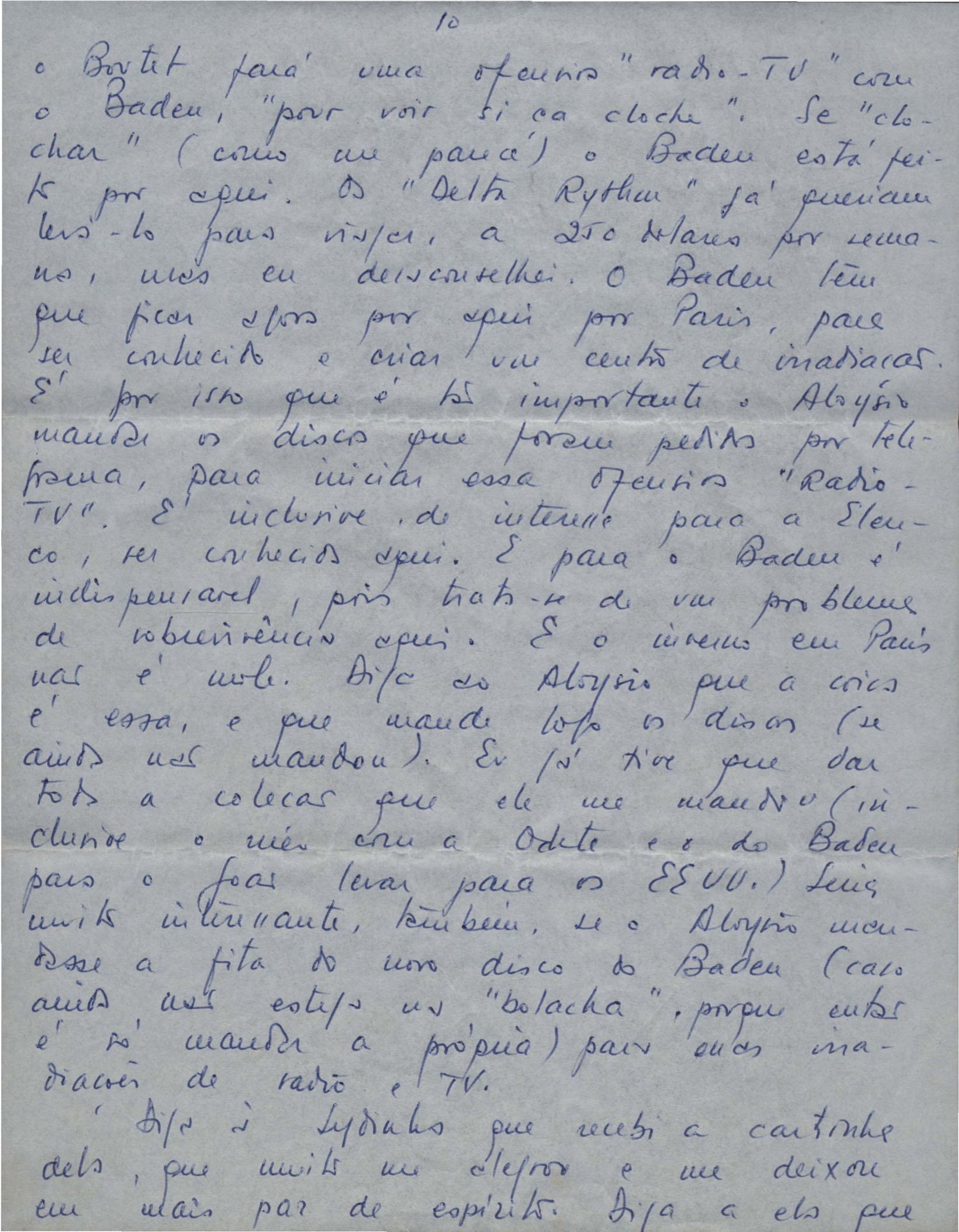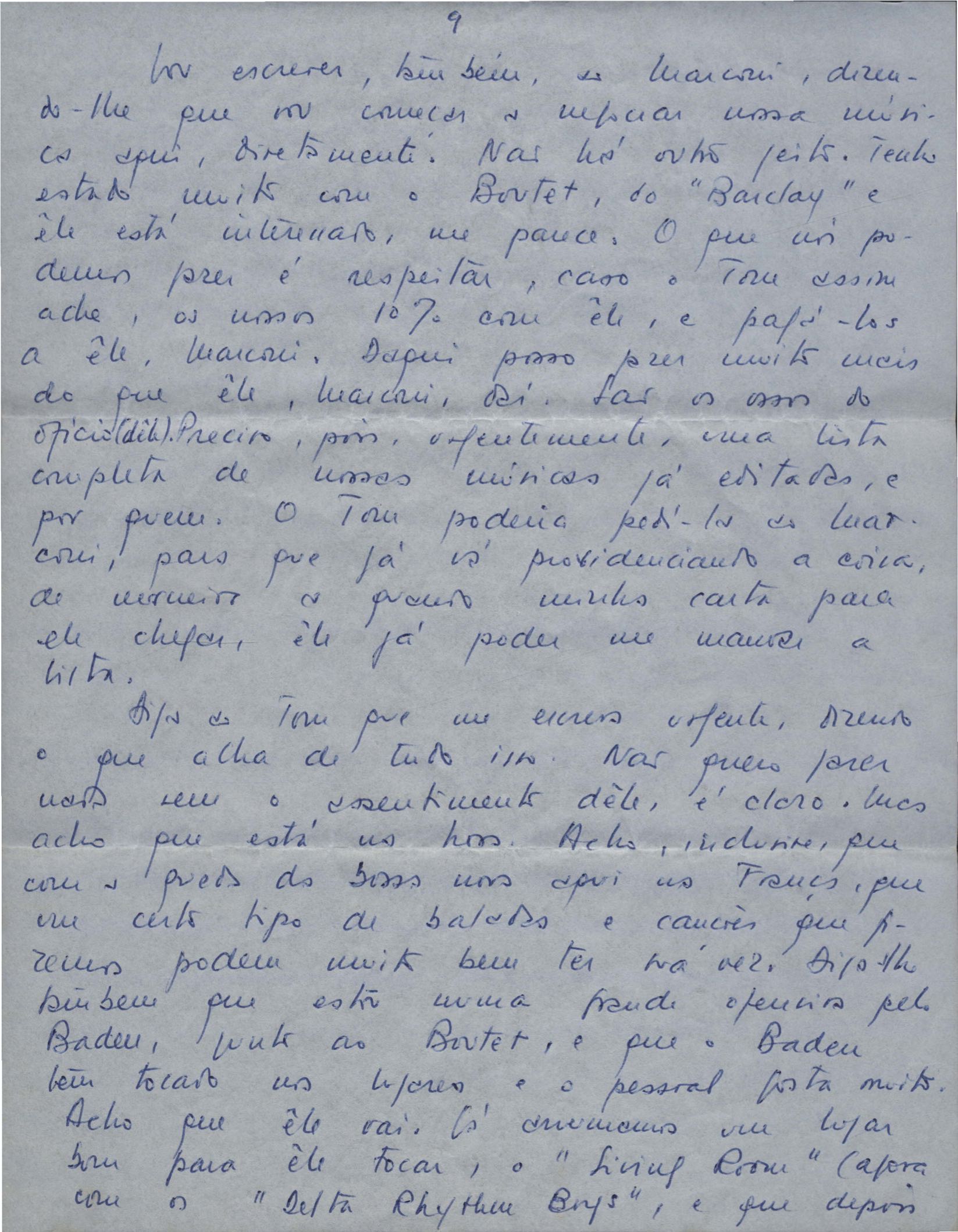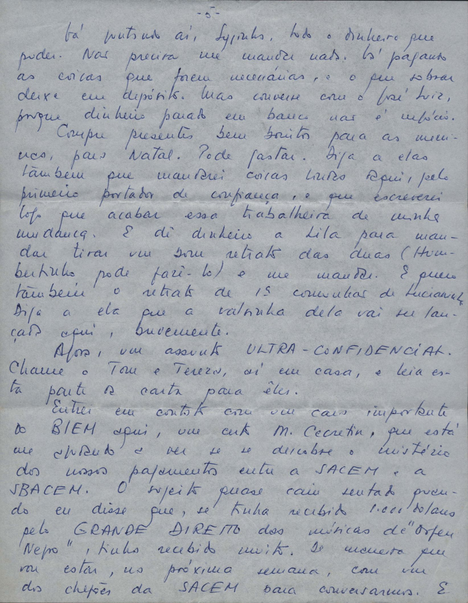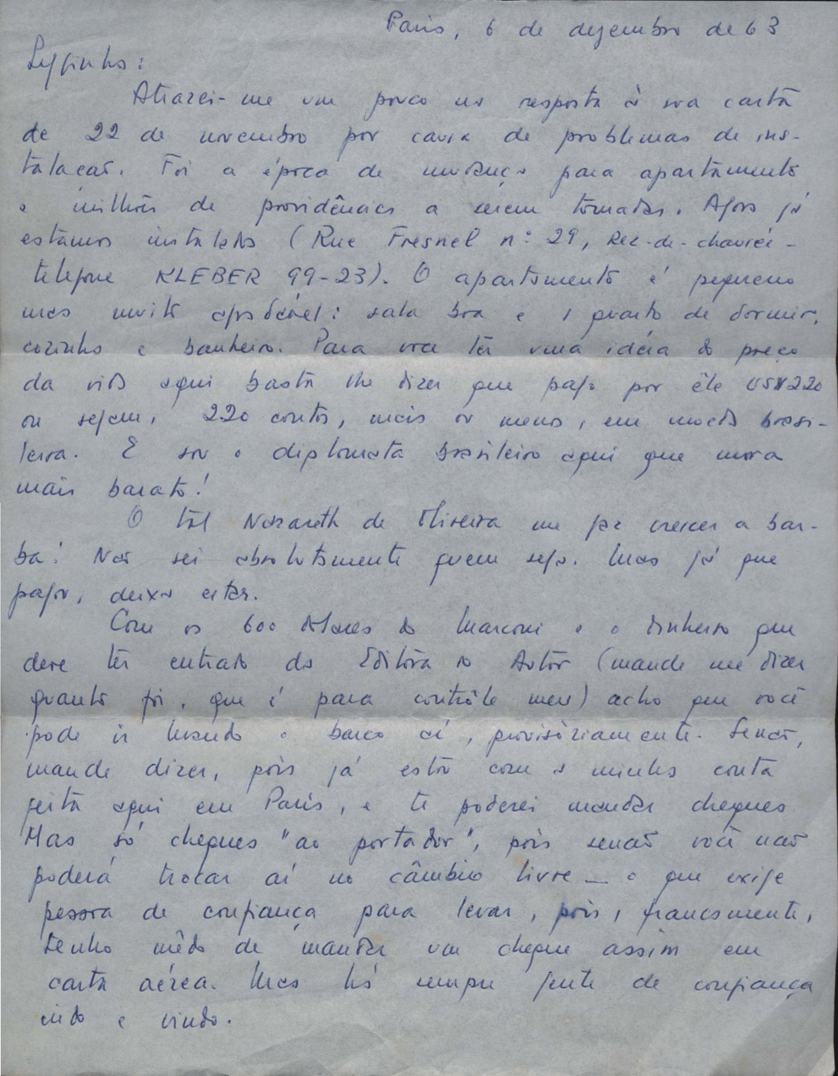 Notícias sobre a vida familiar. Relatório da administração do dinheiro recebido por músicas e livros de VM. Notícias sobre a publicação de crônicas. Comentário sobre o recebimento de direitos autorais e de remuneração do Itamaraty a VM, no exercício de 1963. Notícias sobre o falecimento do escritor Aníbal Machado. Referência aos amigos Afonso Arinos, Agripino Grieco, Celso Souza e Silva, David Mourão Ferreira, Gessy Gesse, João Ribeiro, Manuel Bandeira, Mário Cabral, Nelson Rodrigues, Oscar Niemeyer, Paulo Carneiro, Peregrino Júnior e Peter Keller. Notícias sobre a vida pessoal e familiar. Comentário sobre negócios feitos. Intenção de (gravar) um disco/LP com seus poemas infantis. Referência à organização de seu arquivo pessoal, por sua irmã, Lygia Cruz de Moraes. Publicação de sua obra completa. Consideração a respeito do Festival de Cinema de Cannes. Envio, em anexo, de reportagem sobre VM no exterior. Autorização para sua irmã receber e administrar os recursos provenientes de sua pensão e de seus direitos autorais. Notícias de futuro retorno ao Brasil. Proibição de Pixinguinha para vender sua obra em parceria com VM. Referência a pessoas de sua amizade: Adolfo Bloch, Aníbal Machado, Antônio Bittencourt, Antônio Calado, Antônio Carlos Jobim, Carlos Lacerda, Carlos Ribeiro, Fernando Lobo, Fernando Sabino, Lima Duarte, Lúcia Magalhães, Lúcio Rangel, Mário Cabral, Nora Nei, Otávio Tirso, Pablo Neruda, Paulo Mendes Campos, Pedro Galloti, Waldemar Leite de Oliveira entre outros.