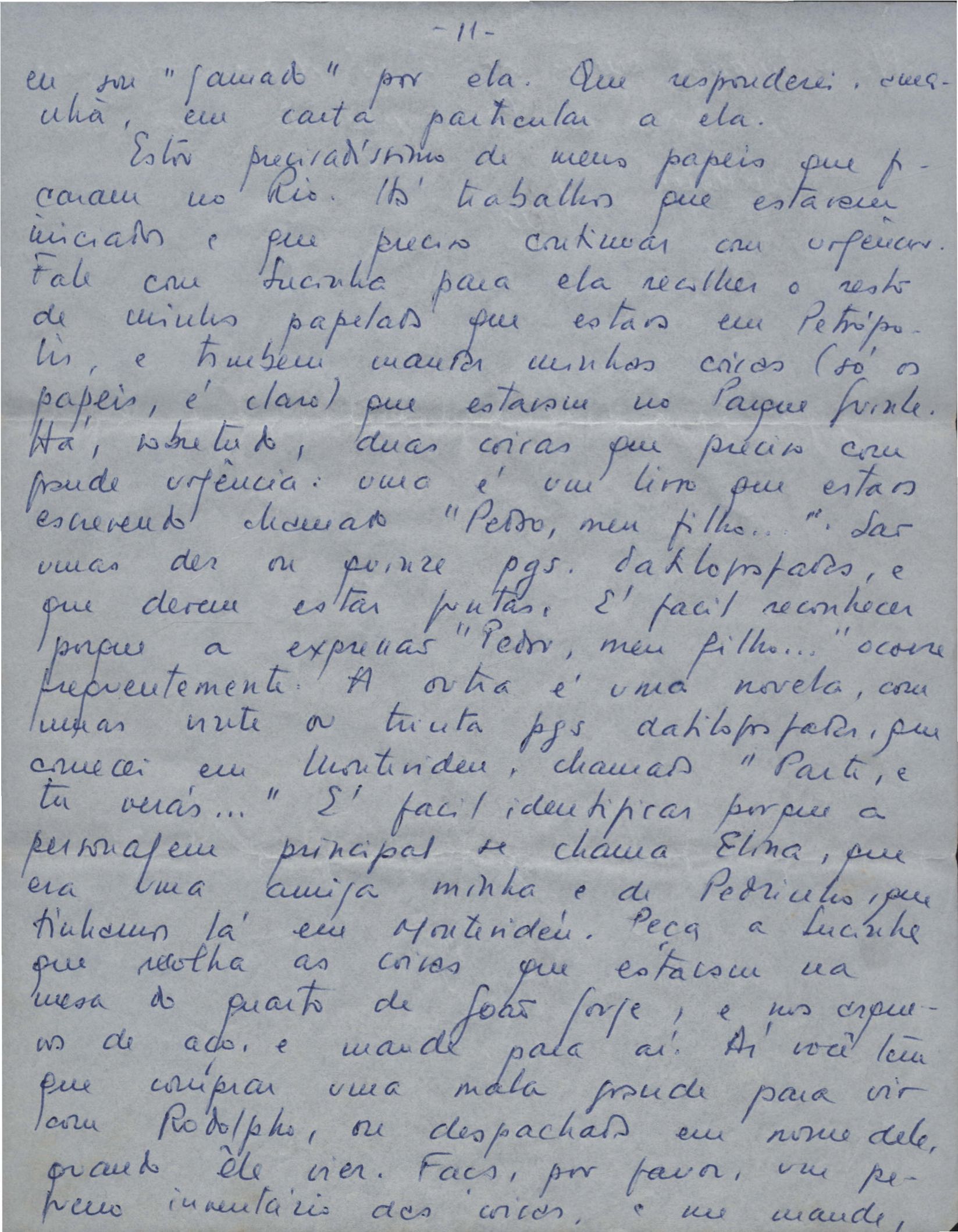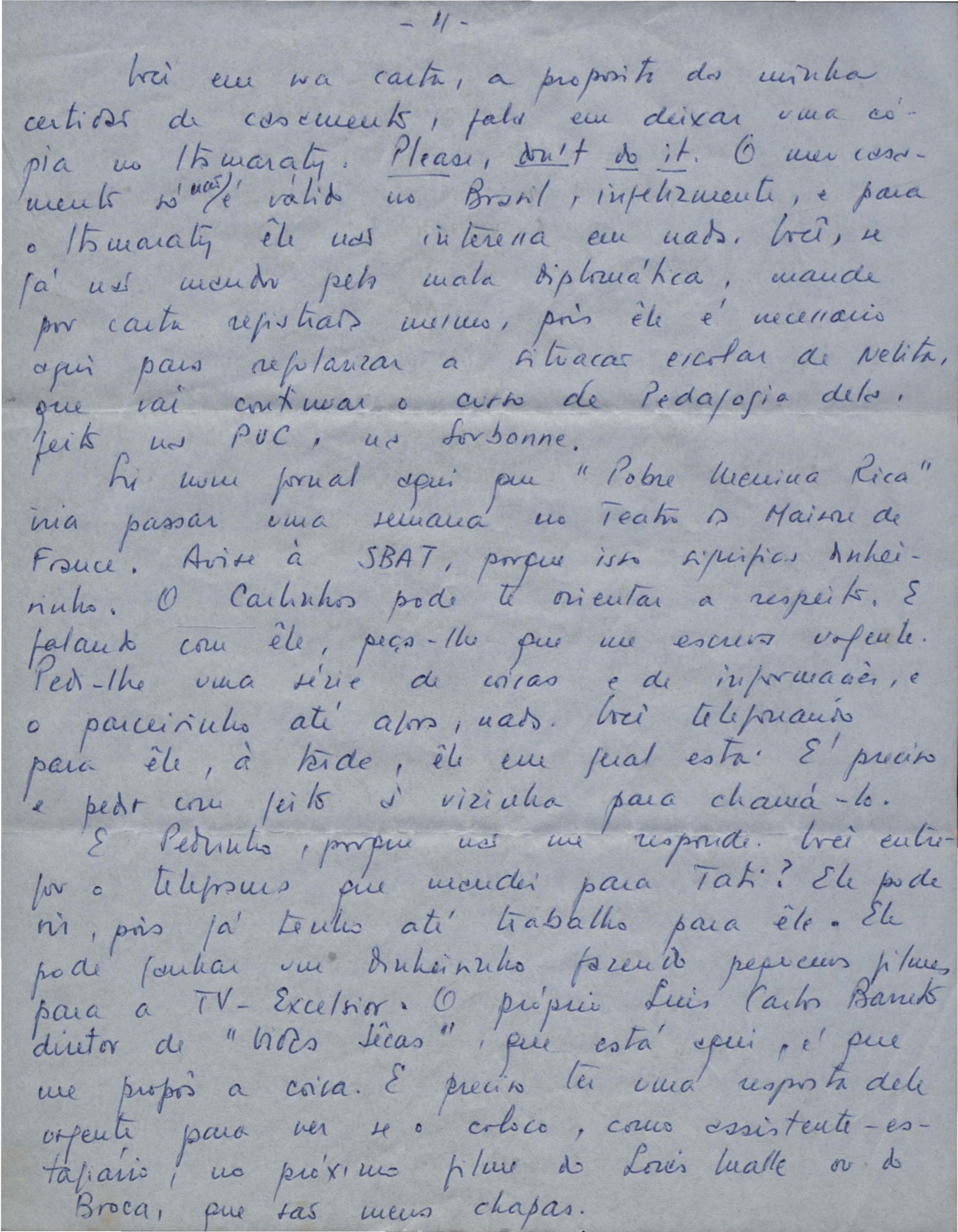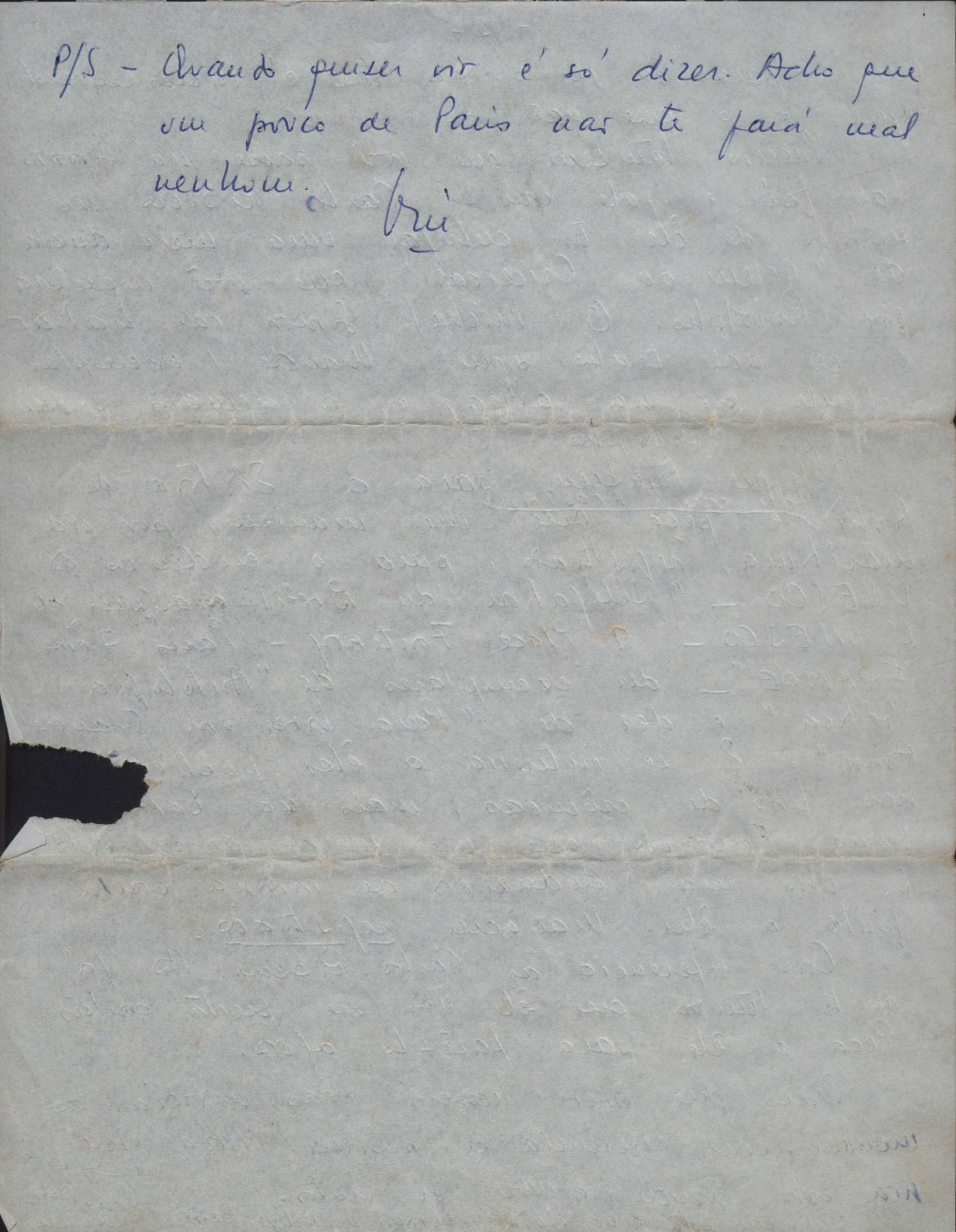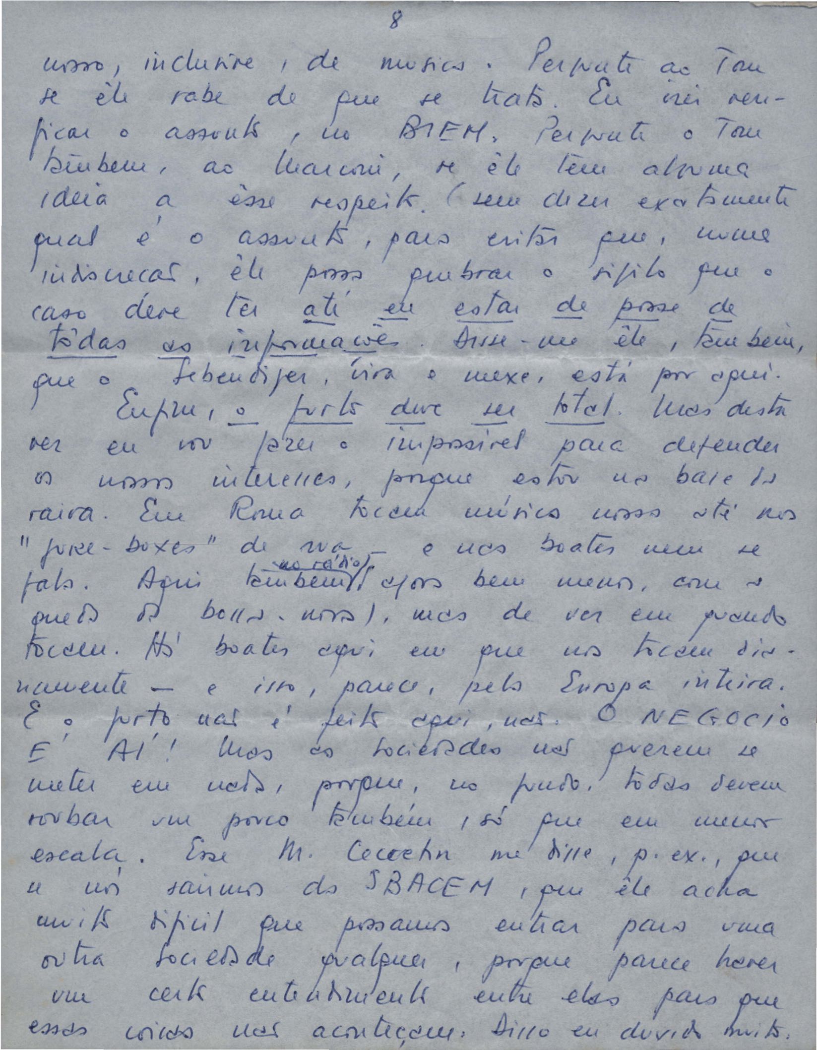 Notícias sobre a vida familiar. Relatório da administração do dinheiro recebido por músicas e livros de VM. Notícias sobre a publicação de crônicas. Comentário sobre o recebimento de direitos autorais e de remuneração do Itamaraty a VM, no exercício de 1963. Notícias sobre o falecimento do escritor Aníbal Machado. Referência aos amigos Afonso Arinos, Agripino Grieco, Celso Souza e Silva, David Mourão Ferreira, Gessy Gesse, João Ribeiro, Manuel Bandeira, Mário Cabral, Nelson Rodrigues, Oscar Niemeyer, Paulo Carneiro, Peregrino Júnior e Peter Keller. Notícias sobre a vida pessoal e familiar. Comentário sobre negócios feitos. Intenção de (gravar) um disco/LP com seus poemas infantis. Referência à organização de seu arquivo pessoal, por sua irmã, Lygia Cruz de Moraes. Publicação de sua obra completa. Consideração a respeito do Festival de Cinema de Cannes. Envio, em anexo, de reportagem sobre VM no exterior. Autorização para sua irmã receber e administrar os recursos provenientes de sua pensão e de seus direitos autorais. Notícias de futuro retorno ao Brasil. Proibição de Pixinguinha para vender sua obra em parceria com VM. Referência a pessoas de sua amizade: Adolfo Bloch, Aníbal Machado, Antônio Bittencourt, Antônio Calado, Antônio Carlos Jobim, Carlos Lacerda, Carlos Ribeiro, Fernando Lobo, Fernando Sabino, Lima Duarte, Lúcia Magalhães, Lúcio Rangel, Mário Cabral, Nora Nei, Otávio Tirso, Pablo Neruda, Paulo Mendes Campos, Pedro Galloti, Waldemar Leite de Oliveira entre outros.