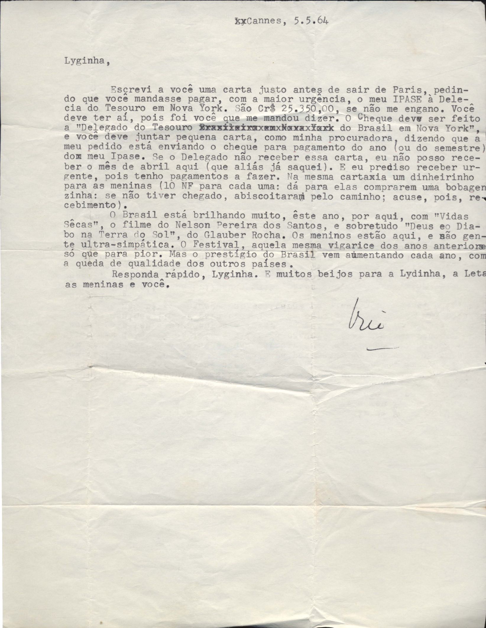 Notícias sobre a vida familiar. Relatório da administração do dinheiro recebido por músicas e livros de VM. Notícias sobre a publicação de crônicas. Comentário sobre o recebimento de direitos autorais e de remuneração do Itamaraty a VM, no exercício de 1963. Notícias sobre o falecimento do escritor Aníbal Machado. Referência aos amigos Afonso Arinos, Agripino Grieco, Celso Souza e Silva, David Mourão Ferreira, Gessy Gesse, João Ribeiro, Manuel Bandeira, Mário Cabral, Nelson Rodrigues, Oscar Niemeyer, Paulo Carneiro, Peregrino Júnior e Peter Keller. Notícias sobre a vida pessoal e familiar. Comentário sobre negócios feitos. Intenção de (gravar) um disco/LP com seus poemas infantis. Referência à organização de seu arquivo pessoal, por sua irmã, Lygia Cruz de Moraes. Publicação de sua obra completa. Consideração a respeito do Festival de Cinema de Cannes. Envio, em anexo, de reportagem sobre VM no exterior. Autorização para sua irmã receber e administrar os recursos provenientes de sua pensão e de seus direitos autorais. Notícias de futuro retorno ao Brasil. Proibição de Pixinguinha para vender sua obra em parceria com VM. Referência a pessoas de sua amizade: Adolfo Bloch, Aníbal Machado, Antônio Bittencourt, Antônio Calado, Antônio Carlos Jobim, Carlos Lacerda, Carlos Ribeiro, Fernando Lobo, Fernando Sabino, Lima Duarte, Lúcia Magalhães, Lúcio Rangel, Mário Cabral, Nora Nei, Otávio Tirso, Pablo Neruda, Paulo Mendes Campos, Pedro Galloti, Waldemar Leite de Oliveira entre outros.