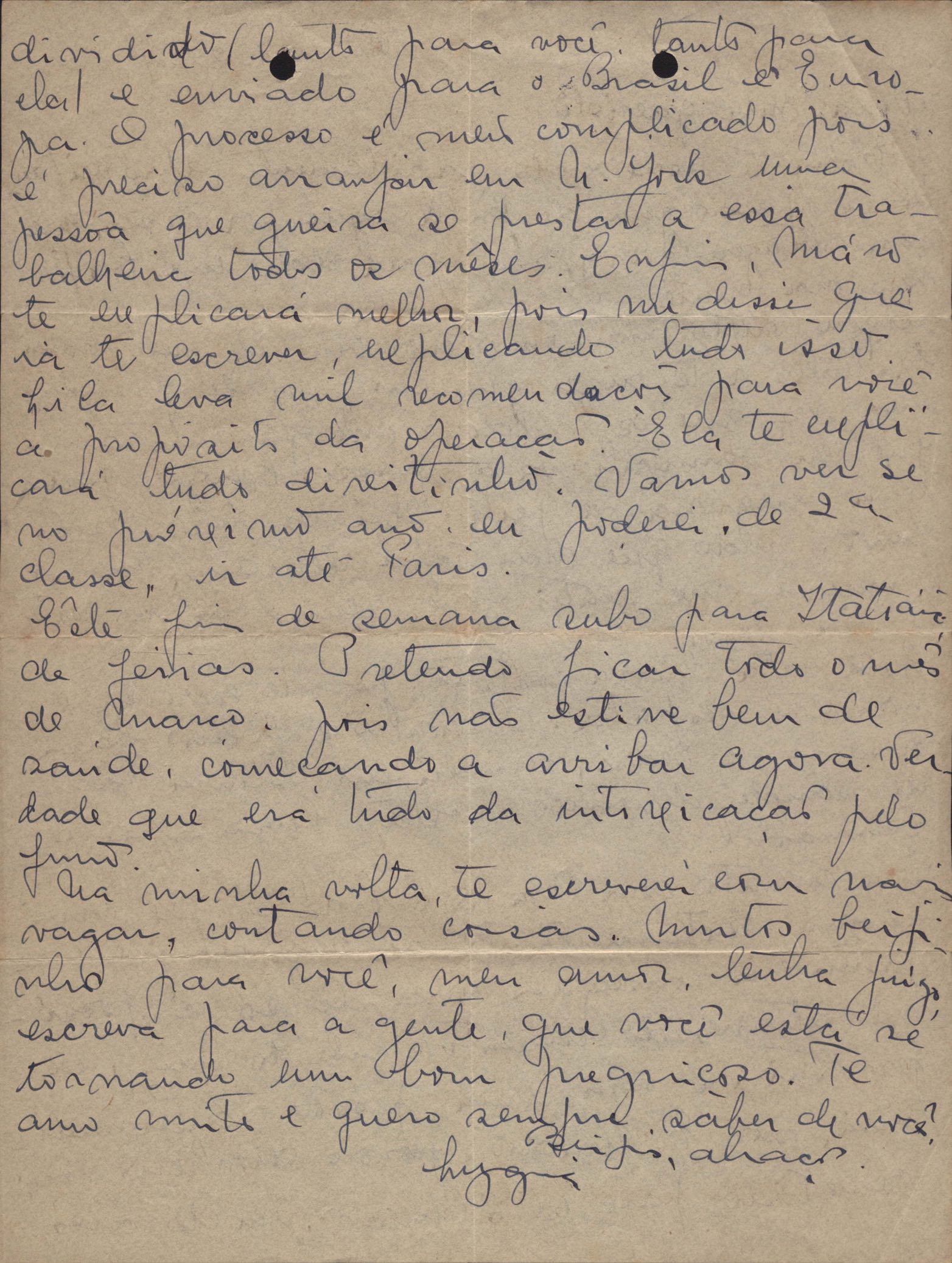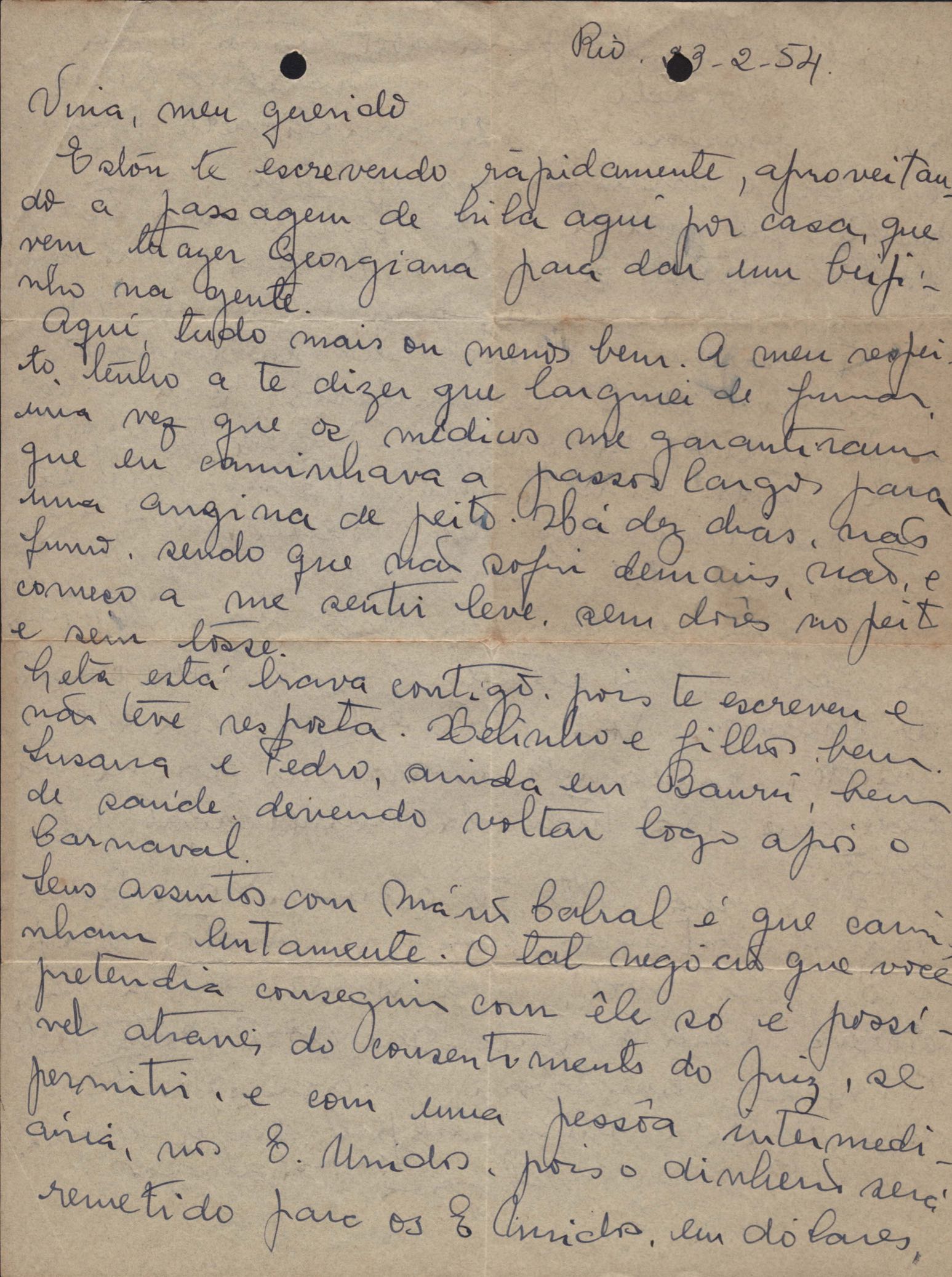Notícias sobre a vida familiar. Relatório da administração do dinheiro recebido por músicas e livros de VM. Notícias sobre a publicação de crônicas. Comentário sobre o recebimento de direitos autorais e de remuneração do Itamaraty a VM, no exercício de 1963. Notícias sobre o falecimento do escritor Aníbal Machado. Referência aos amigos Afonso Arinos, Agripino Grieco, Celso Souza e Silva, David Mourão Ferreira, Gessy Gesse, João Ribeiro, Manuel Bandeira, Mário Cabral, Nelson Rodrigues, Oscar Niemeyer, Paulo Carneiro, Peregrino Júnior e Peter Keller. Notícias sobre a vida pessoal e familiar. Comentário sobre negócios feitos. Intenção de (gravar) um disco/LP com seus poemas infantis. Referência à organização de seu arquivo pessoal, por sua irmã, Lygia Cruz de Moraes. Publicação de sua obra completa. Consideração a respeito do Festival de Cinema de Cannes. Envio, em anexo, de reportagem sobre VM no exterior. Autorização para sua irmã receber e administrar os recursos provenientes de sua pensão e de seus direitos autorais. Notícias de futuro retorno ao Brasil. Proibição de Pixinguinha para vender sua obra em parceria com VM. Referência a pessoas de sua amizade: Adolfo Bloch, Aníbal Machado, Antônio Bittencourt, Antônio Calado, Antônio Carlos Jobim, Carlos Lacerda, Carlos Ribeiro, Fernando Lobo, Fernando Sabino, Lima Duarte, Lúcia Magalhães, Lúcio Rangel, Mário Cabral, Nora Nei, Otávio Tirso, Pablo Neruda, Paulo Mendes Campos, Pedro Galloti, Waldemar Leite de Oliveira entre outros.