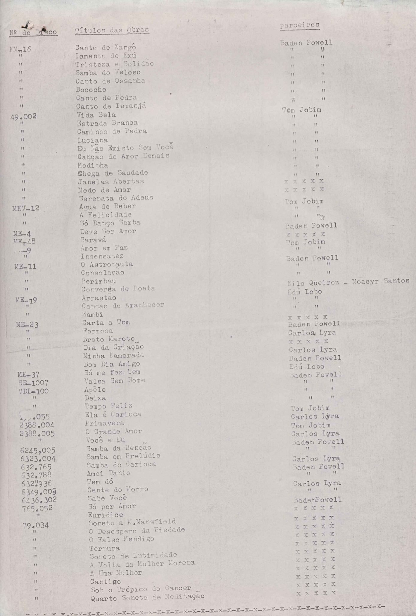 Lista com número de discos, títulos de obras e parceiros de VM. Fotocópia datilografada. Interesse na gravação de músicas de VM. Pedido de confirmação de autoria e parceria das músicas, para futuro pagamento de direitos autorais.