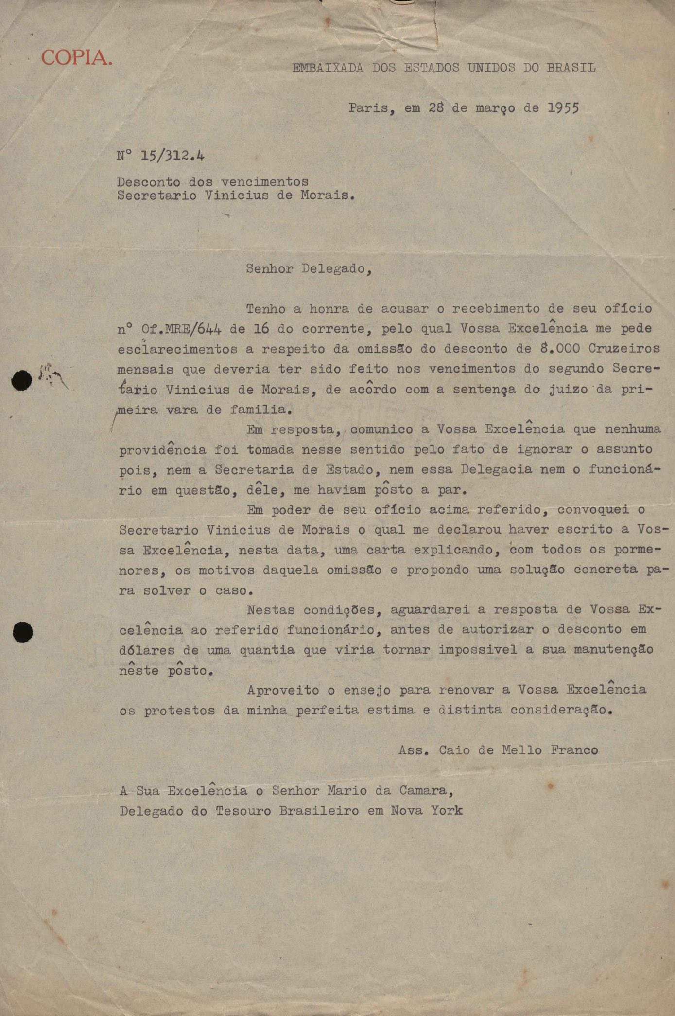 Ofício a Mário da Câmara (Delegado do Tesouro Brasileiro em Nova Iorque)
