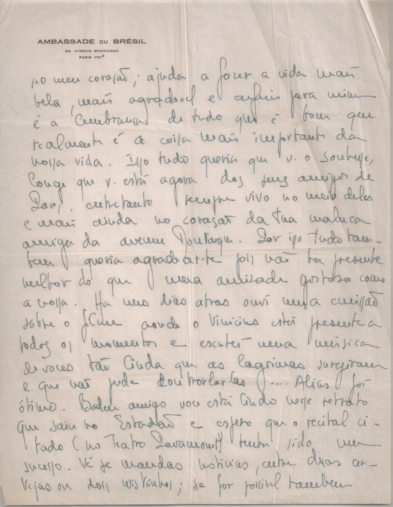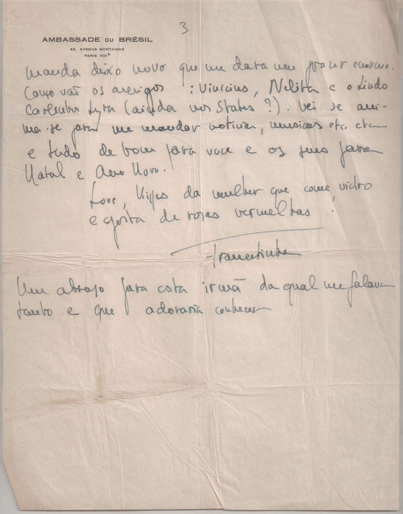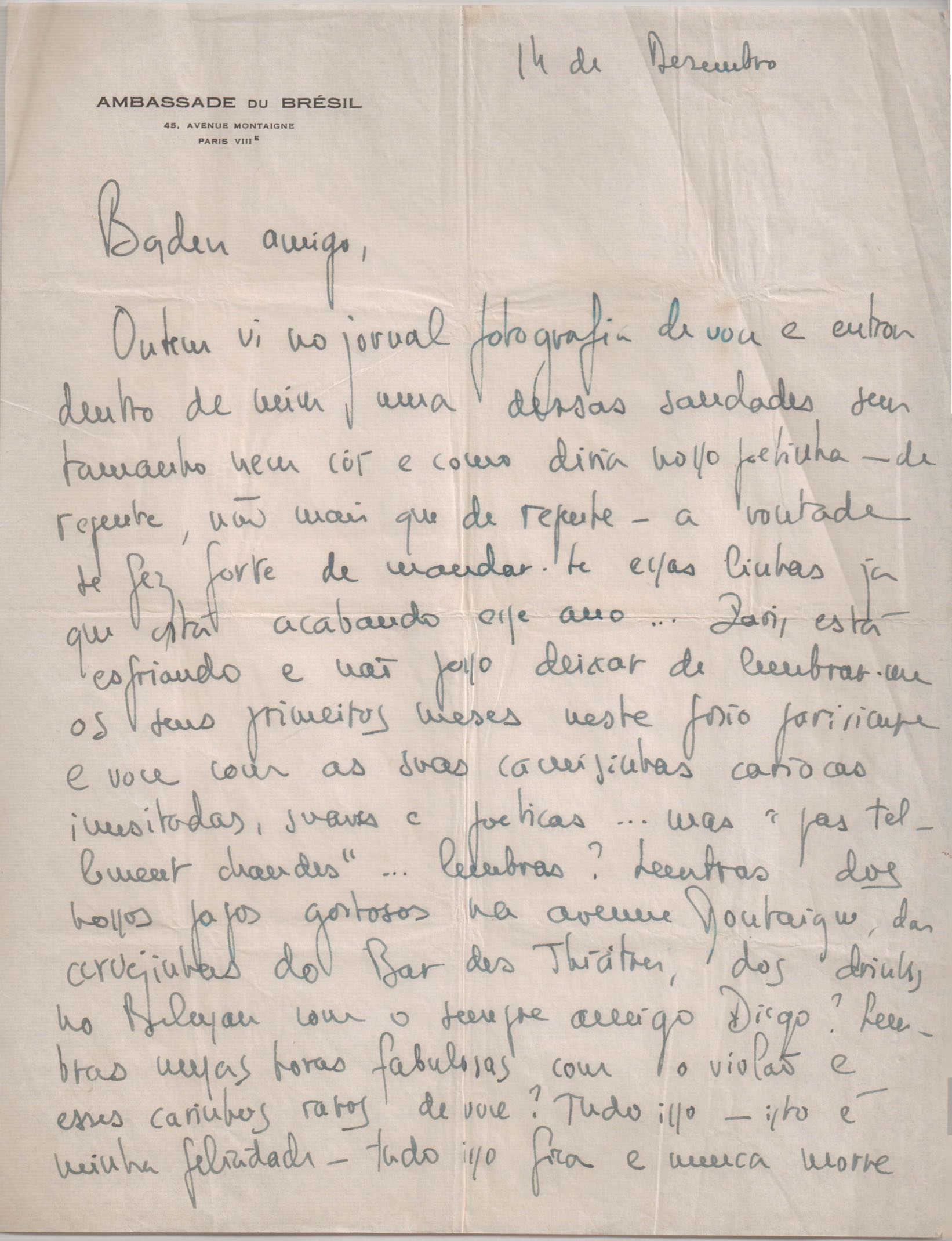 Notícias sobre a vida pessoal. Comentário sobre amigos: VM, Nelita de Abreu Rocha e Carlos Lyra. Votos de boas-festas. Solicitação de notícias e envio de músicas.