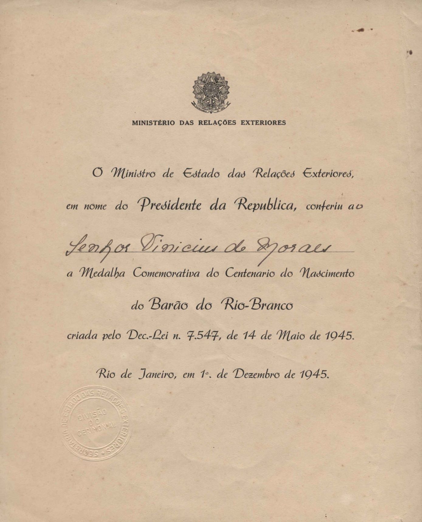 Certificado da medalha comemorativa do Centenário do Nascimento do Barão do Rio Branco, conferida pelo Ministério das Relações Exteriores a VM.