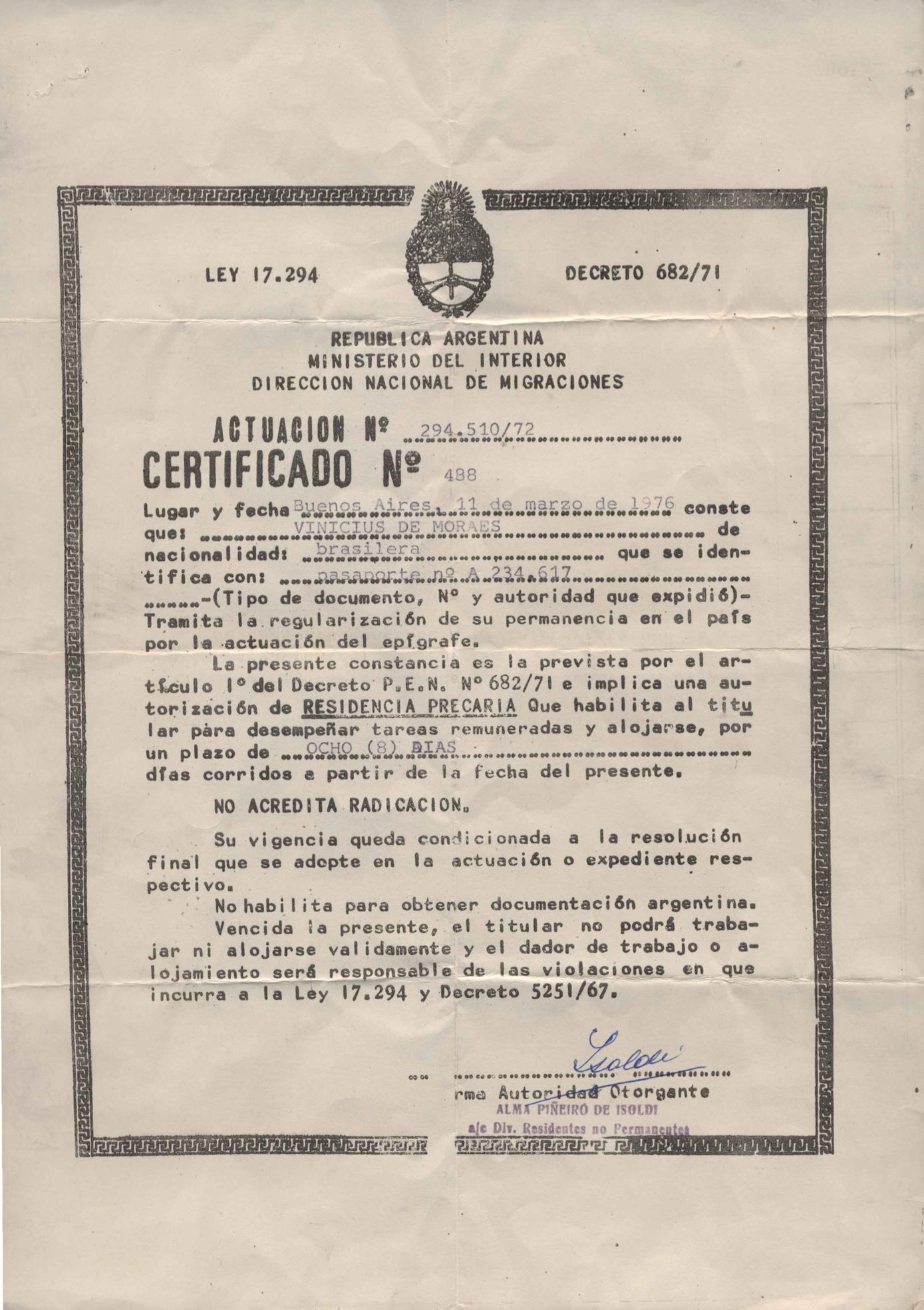 Certificado nº 488 concedido pela República Argentina - Ministerio del Interior / Dirección Nacional de Migraciones, de permanência provisória em Buenos Aires de VM.