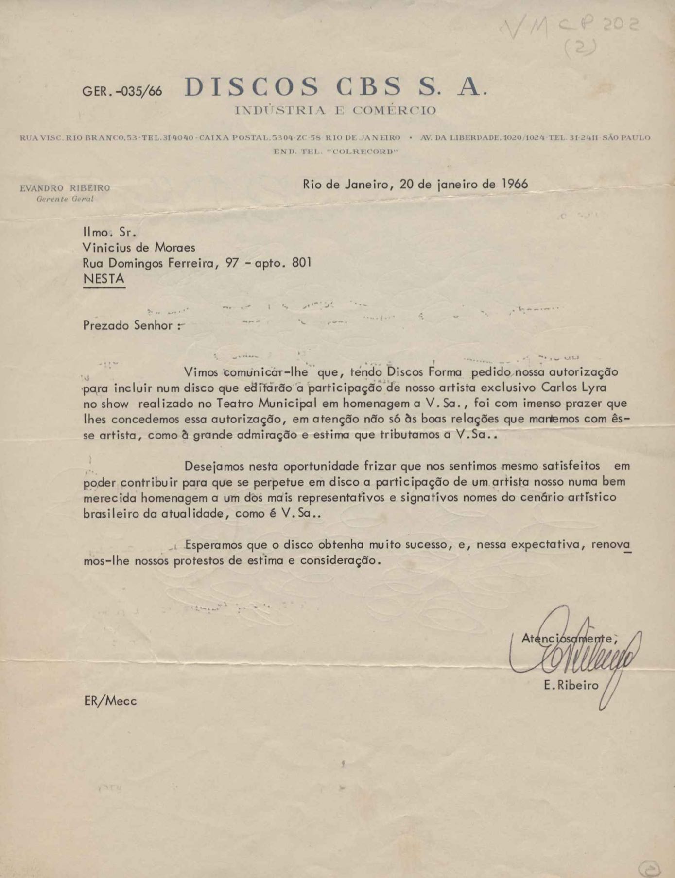 Autorização para Carlos Lyra interpretar peças de VM a serem editadas pela etiqueta Forma. Comentários sobre homenagem recebida por VM em 15 dez. 1965.