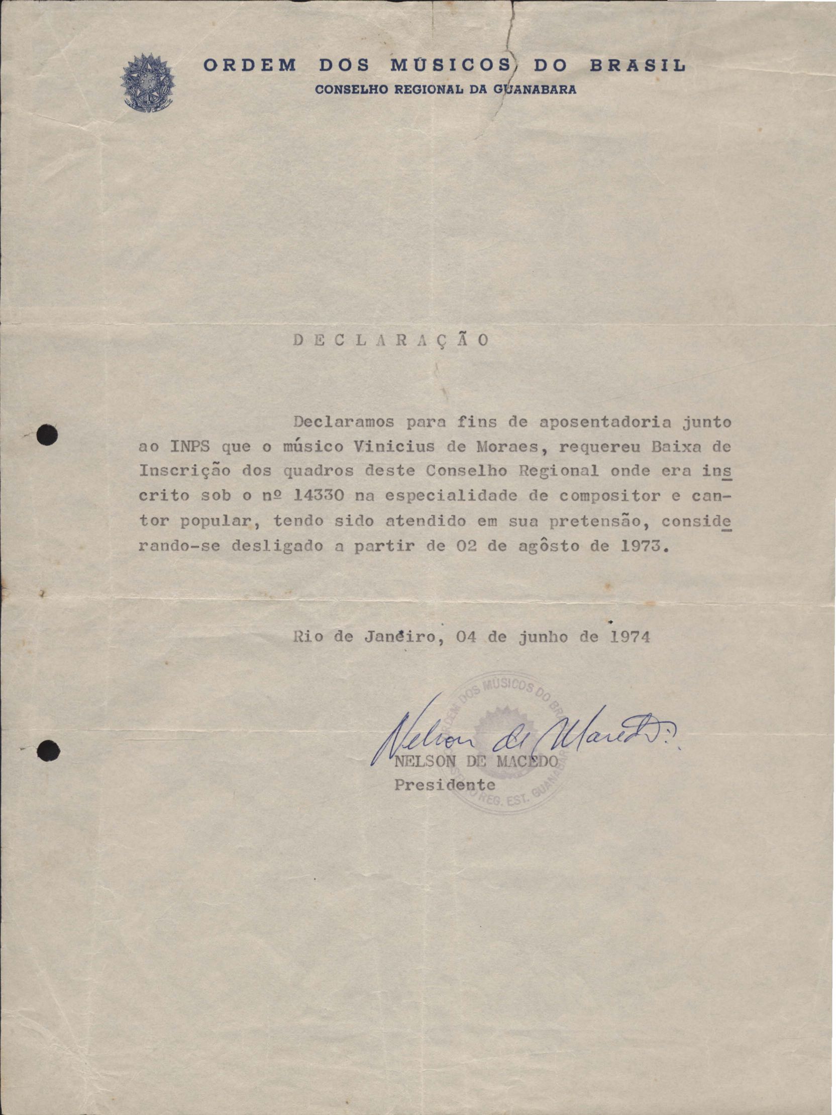 Declaração para fins de aposentadoria junto ao INPS. Emissão da Ordem dos Músicos do Brasil.