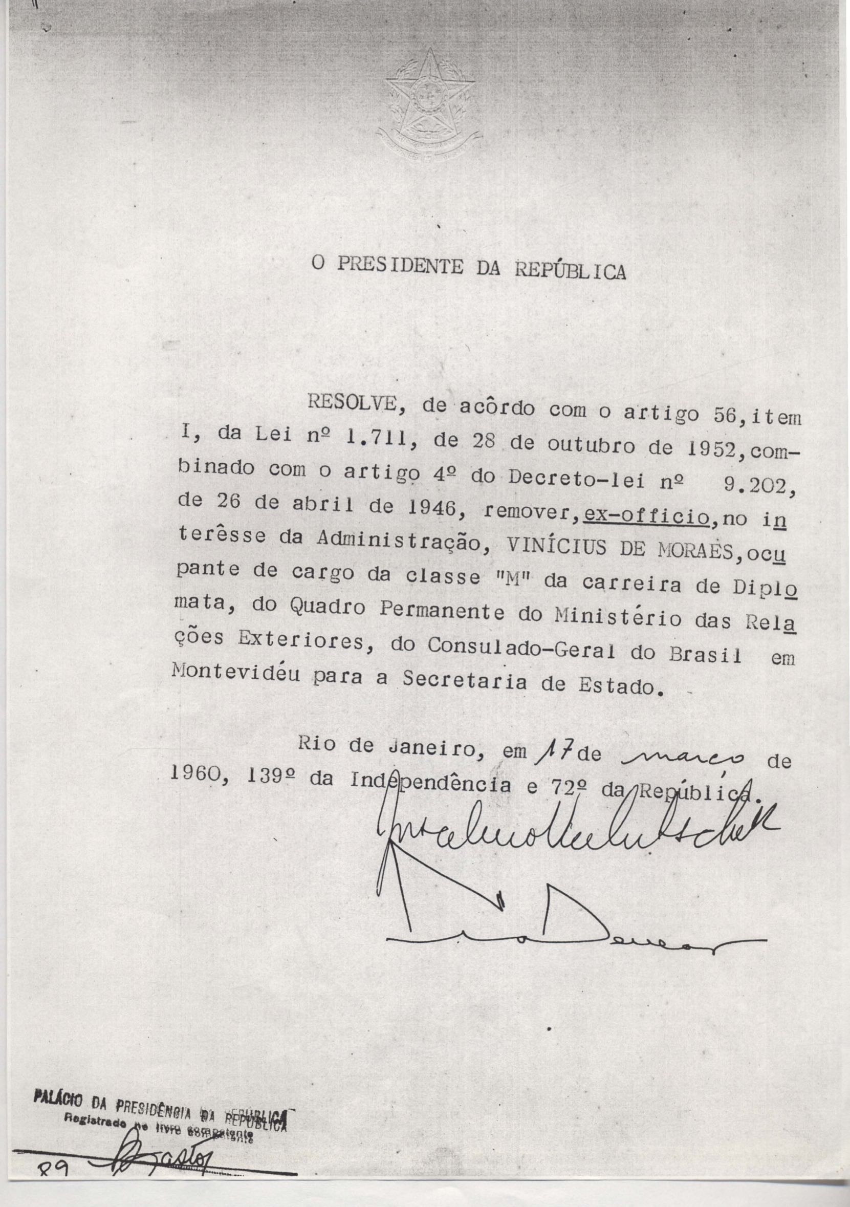 VM é transferido do cargo de classe "M" da carreira diplomática, do quadro permanente do Ministério das Relações Exteriores em Montevidéu, para a Secretaria do Estado do Rio de Janeiro.